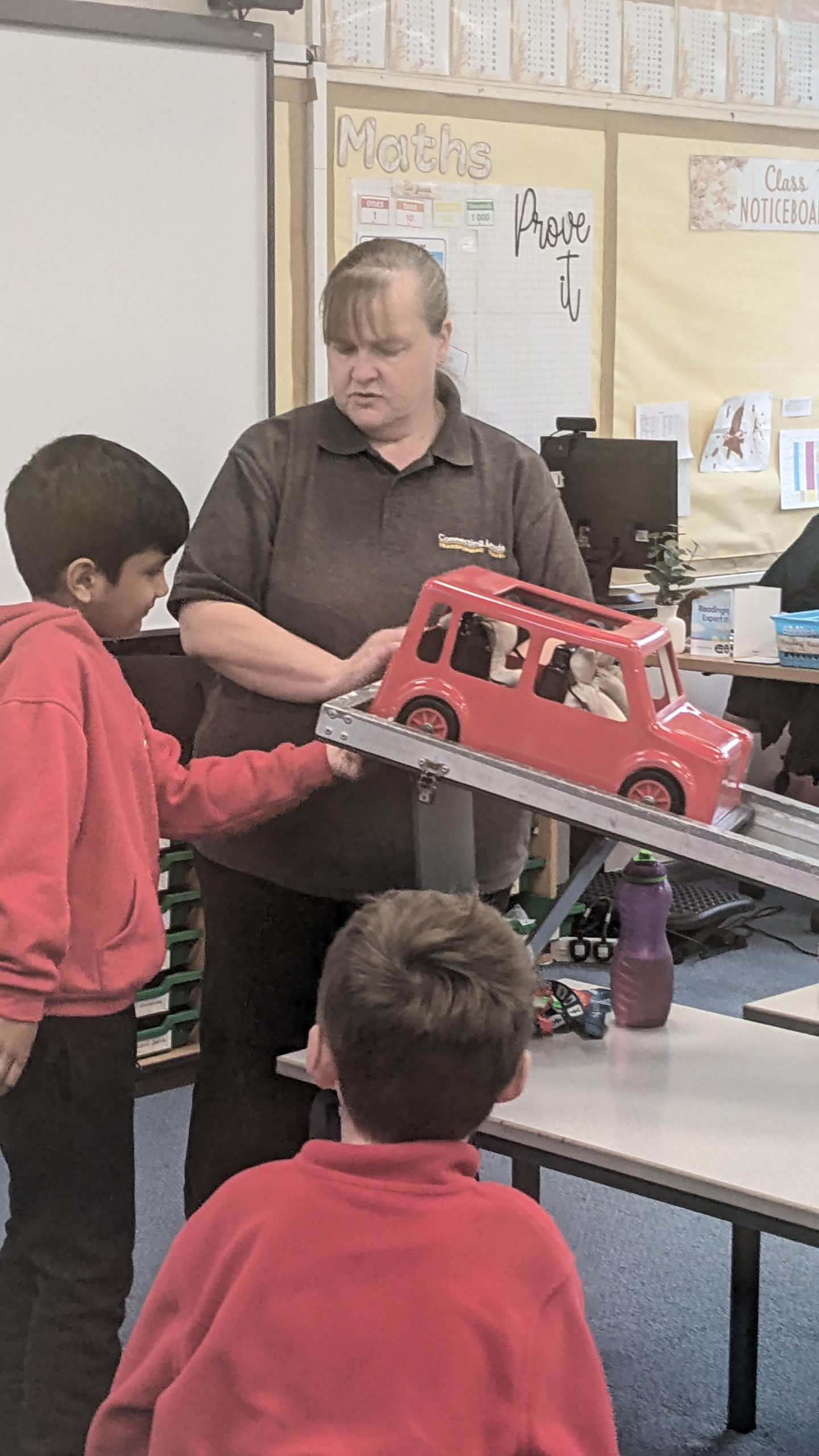 On Wednesday, Year 3 had a lesson on road safety delivered by Road Safety trainers. It began with a catapult and a small ball, and children had to predict what would happen when it was released. As expected, the ball went quite far. They then discussed ways to prevent this from happening, and with some measures in place when rereleased, the ball remained in the same place. This then moved on to using a smaller car to scale with dummies inside. A ramp was used to demonstrate the impact on dummies when they rolled down the ramp without a seatbelt. Children took a close look inside and then shared the injuries they thought the dummies might have after this ‘accident’. They then watched this happen again, but this time with a seatbelt. We ended the session by sharing the importance of wearing a seatbelt.