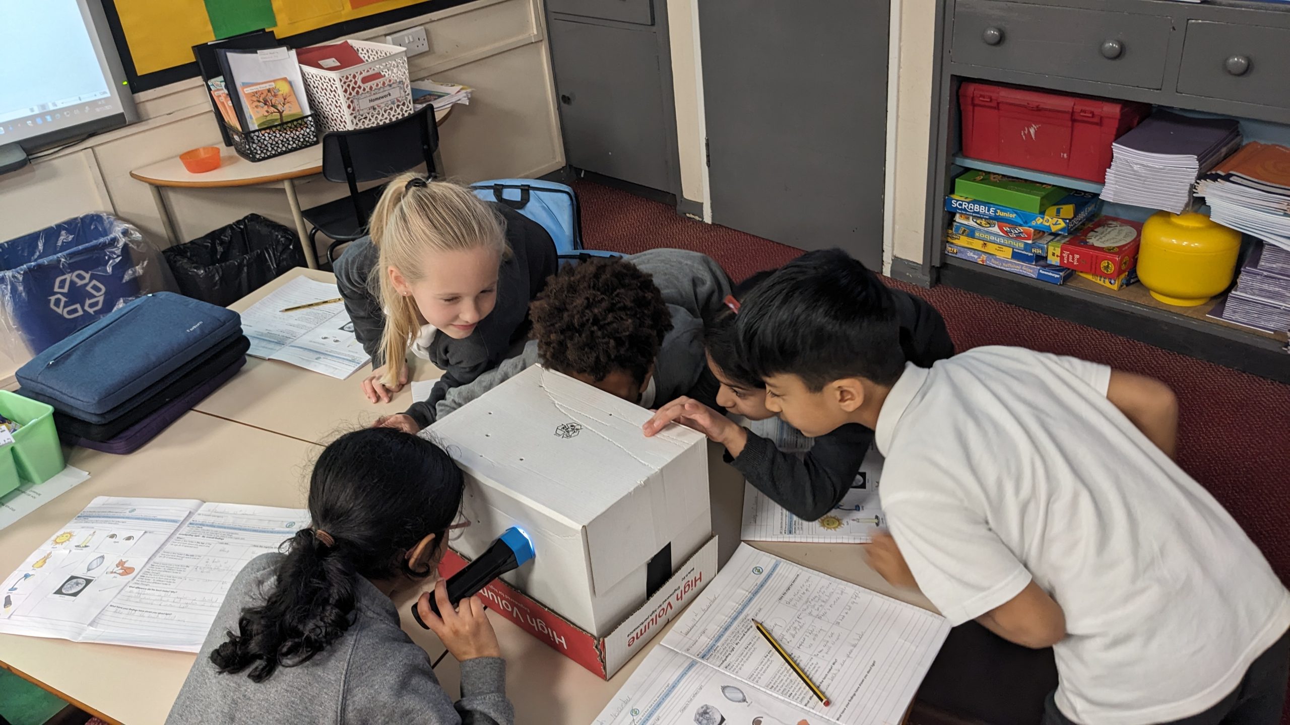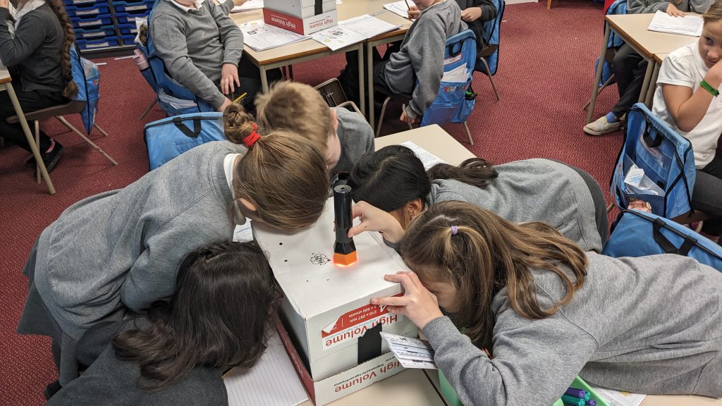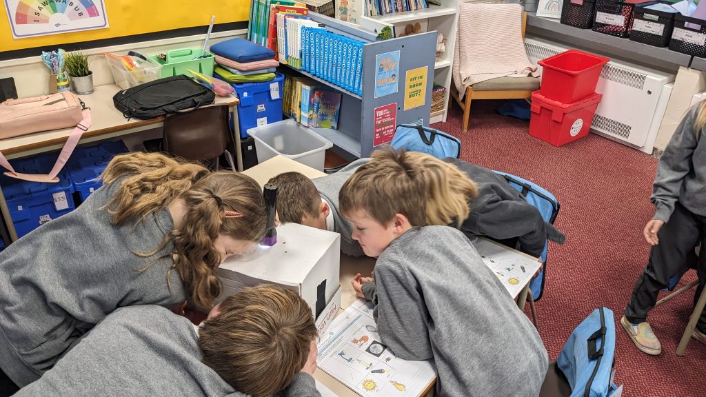 Our science unit, all about Light and Dark, fits in perfectly with this season. Children made small holes on different sides of boxes and tried their best to identify where the light was coming from and what they could see. They realised that the light was limited and it didn’t allow them to see everything in the box. After making more holes and noting their observations and class discussions, most children concluded that light travels in a straight line, since they could only see what was directly below the light.