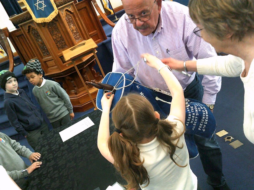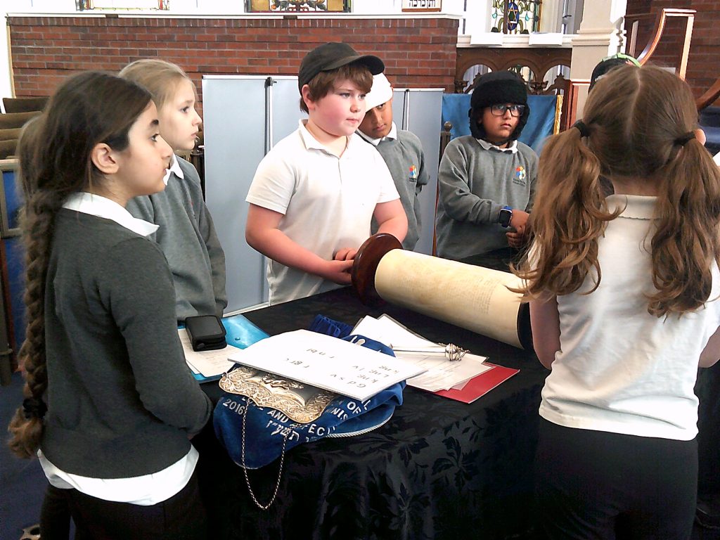 The children were then able to see a Torah scroll up close and learn more about it! They learnt that the scrolls are all written by hand by a scribe, and it takes about a year to write each one. Some children helped to remove and put on the Torah’s cover too, which includes lots of important objects, including bells which hang from ornamental finials, a breastplate and a yad (the pointer with which people read from the Torah with). The children also learnt that nobody is ever allowed to touch the parchment on which the Torah is written as it is so special.