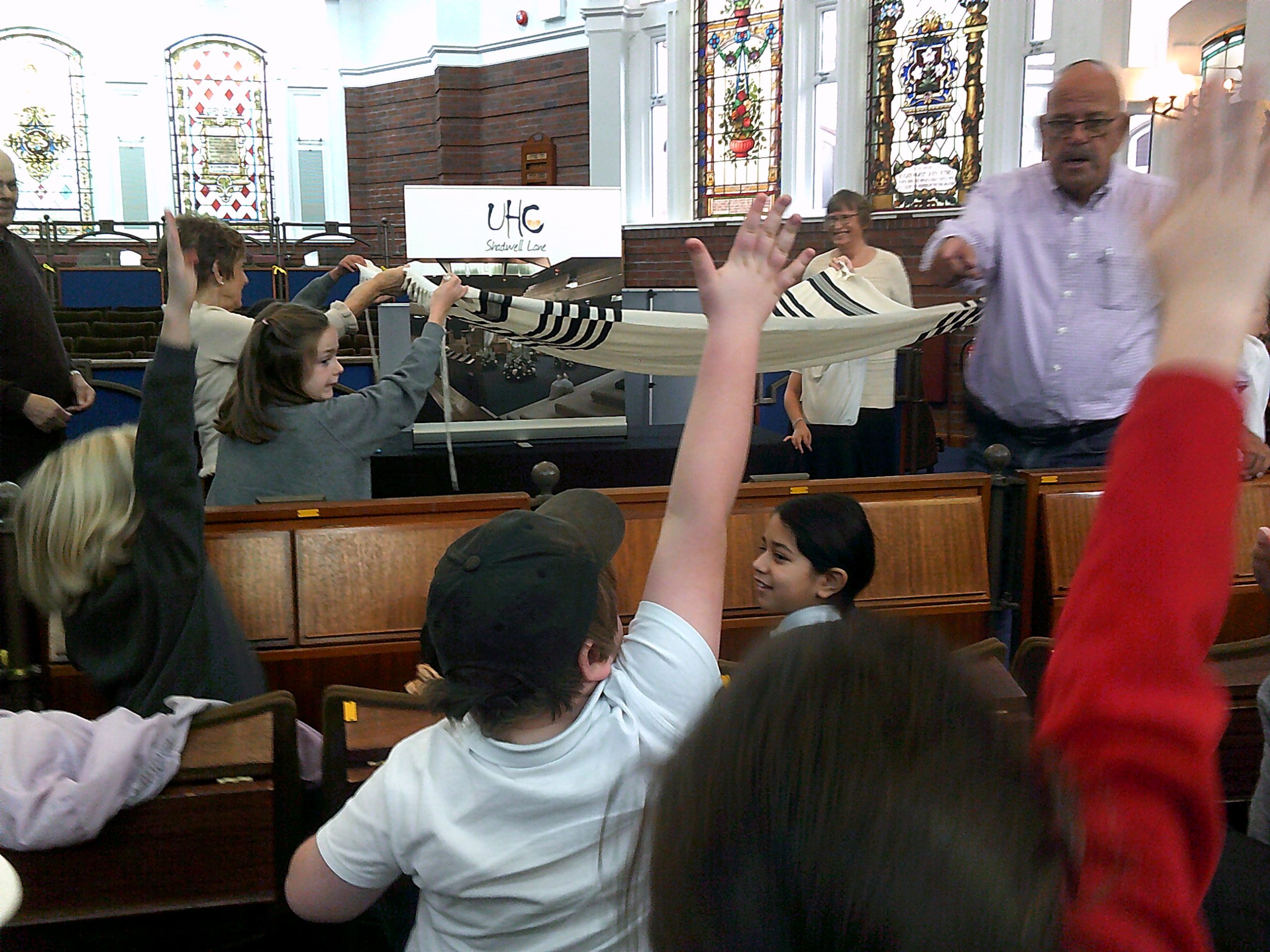 The children were then able to see a Torah scroll up close and learn more about it! They learnt that the scrolls are all written by hand by a scribe, and it takes about a year to write each one. Some children helped to remove and put on the Torah’s cover too, which includes lots of important objects, including bells which hang from ornamental finials, a breastplate and a yad (the pointer with which people read from the Torah with). The children also learnt that nobody is ever allowed to touch the parchment on which the Torah is written as it is so special.