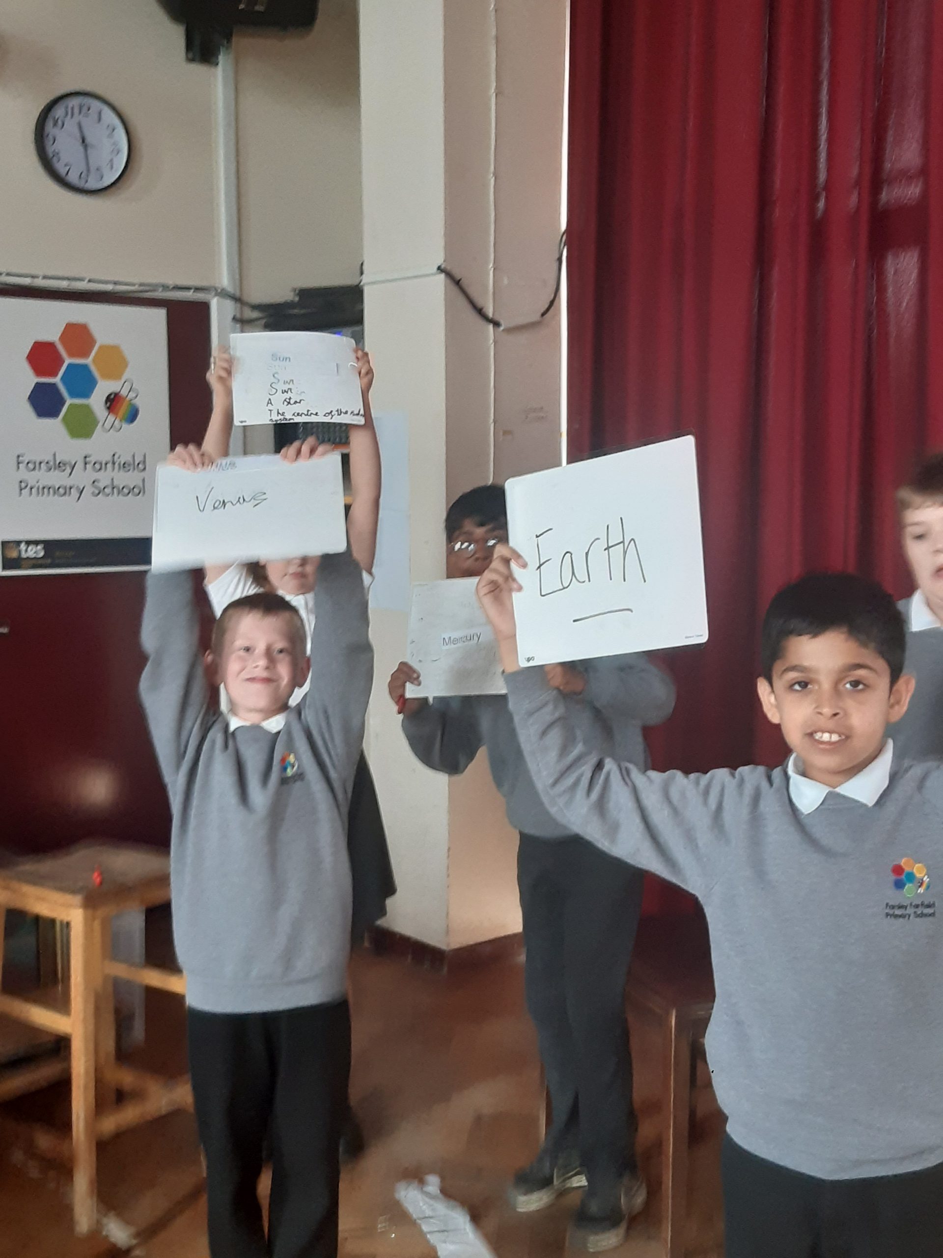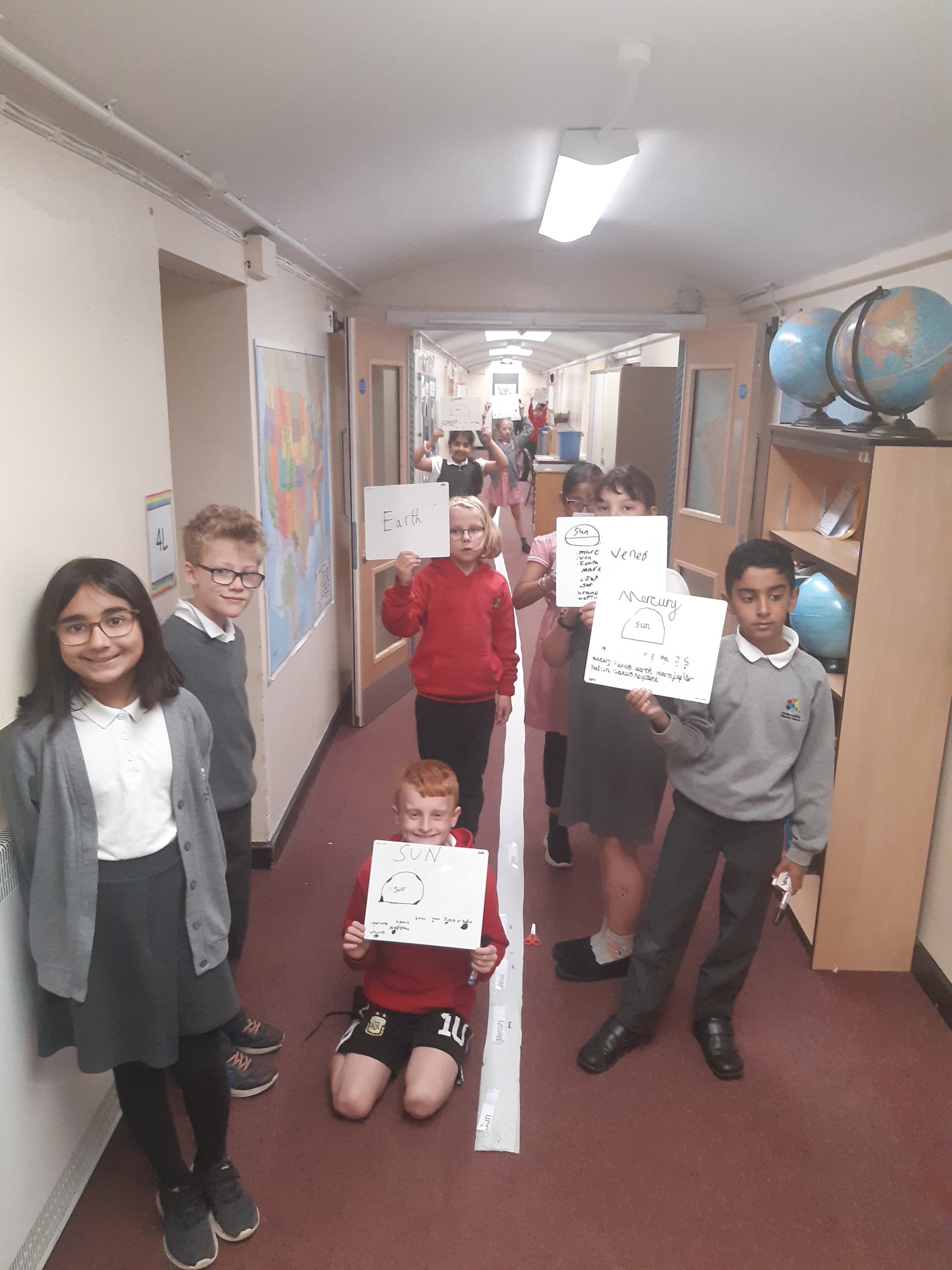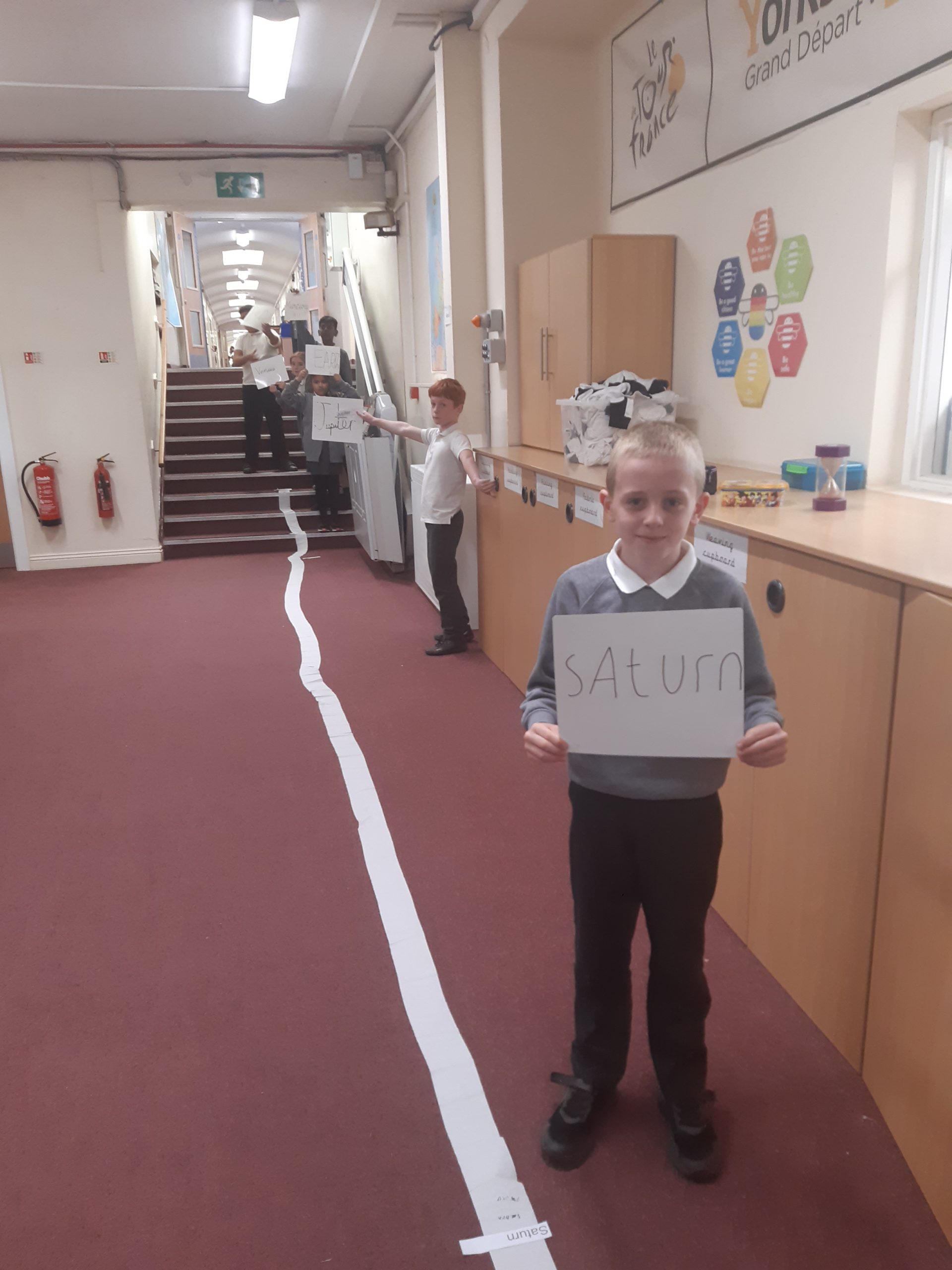 In Science we had lots of fun scaling the solar system. We spaced out the planets on a scale of 1:20,000,000km on some toilet role. We learnt that the first 4 planets up to Mars are much closer than the outer planets in our solar system. We learnt that the outer planets are mainly made of gas and that Jupiter is the largets planet. We also found out how massive the sun is in comparison to the other planets.
