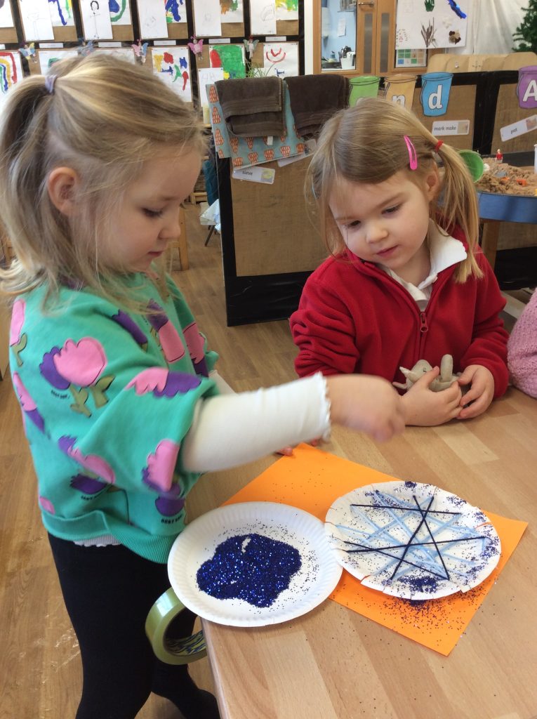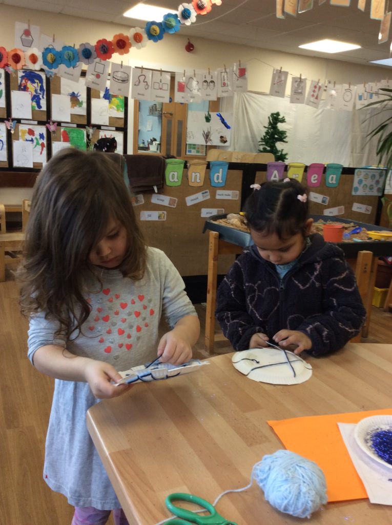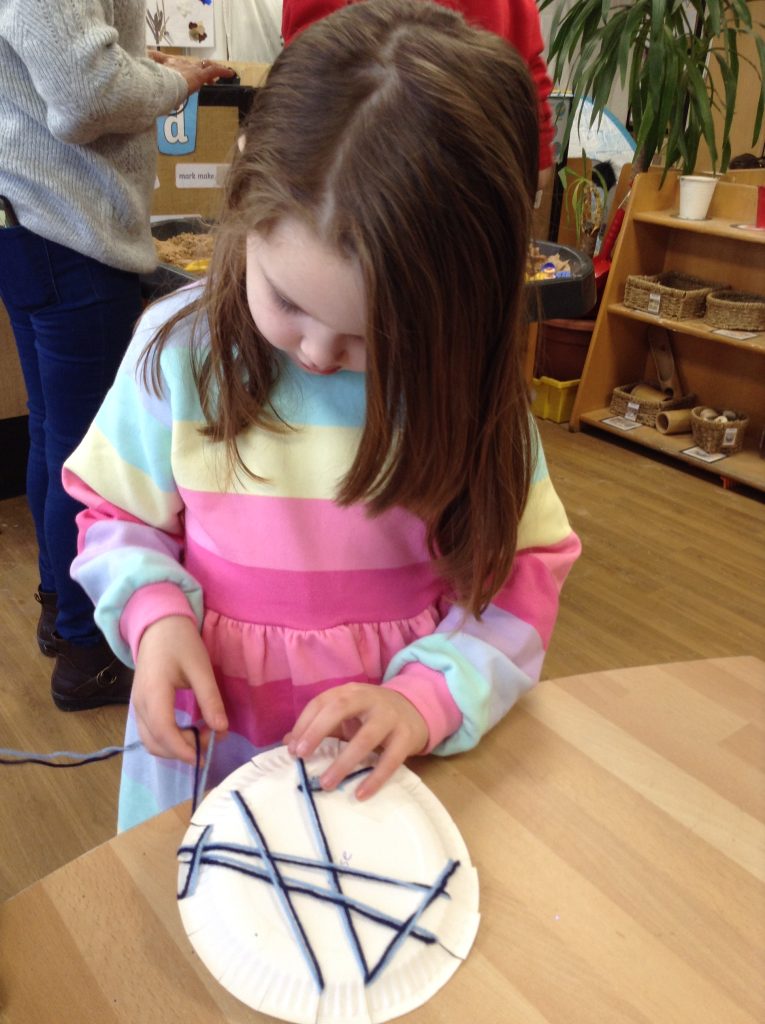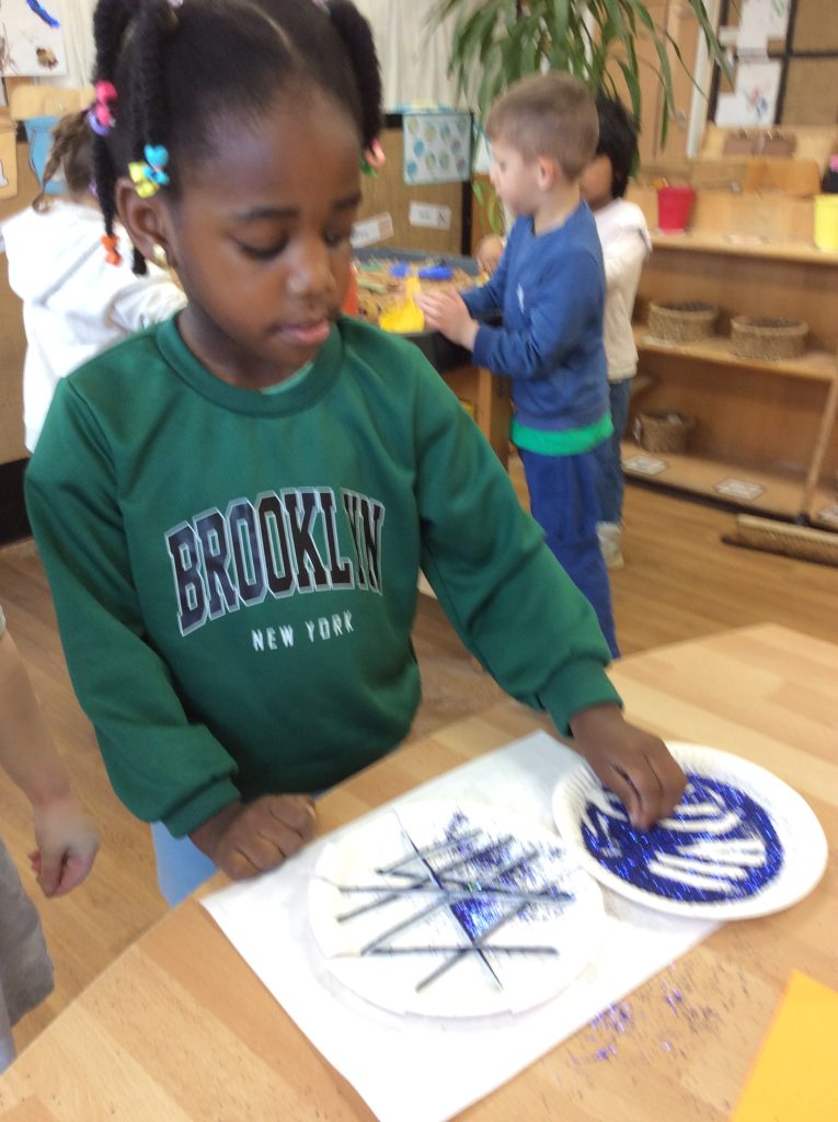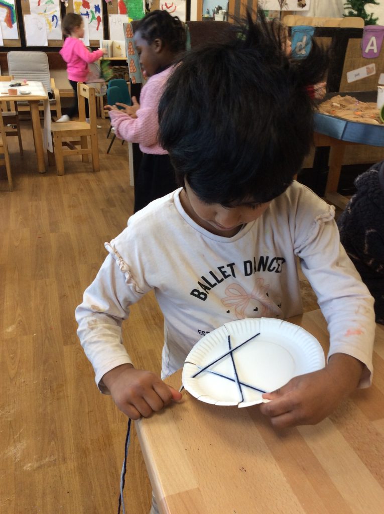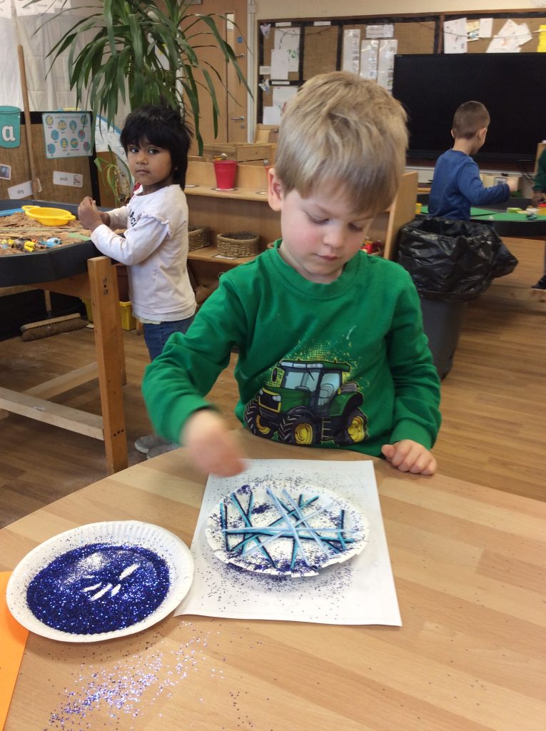 The children have been busy making beautiful snowflakes for our winter area. They wrapped wool around a plate and added glitter for a touch of shimmer.