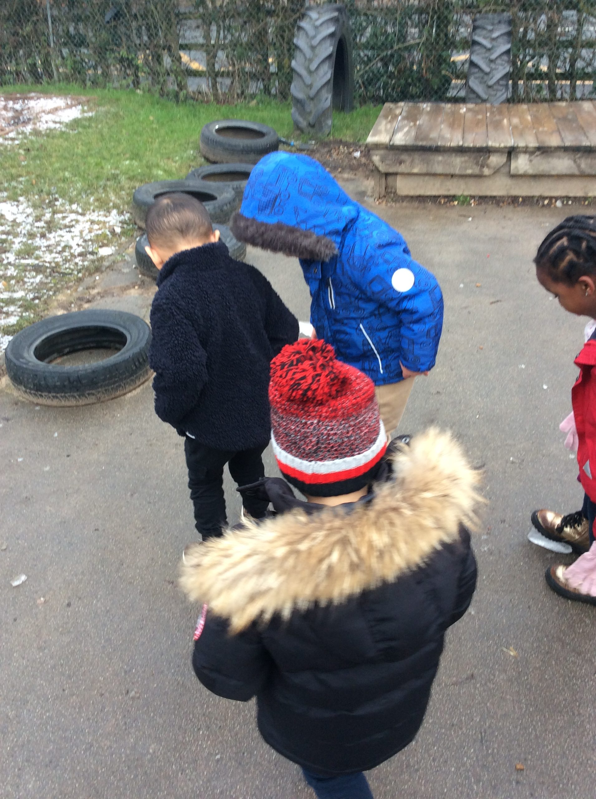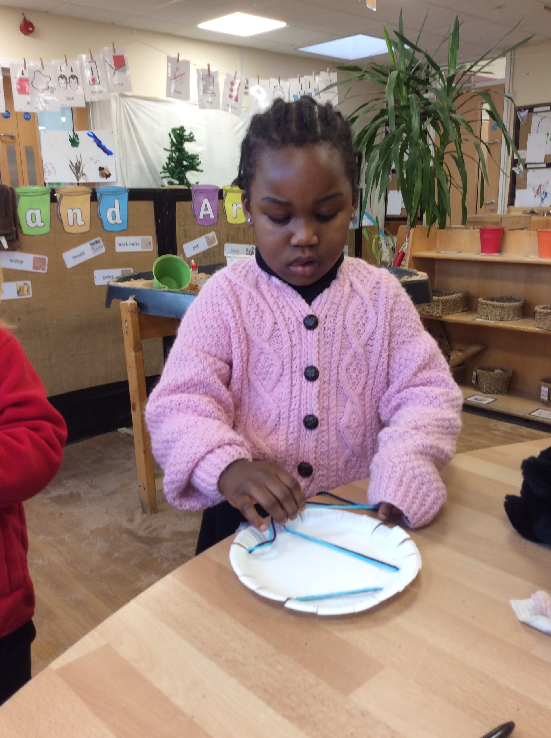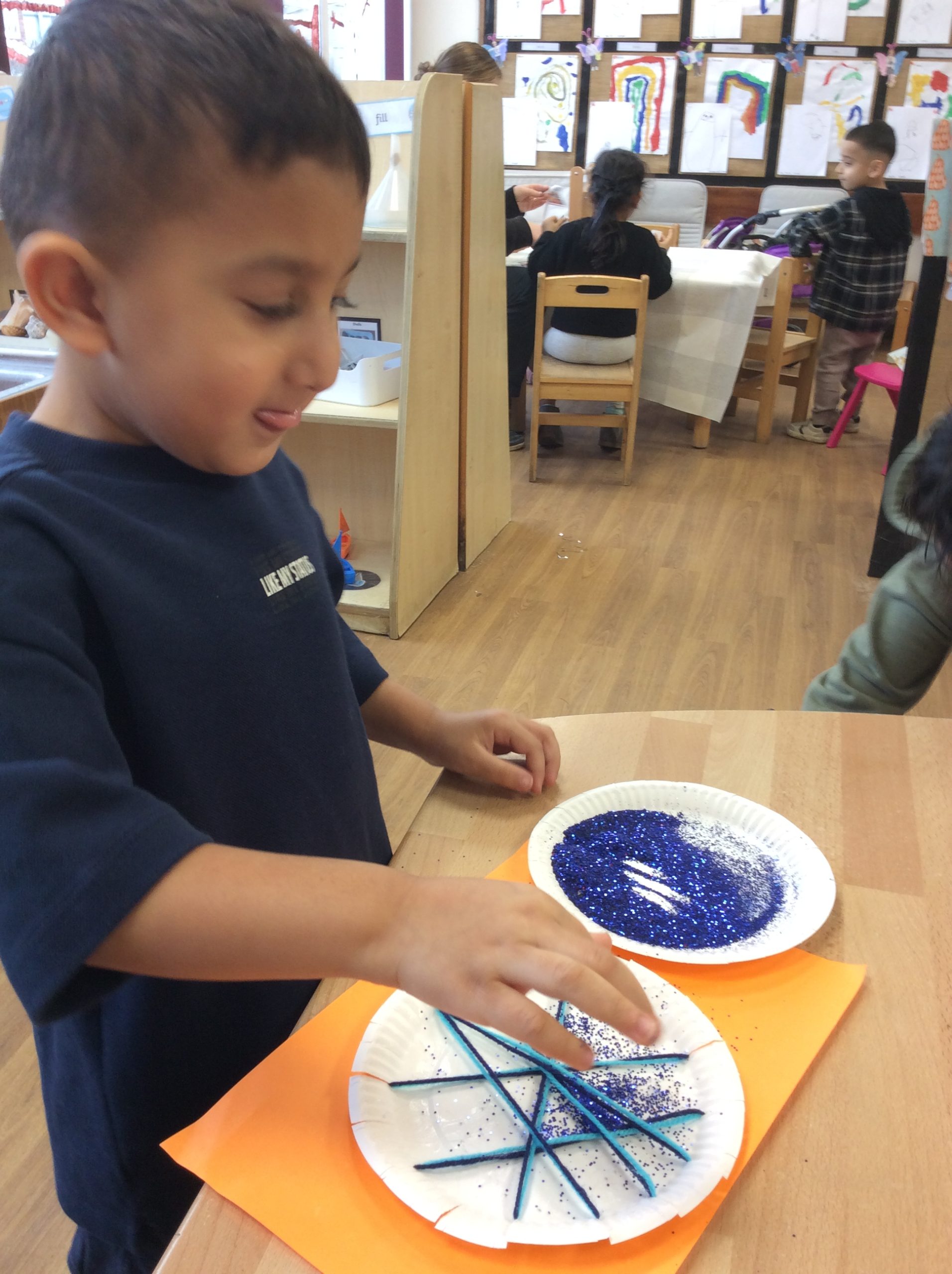 The children have been busy making beautiful snowflakes for our winter area. They wrapped wool around a plate and added glitter for a touch of shimmer.