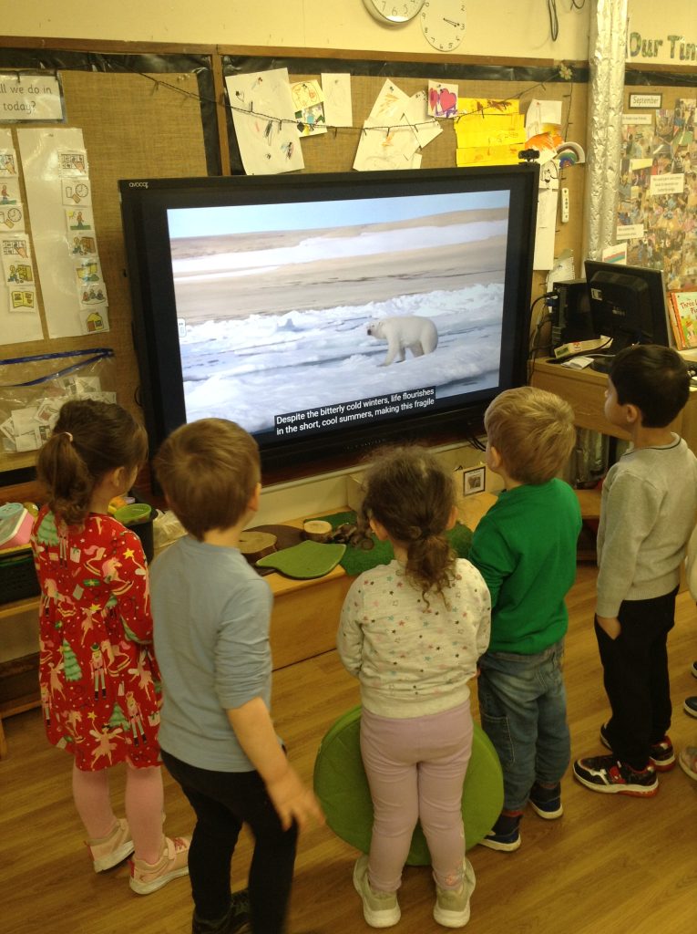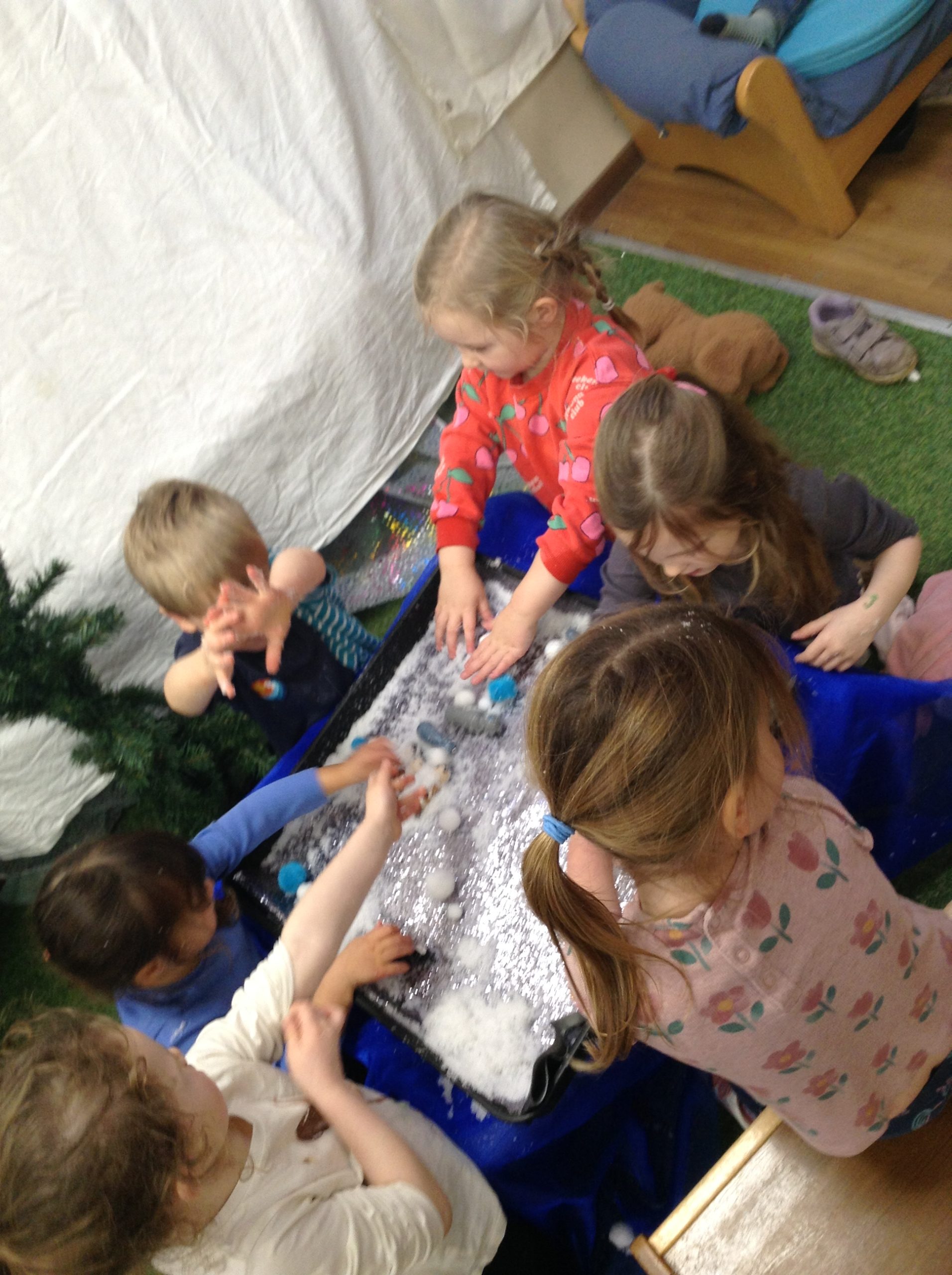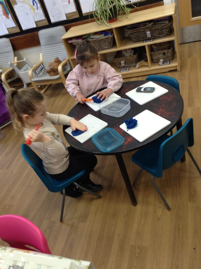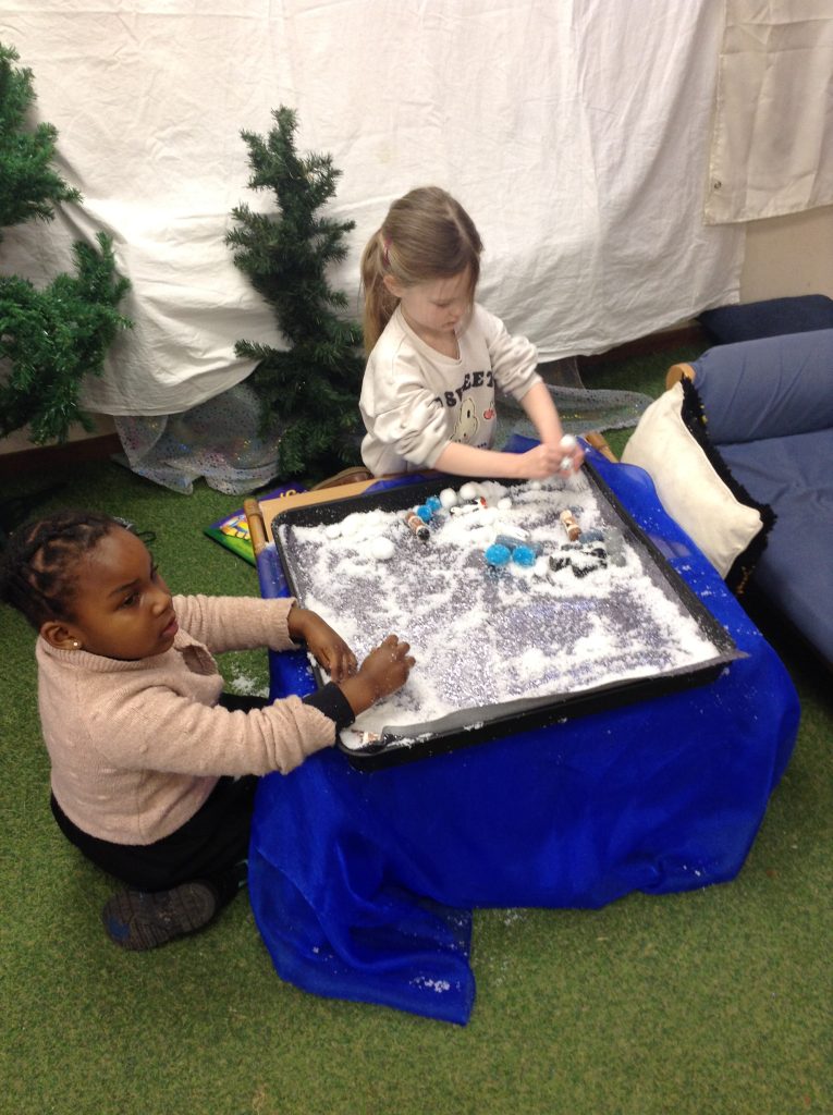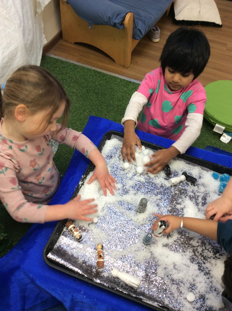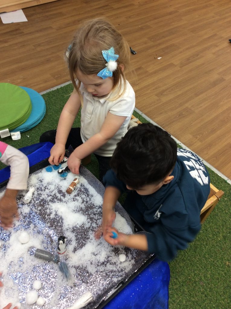 This week, the children explored ‘cool’ colours and mixed powder paint to create various shades of blue. We will continue this activity next week. They also examined ‘snow’ in a tray and learned about animals that inhabit snowy environments. We have also continued with many of our usual activities.