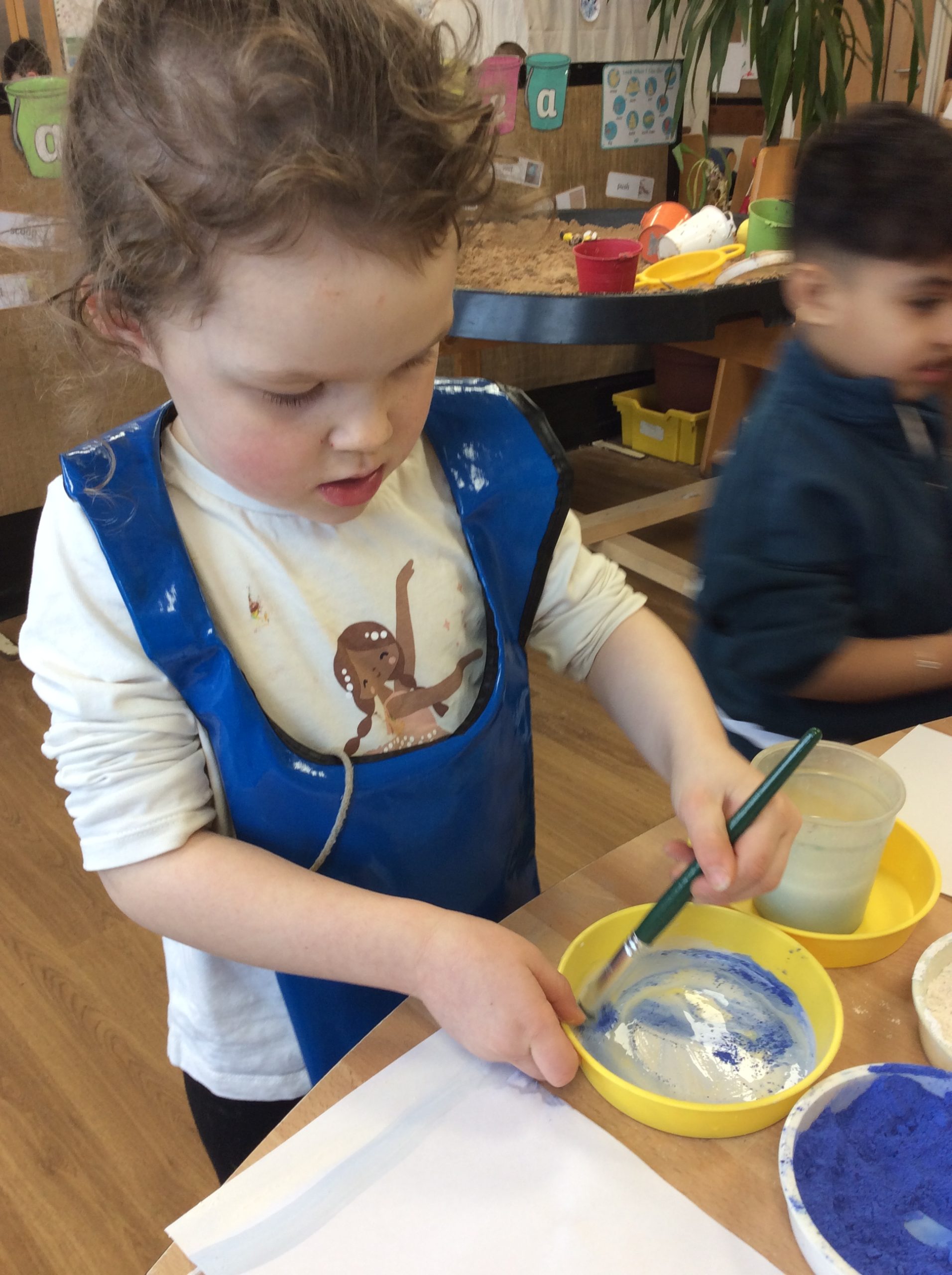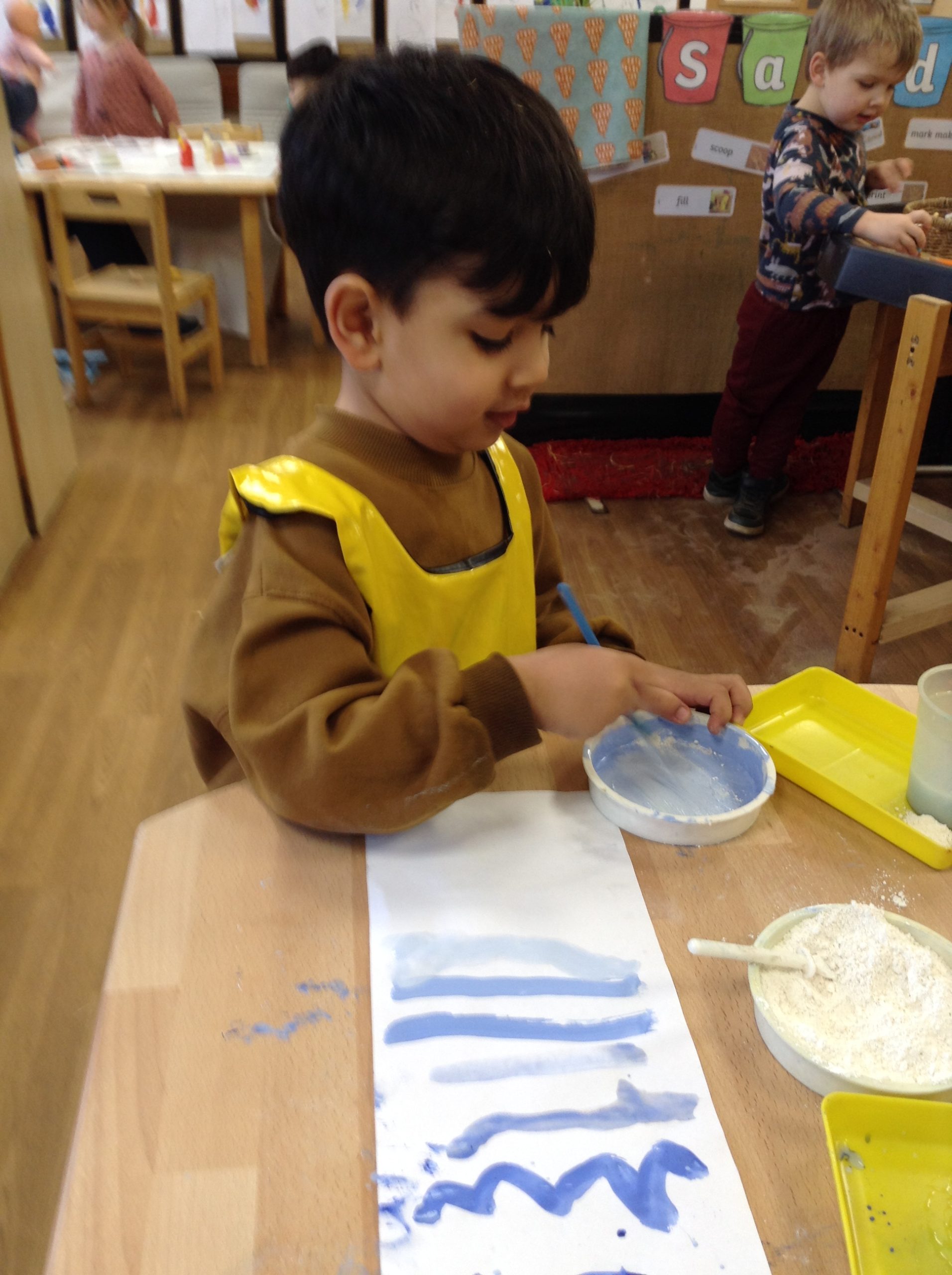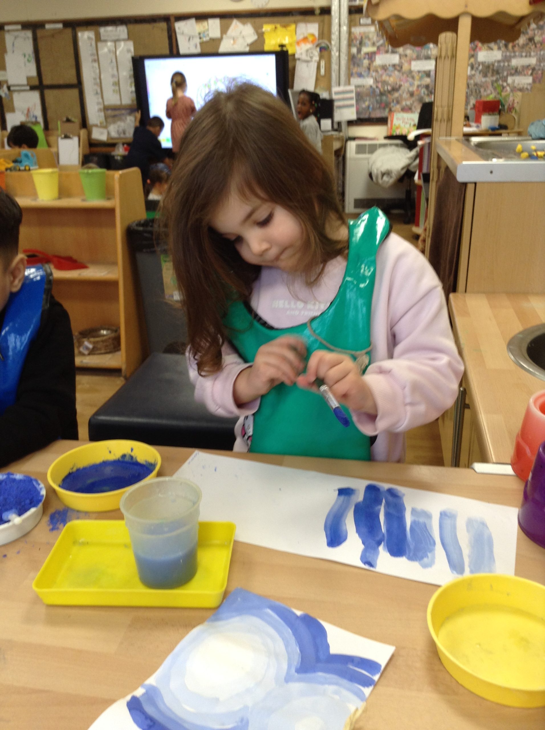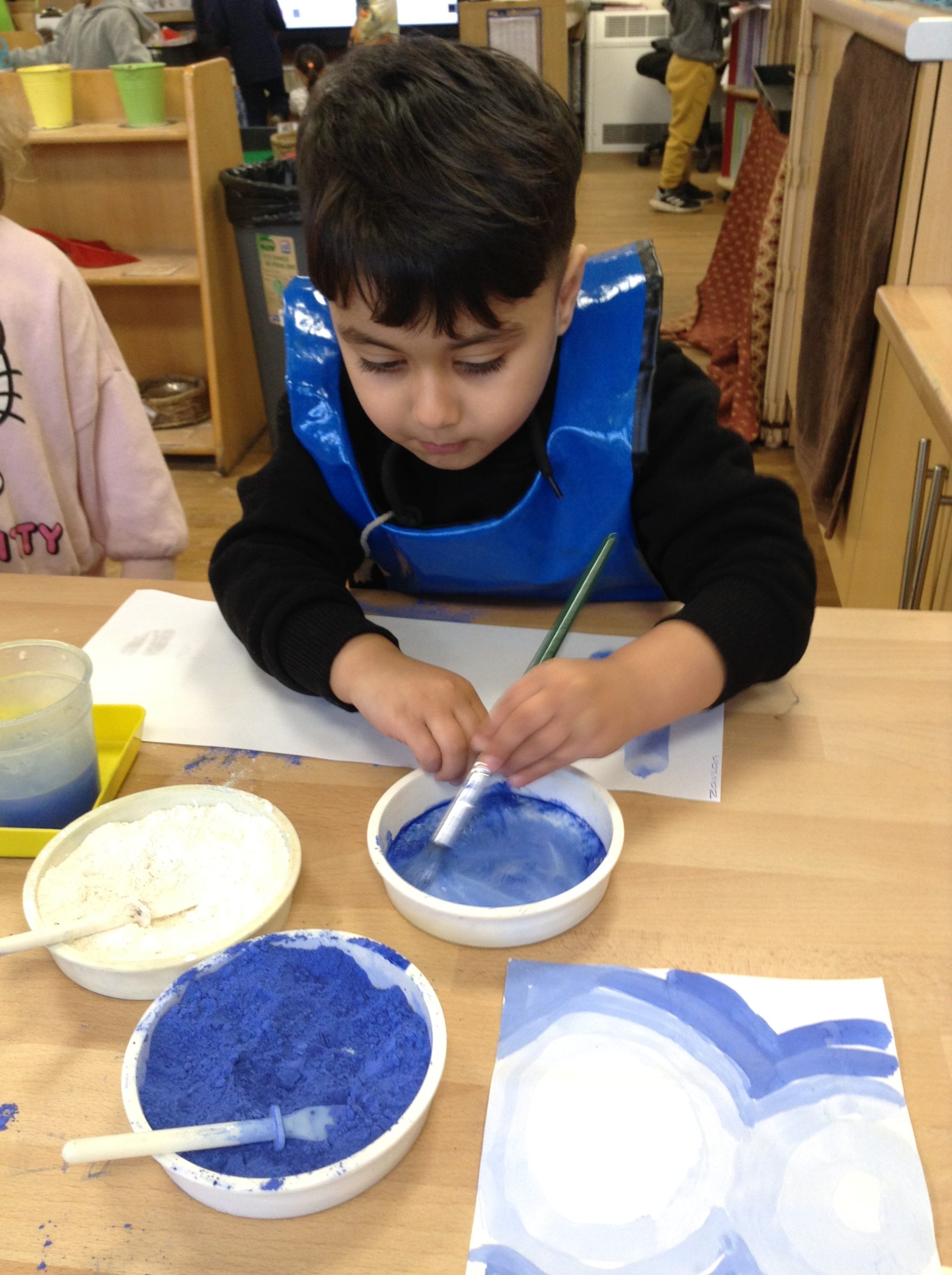 This week, the children explored ‘cool’ colours and mixed powder paint to create various shades of blue. We will continue this activity next week. They also examined ‘snow’ in a tray and learned about animals that inhabit snowy environments. We have also continued with many of our usual activities.