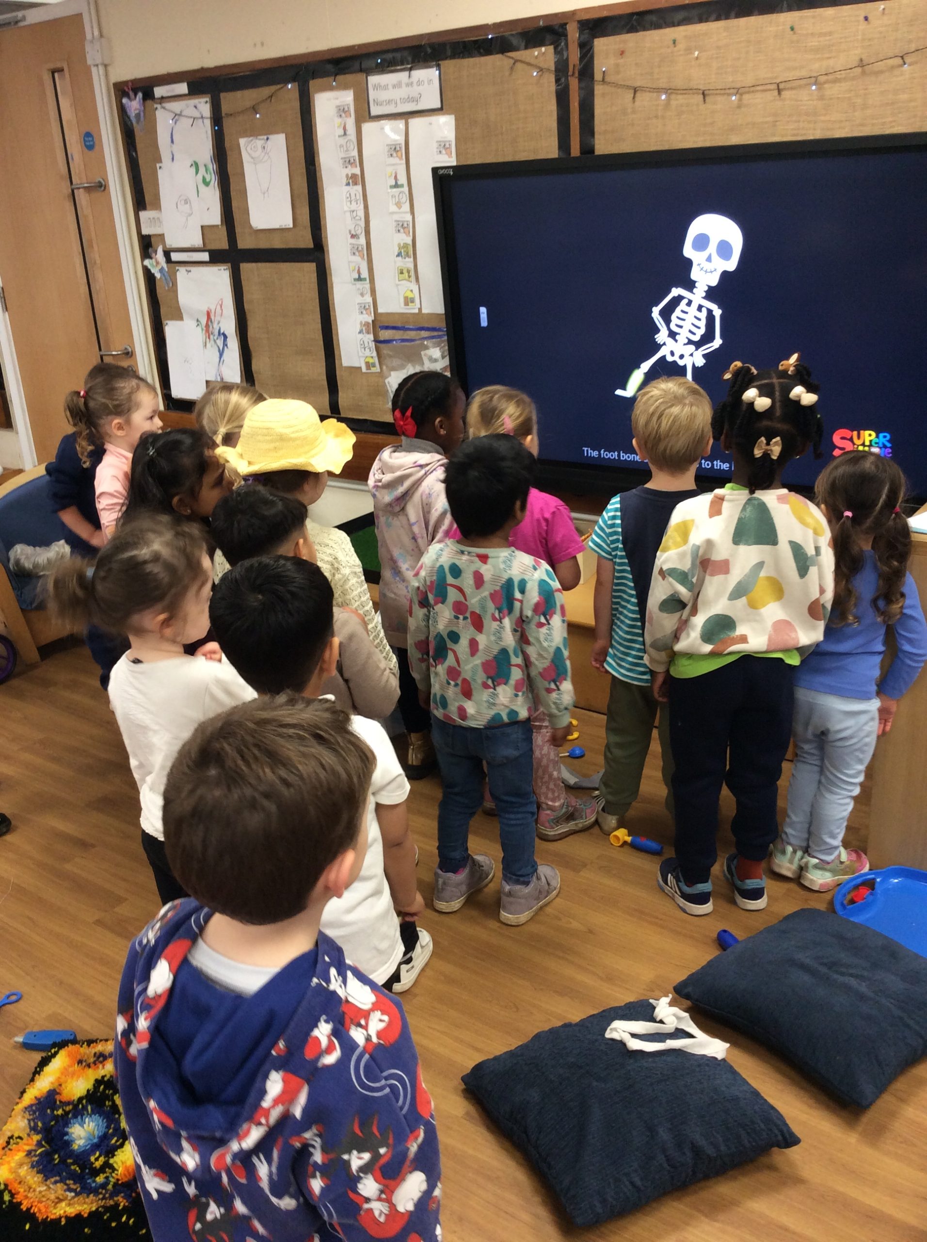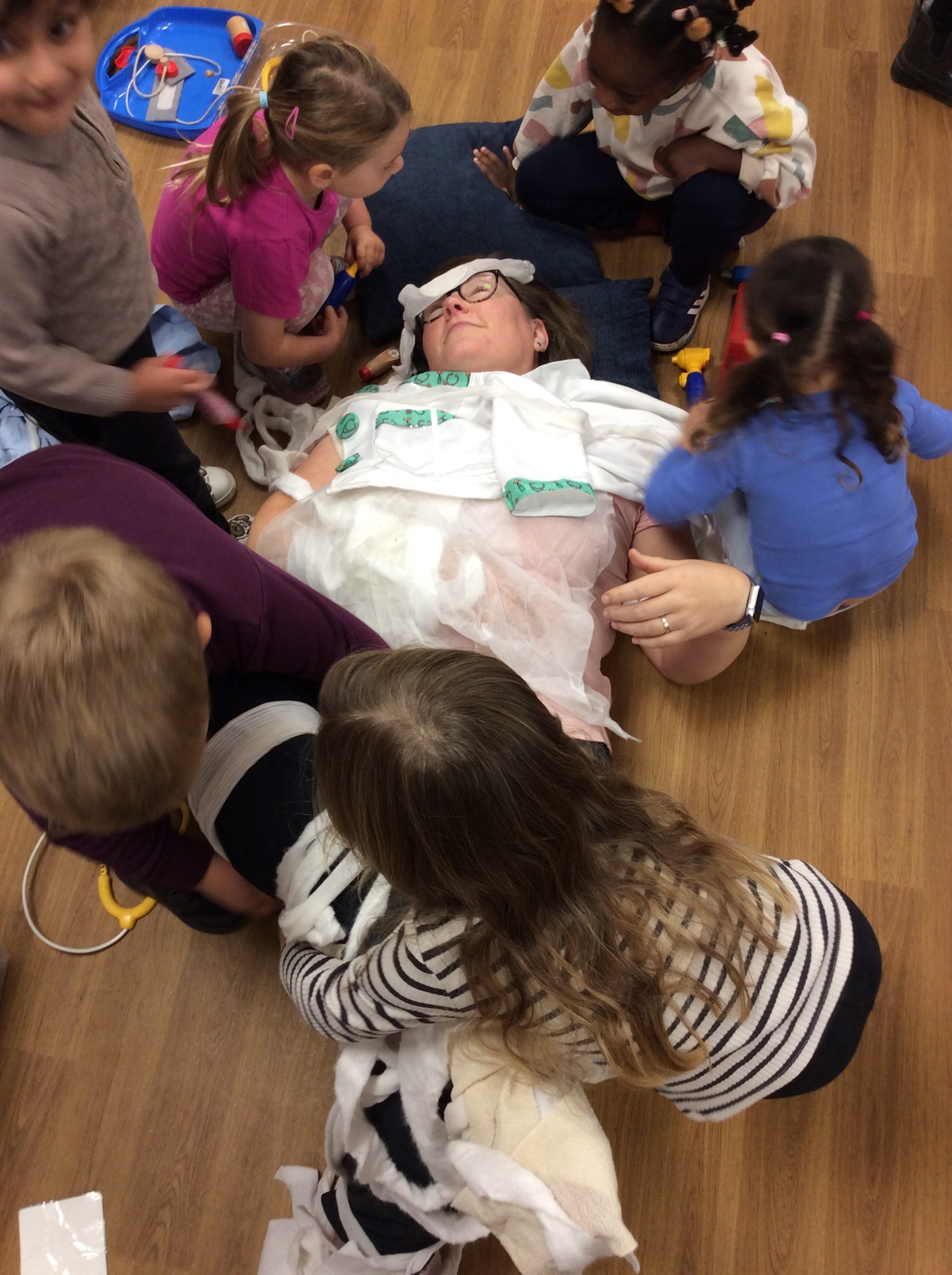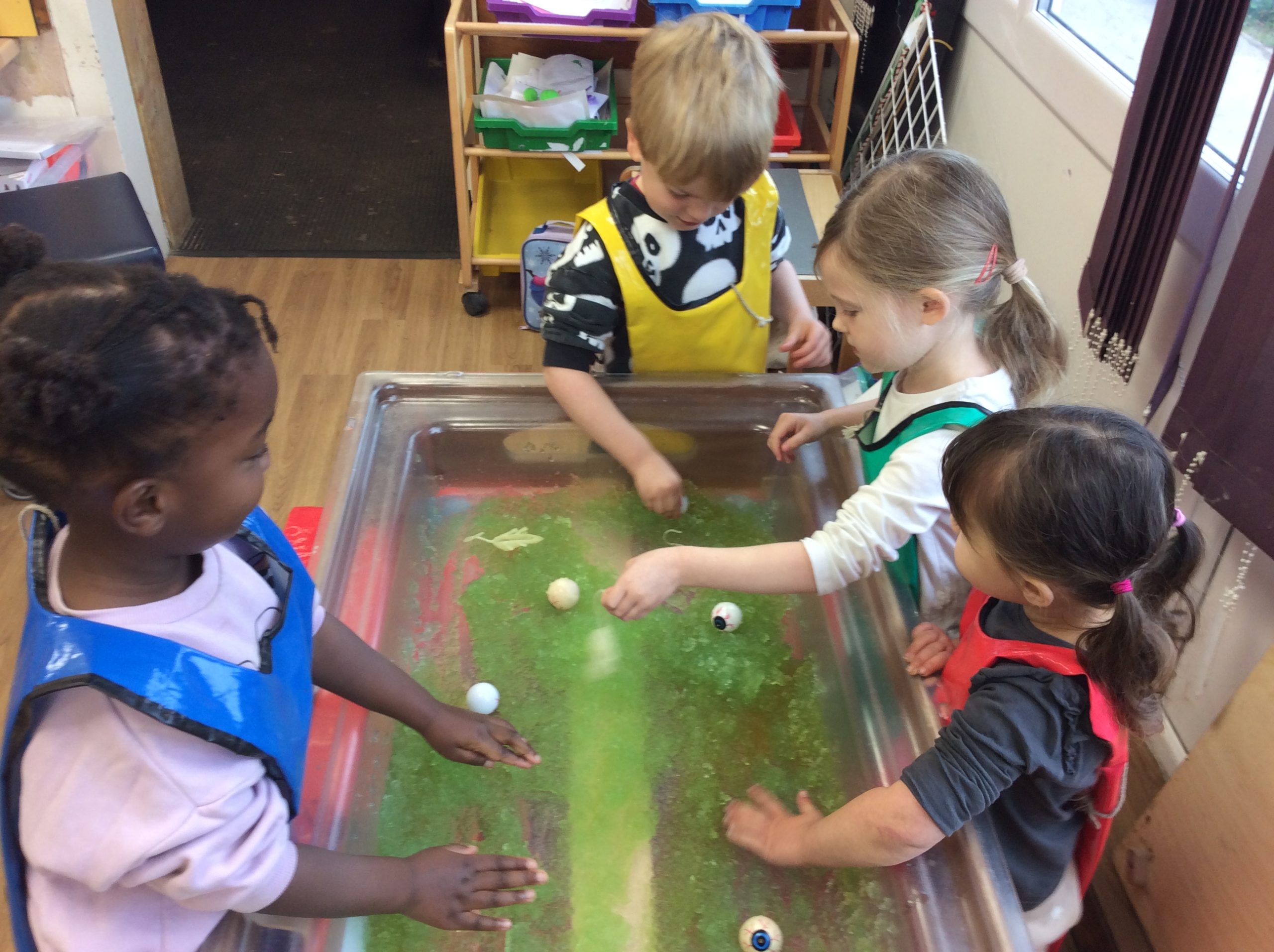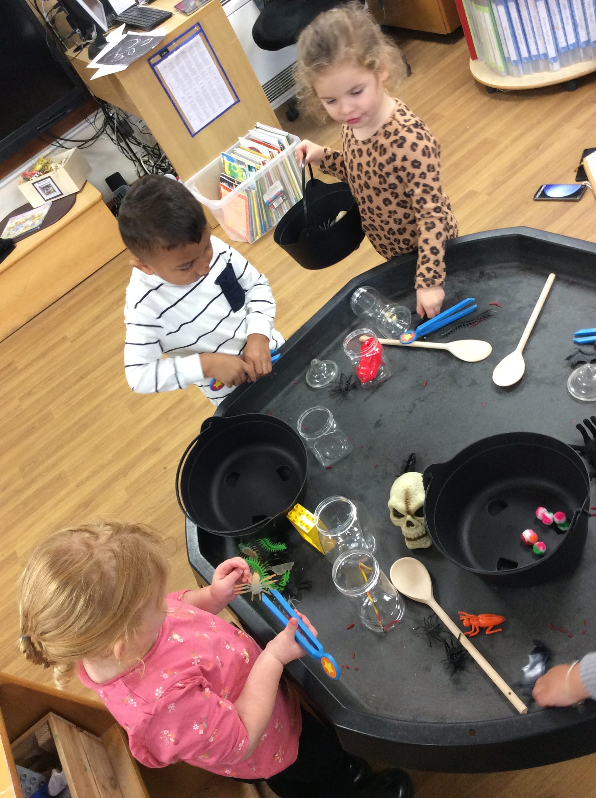 We’ve had another busy week. The children enjoyed bandaging me up while acting out the roles of doctors and nurses! This led the children to examine different bones and dance to the ‘Skeleton Dance’. We have looked at giraffe facts and charged around like rhinos! A favorite song this week has been ‘Lava Chicken’, which is apparently the ‘best’ song ever. Things have been a little spooky in our classroom. Halloween is approaching, so we have been busy making potions and playing with slime!
