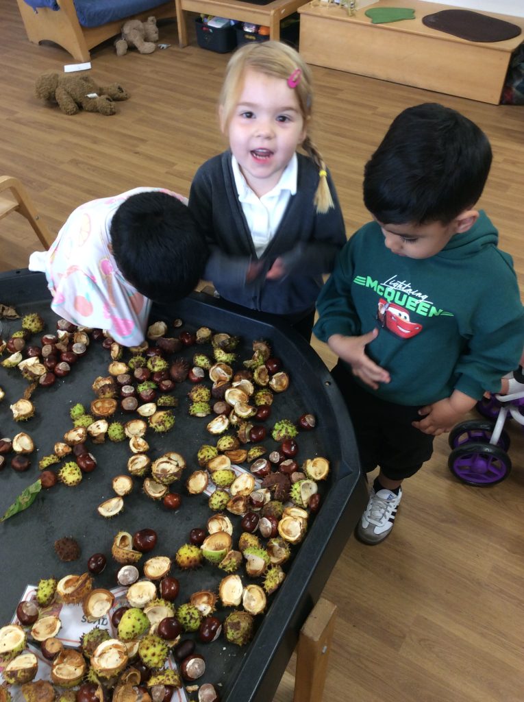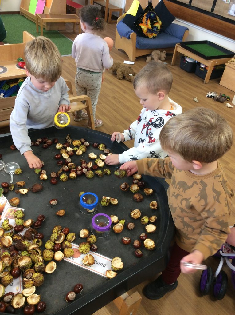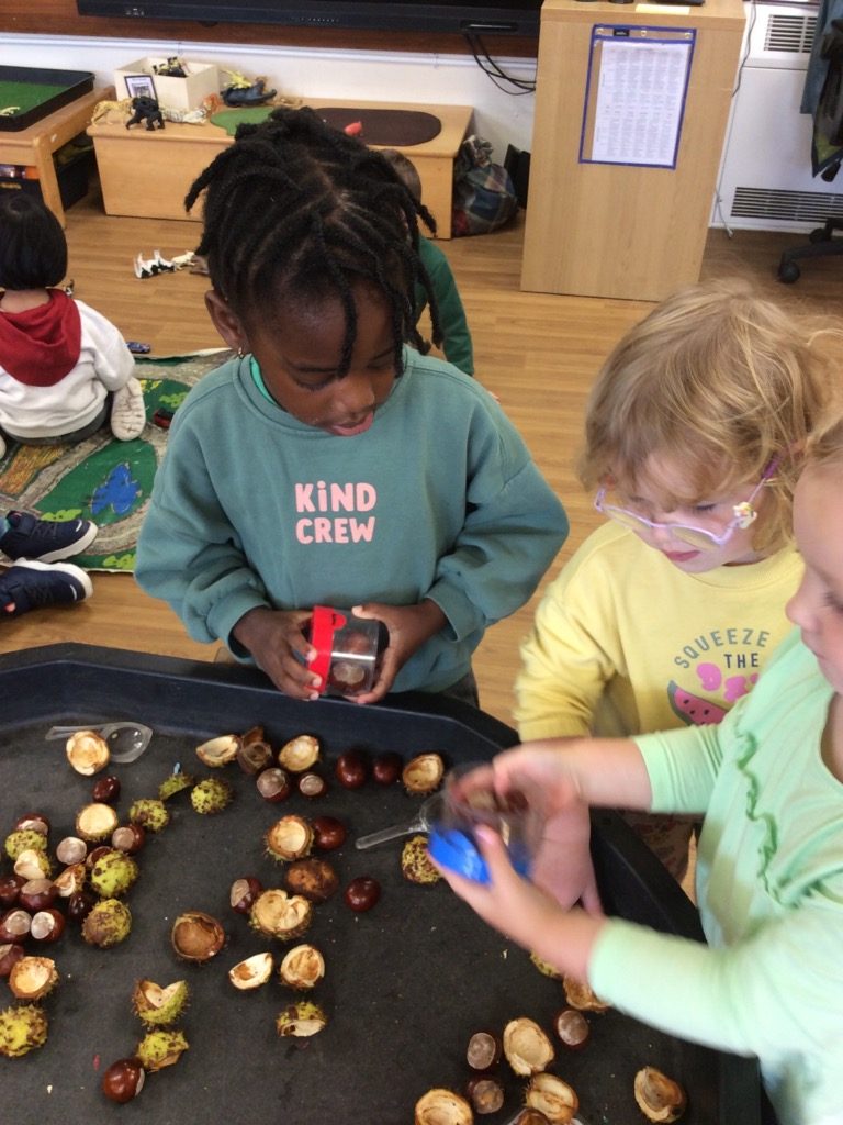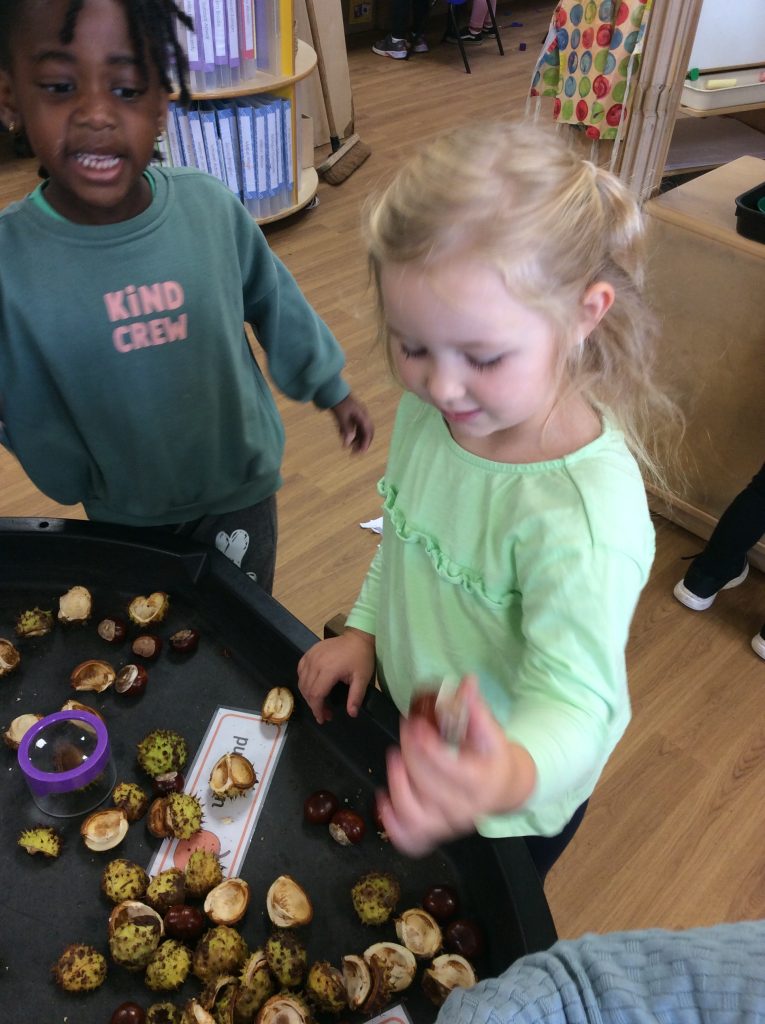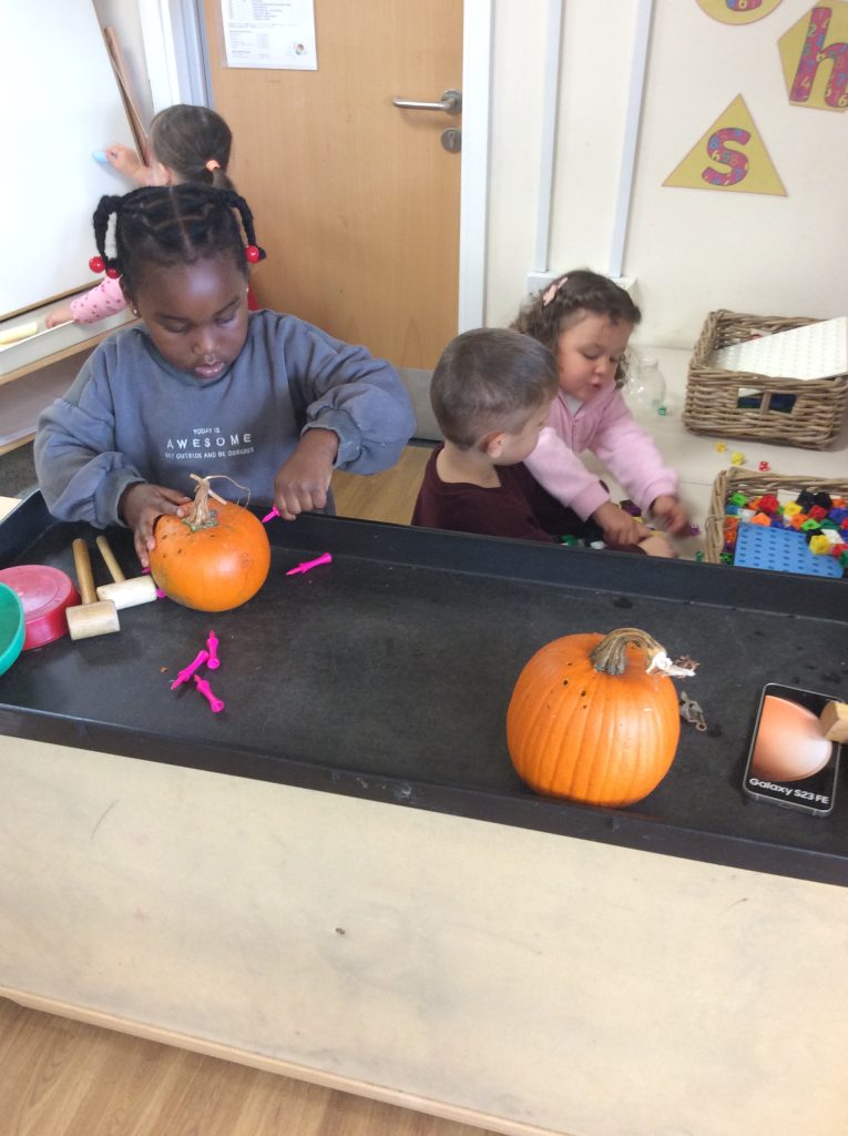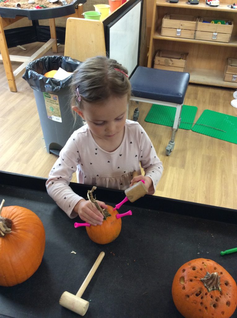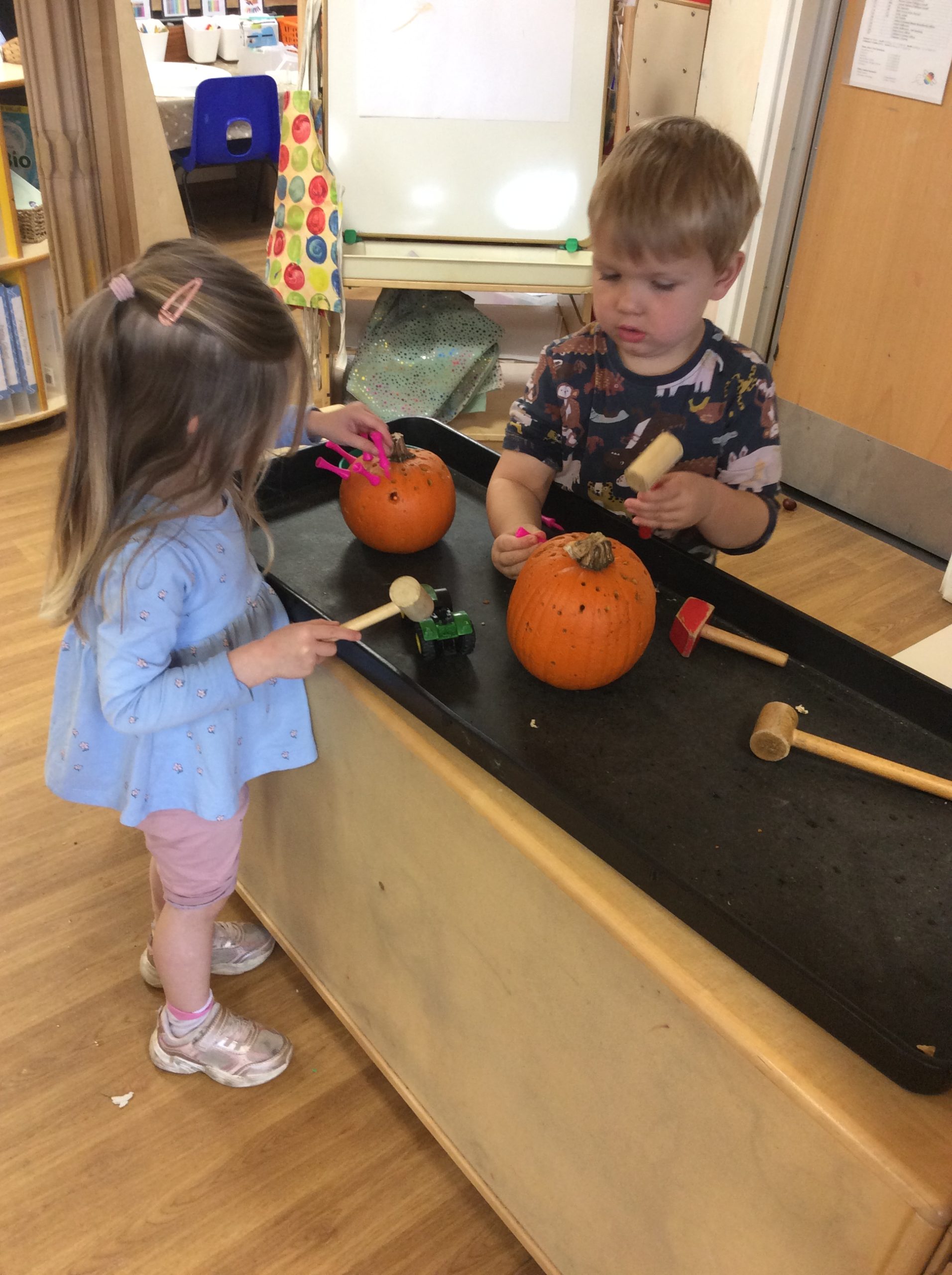 This week, we have looked at things we see during autumn. We placed some pumpkins, tees, and hammers in a tray to support fine motor skills, and conkers and their shells in a tray for the children to explore. The children loved looking closely at the seeds and the spikey shells they came from.