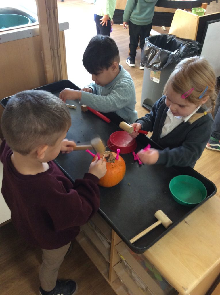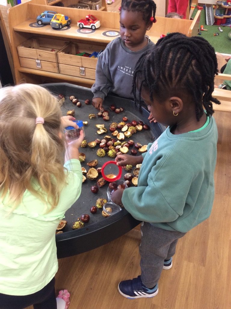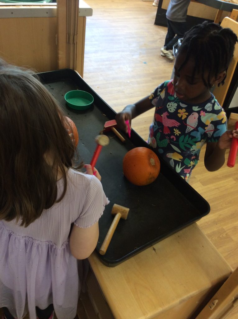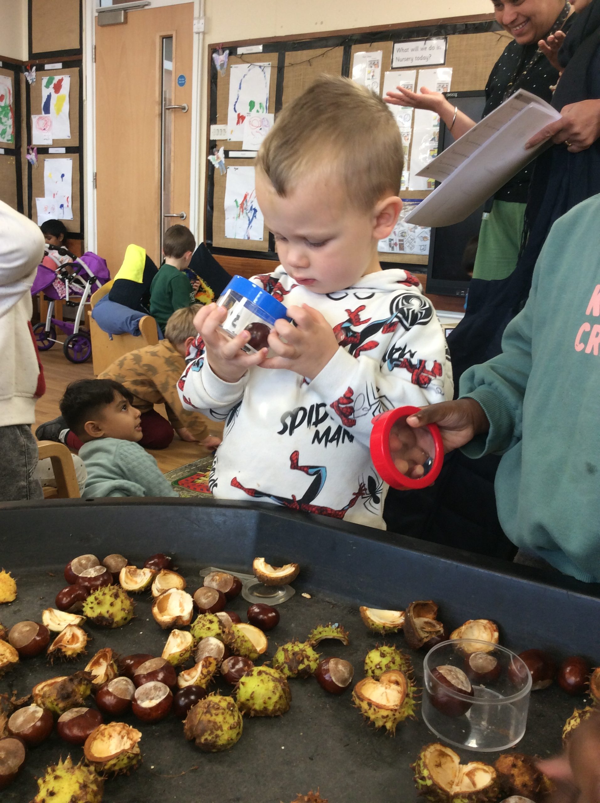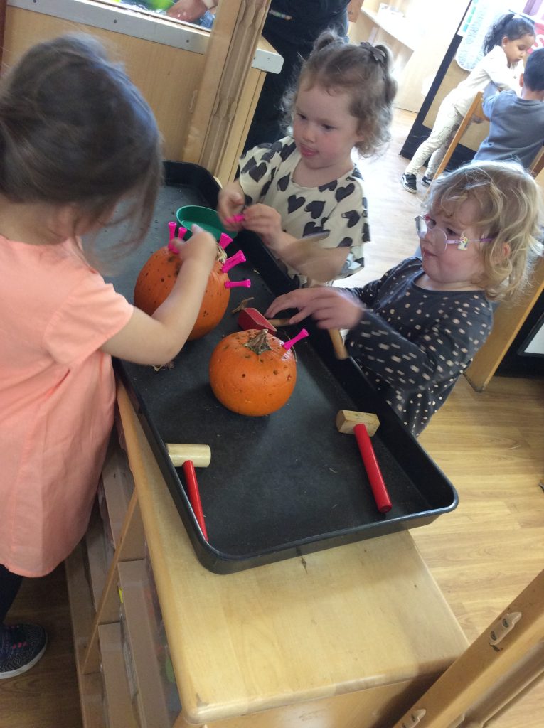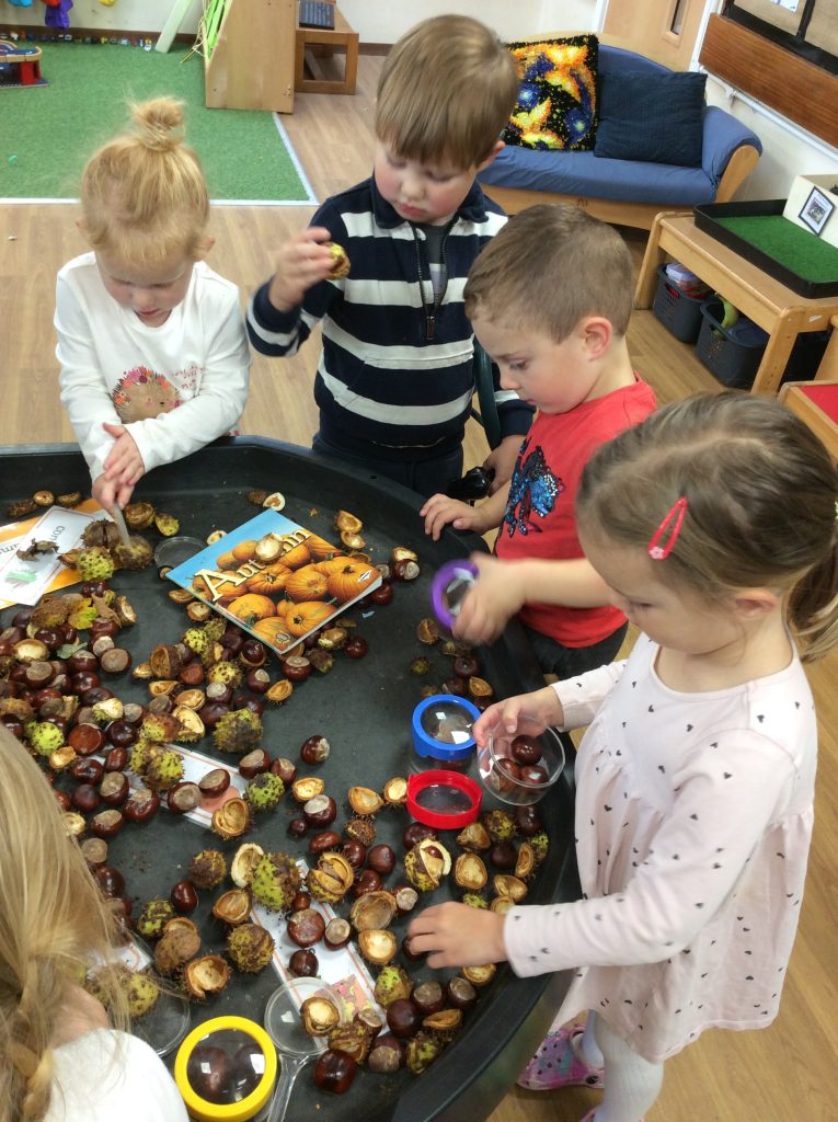 This week, we have looked at things we see during autumn. We placed some pumpkins, tees, and hammers in a tray to support fine motor skills, and conkers and their shells in a tray for the children to explore. The children loved looking closely at the seeds and the spikey shells they came from.