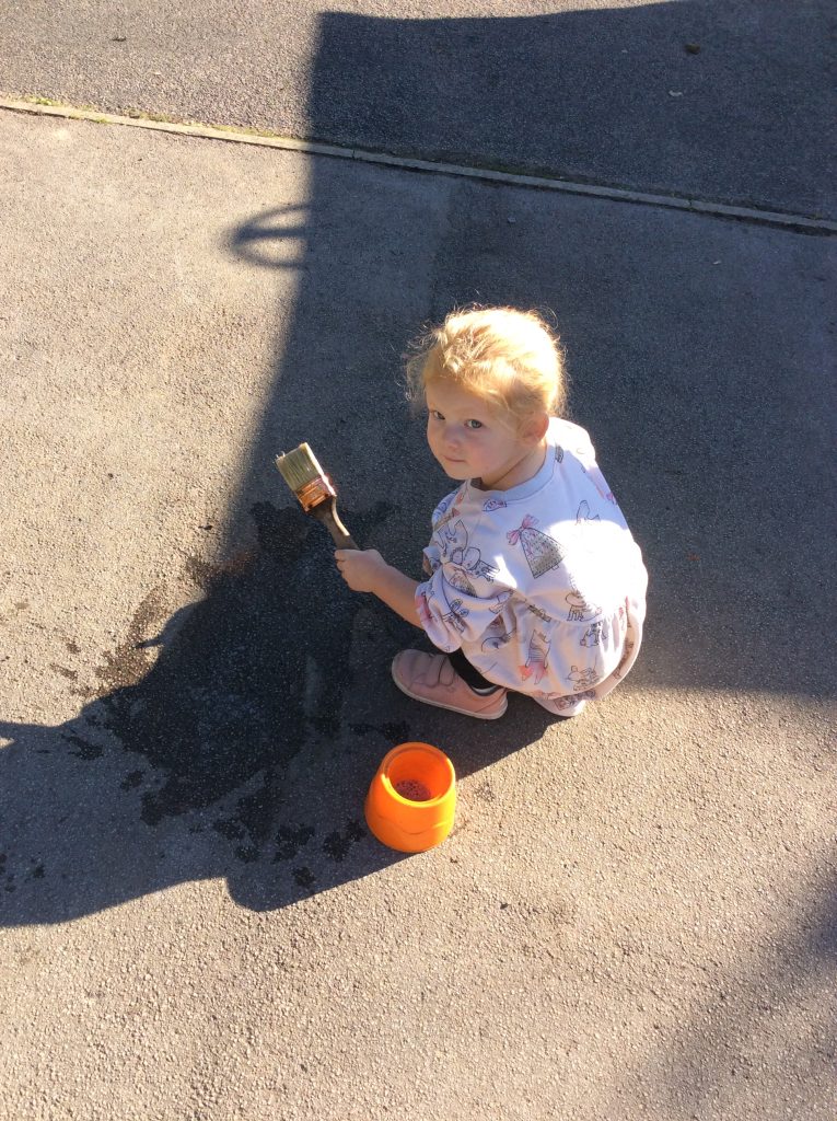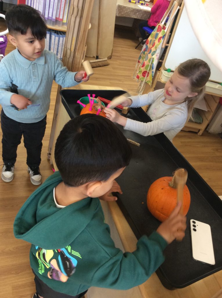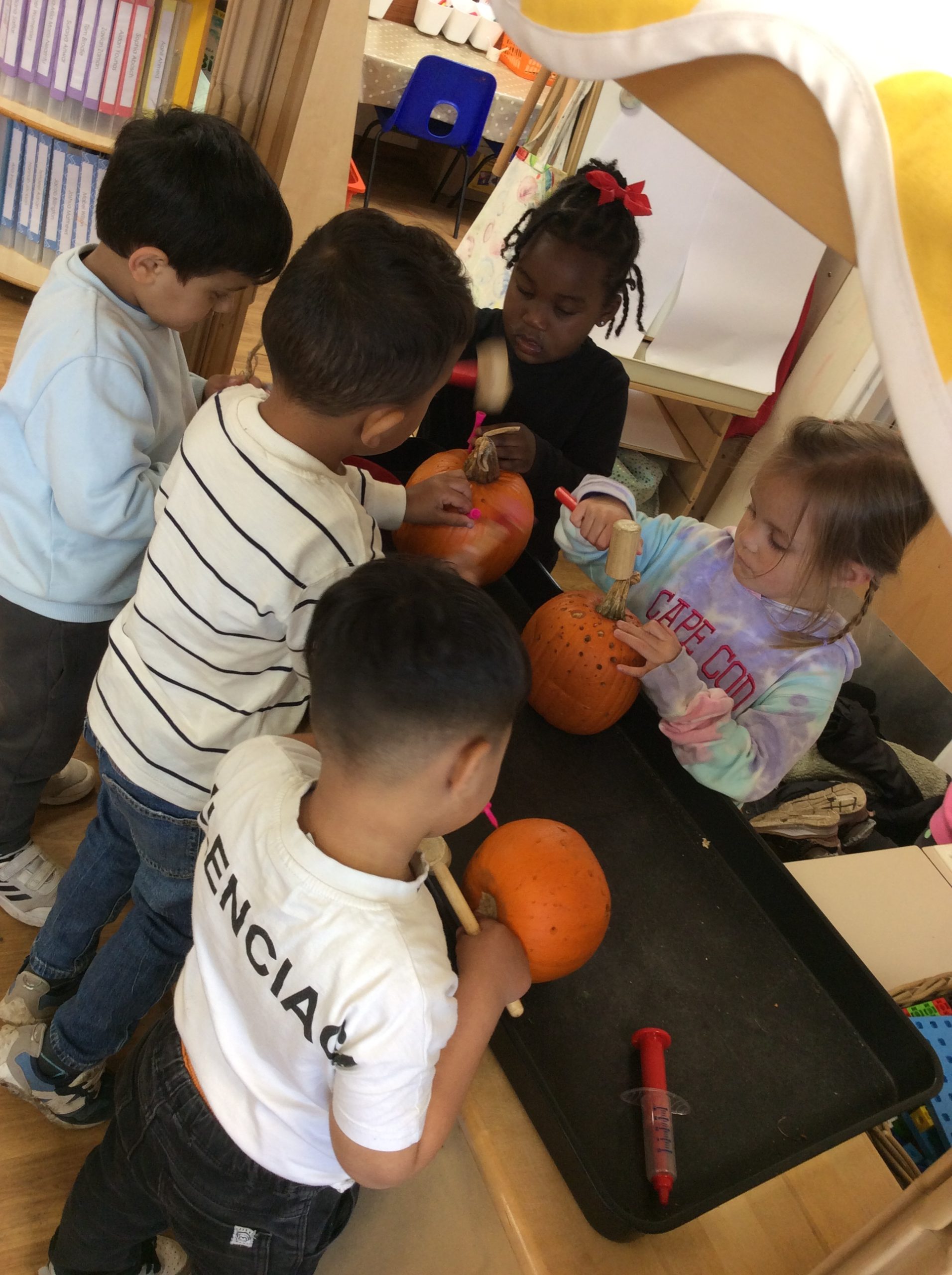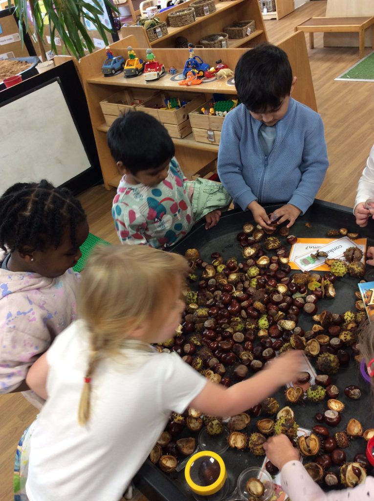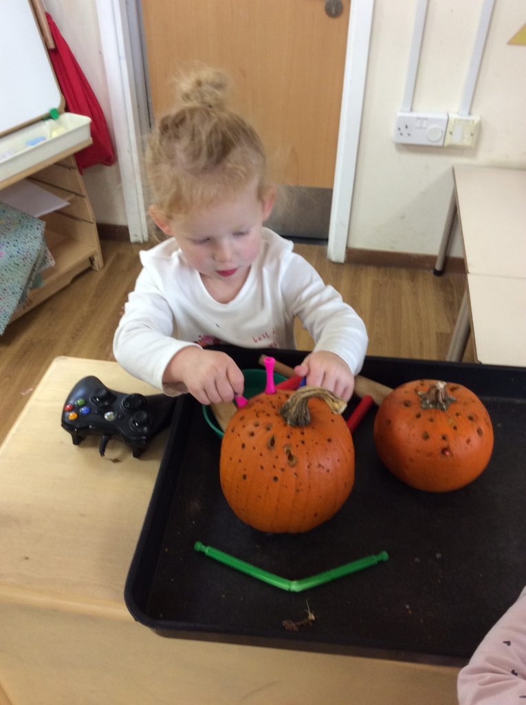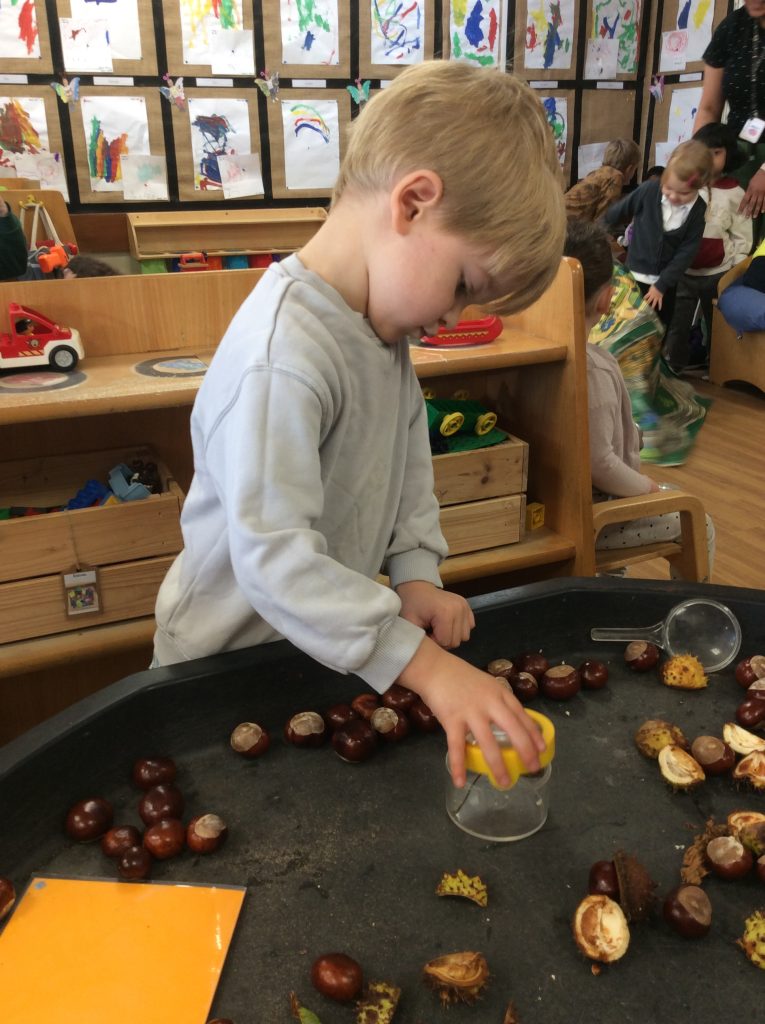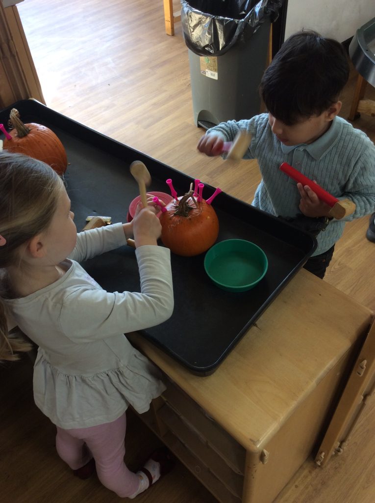 This week, we have looked at things we see during autumn. We placed some pumpkins, tees, and hammers in a tray to support fine motor skills, and conkers and their shells in a tray for the children to explore. The children loved looking closely at the seeds and the spikey shells they came from.