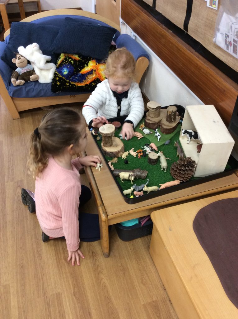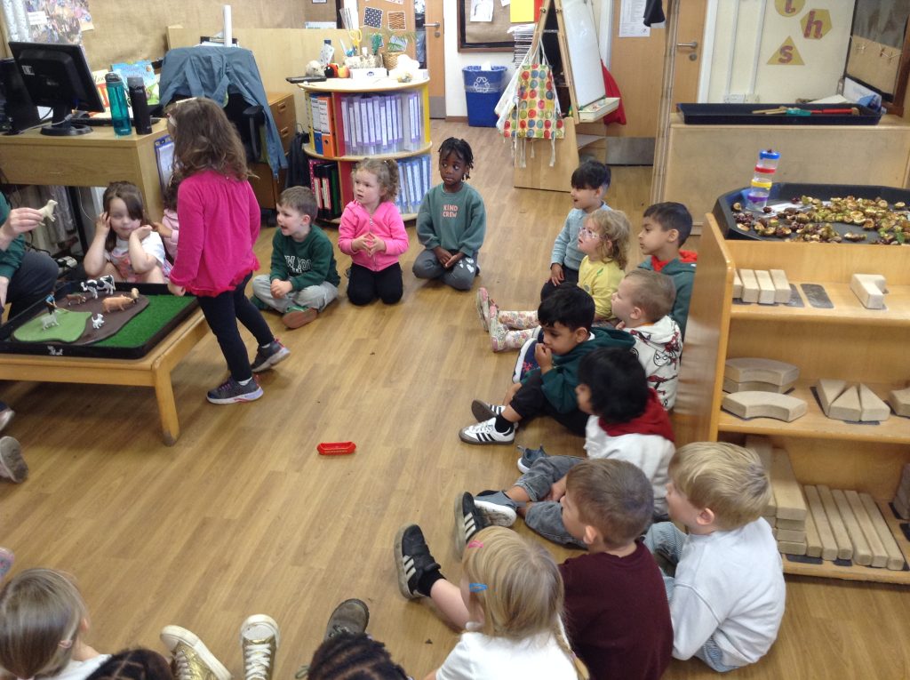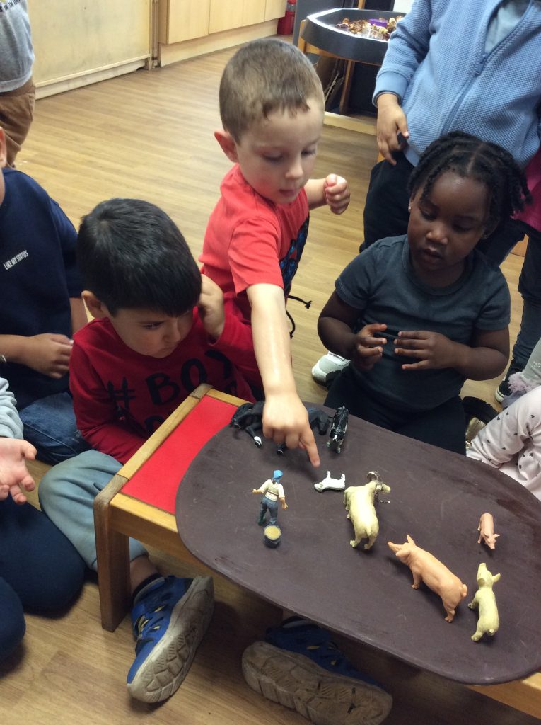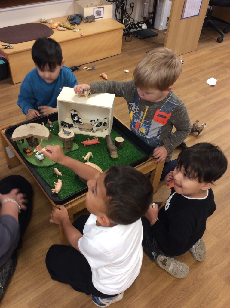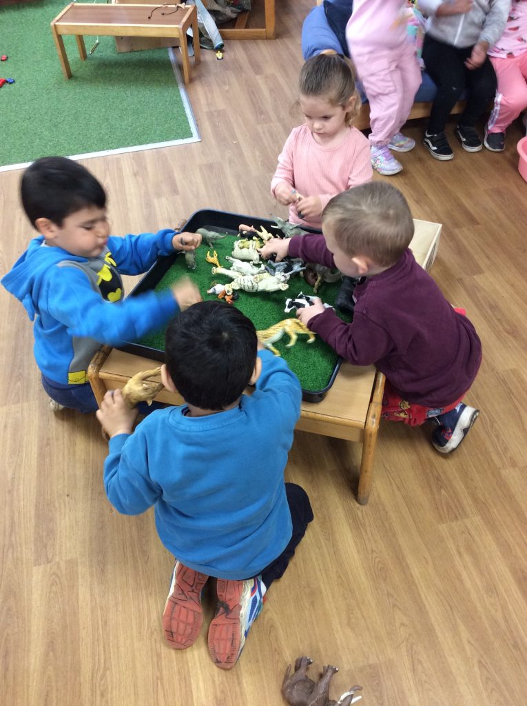 This week, we have been playing with sounds. We set up a farm-themed tuff tray and listened the the different sounds the animals make. We read our termly book, Dear Zoo, and made animal sounds. As with all our phonics sessions, we orally blended some words and segmented some too.