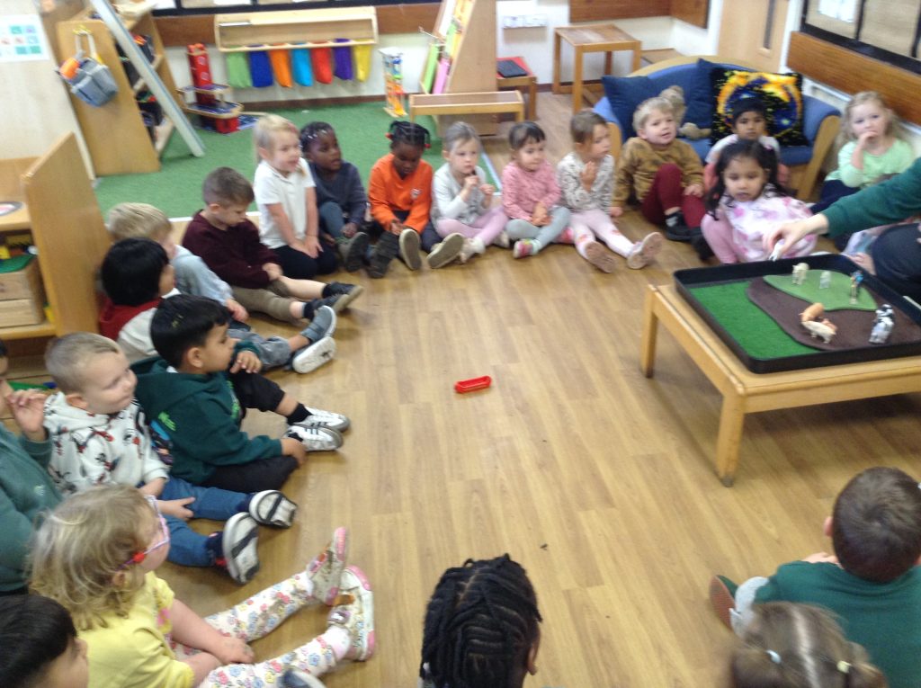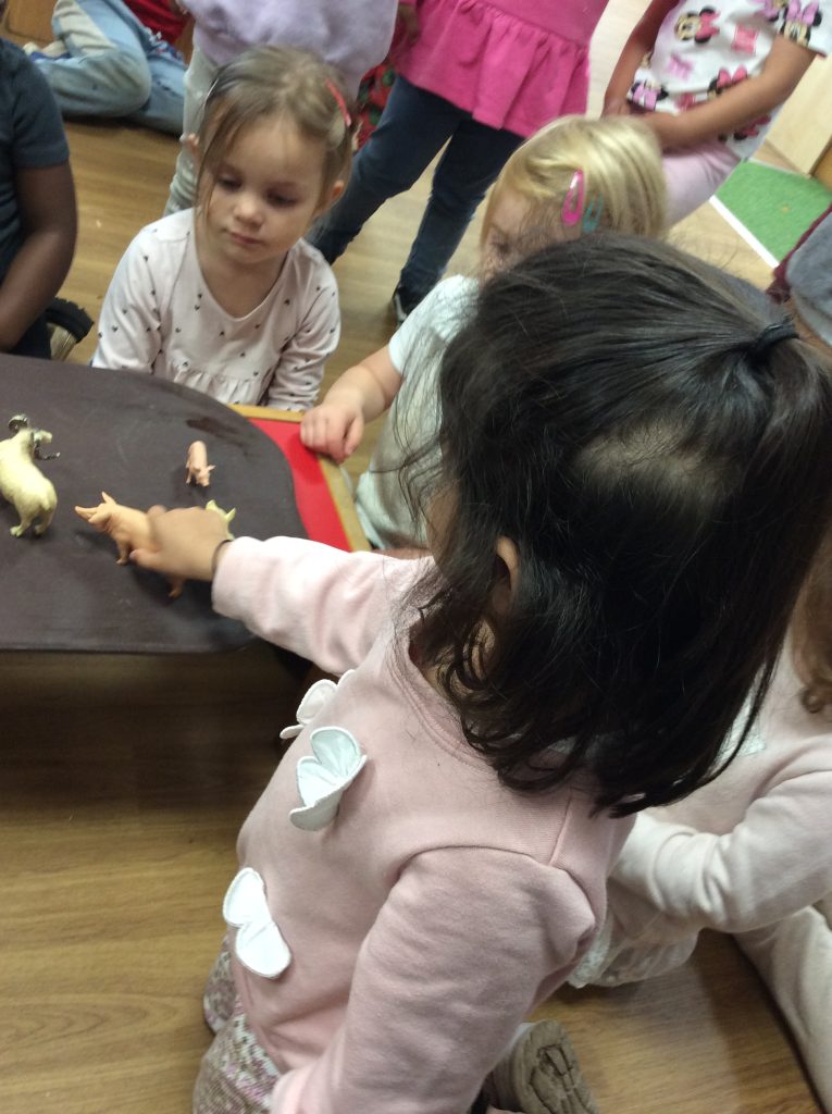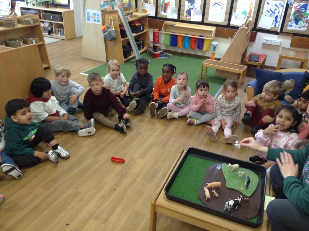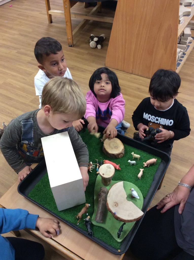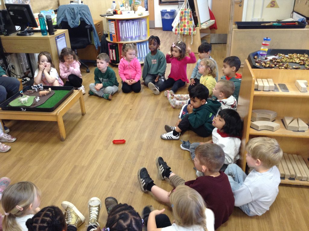 This week, we have been playing with sounds. We set up a farm-themed tuff tray and listened the the different sounds the animals make. We read our termly book, Dear Zoo, and made animal sounds. As with all our phonics sessions, we orally blended some words and segmented some too.