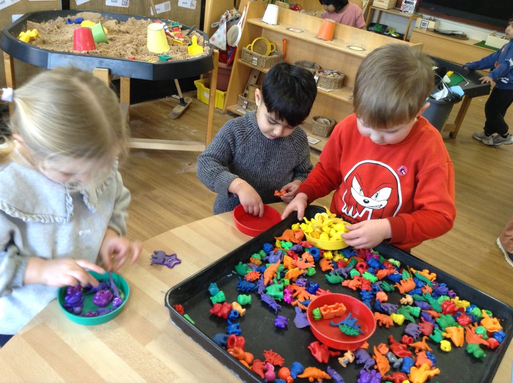 The children have been examining labels and symbols. We wrote numbers 1 to 3 on labels and attached them to buckets. The children helped count the correct number of objects to place in each bucket.