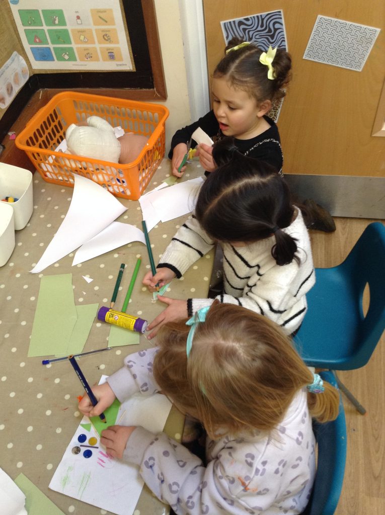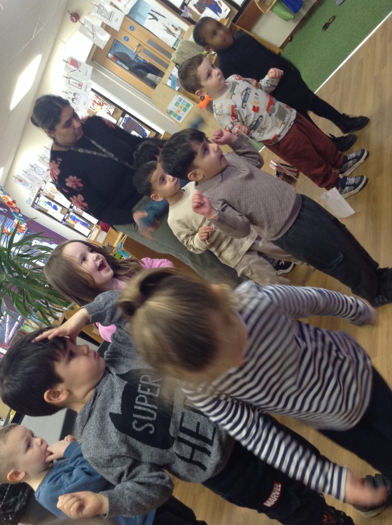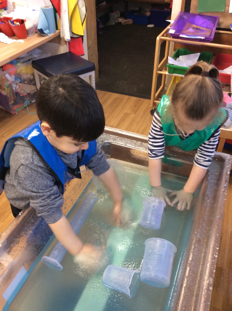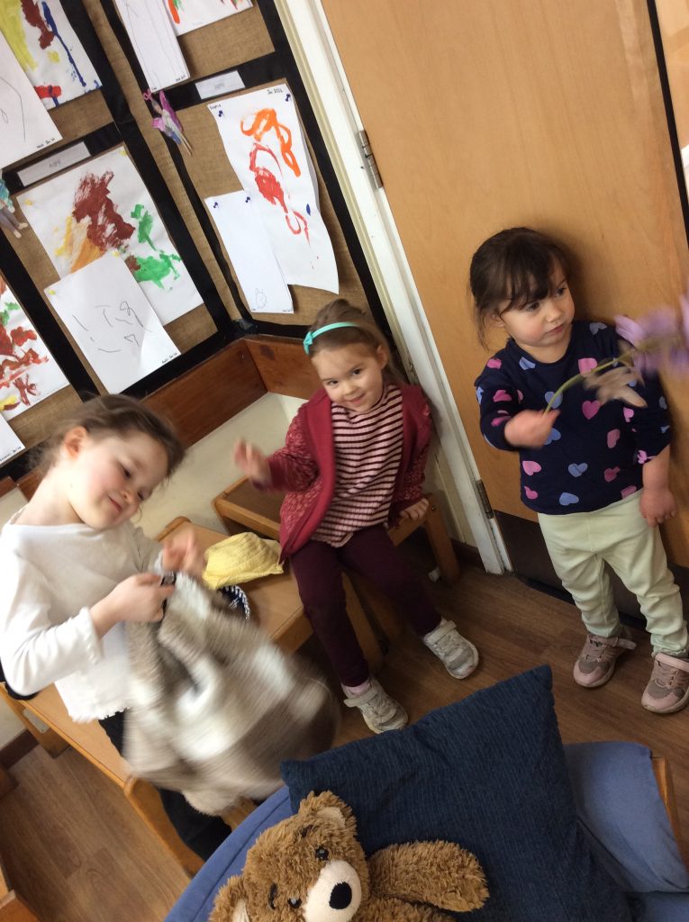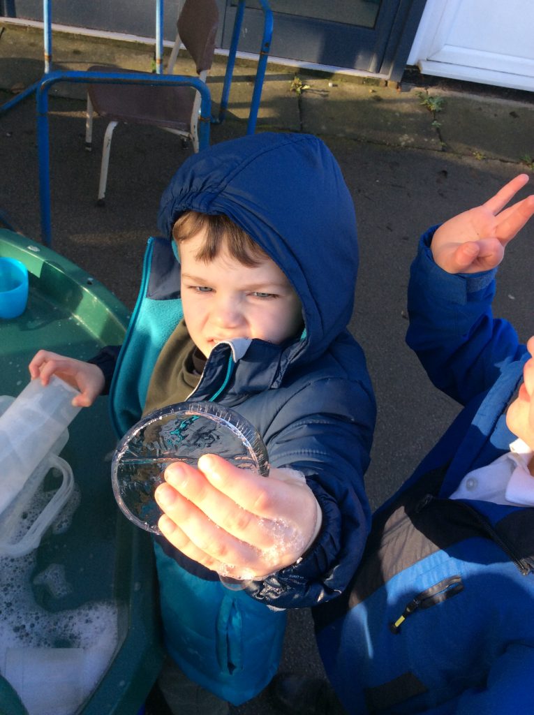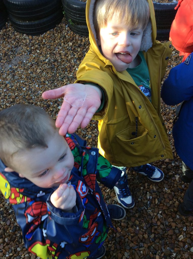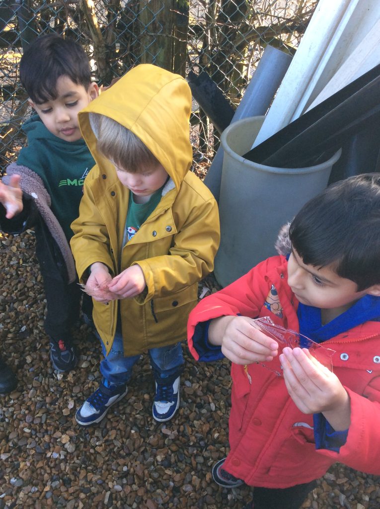 We have seen some extinct animals come to life this week! It was fun learning about what dinosaurs used to eat. We also looked at seals and sea lions and discussed their similarities and differences. The children have continued to practise writing their names and are really impressing us with their letter formation. There was some ice outside, which the children found interesting. We had great fun finding it, looking through it, and smashing it! We spent some time in the hall using the apparatus, working on our tummy muscles. The children also enjoyed painting, making kites, playing in a jelly bath, and making paper flowers.