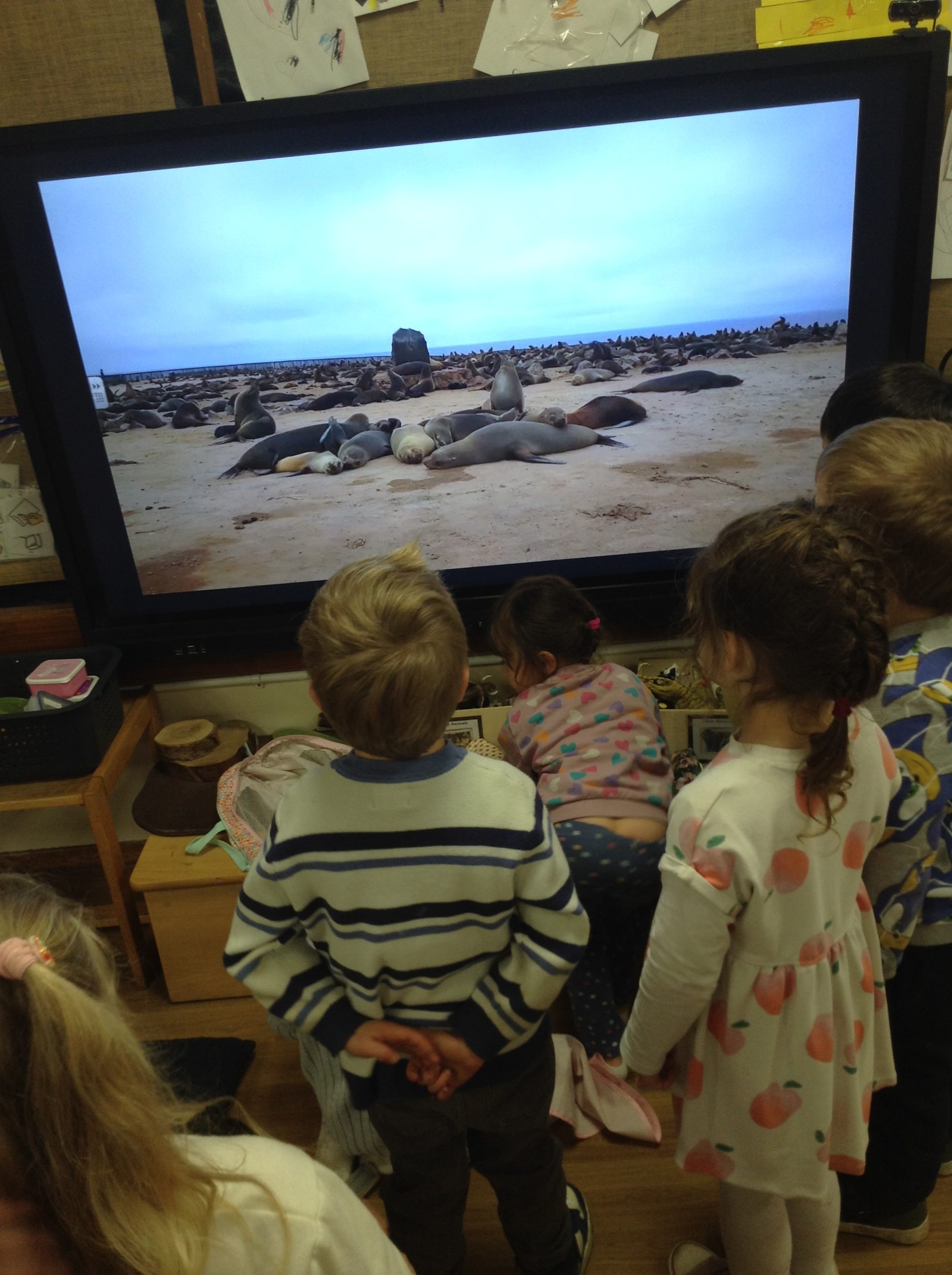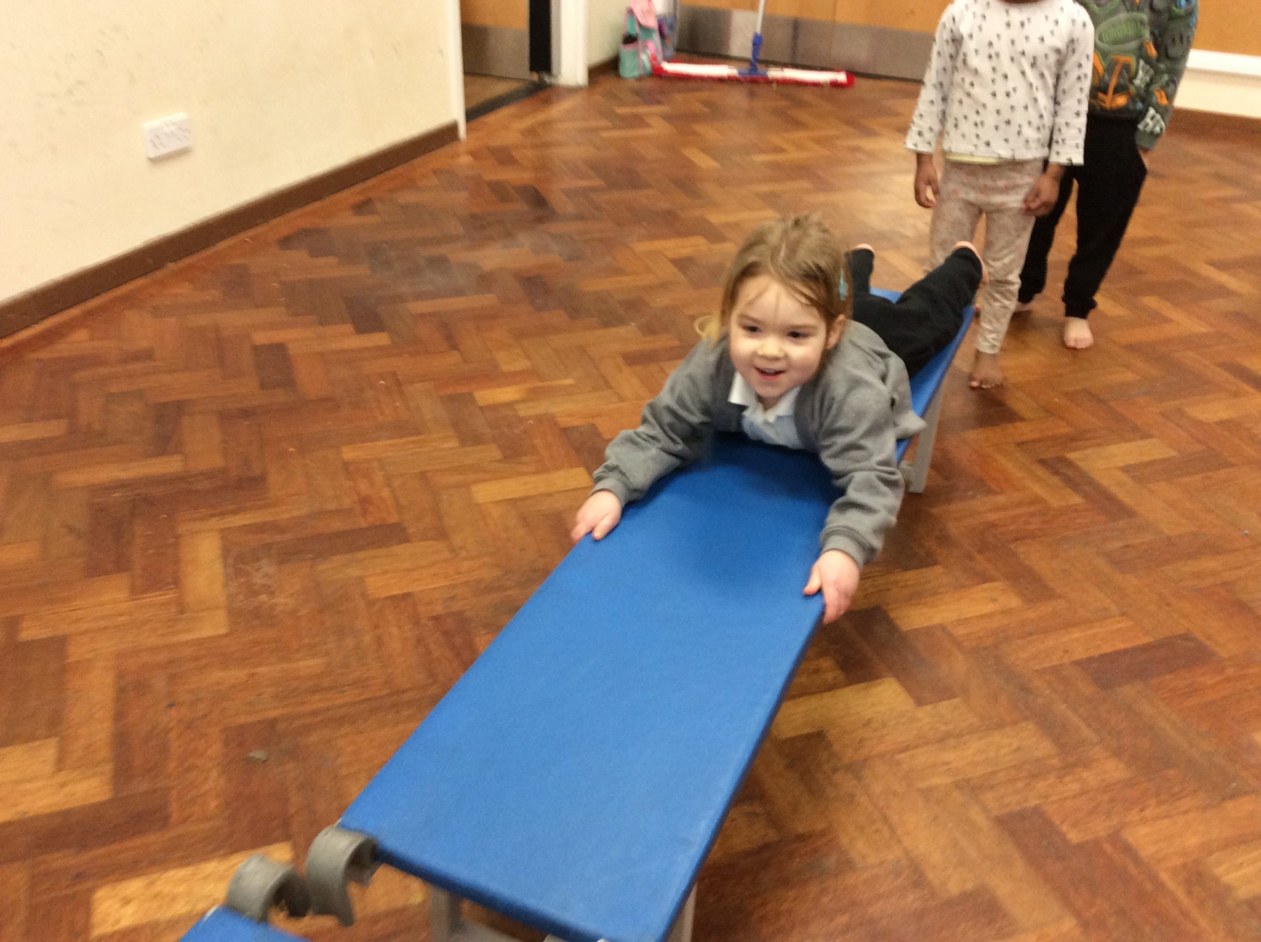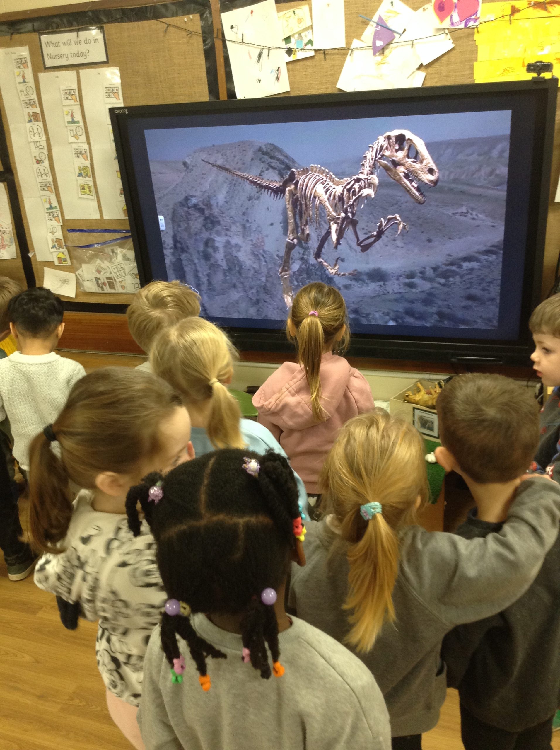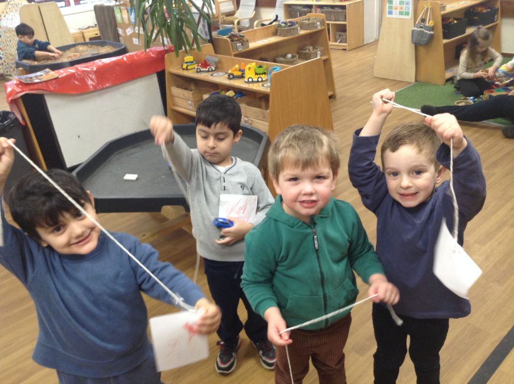 We have seen some extinct animals come to life this week! It was fun learning about what dinosaurs used to eat. We also looked at seals and sea lions and discussed their similarities and differences. The children have continued to practise writing their names and are really impressing us with their letter formation. There was some ice outside, which the children found interesting. We had great fun finding it, looking through it, and smashing it! We spent some time in the hall using the apparatus, working on our tummy muscles. The children also enjoyed painting, making kites, playing in a jelly bath, and making paper flowers.