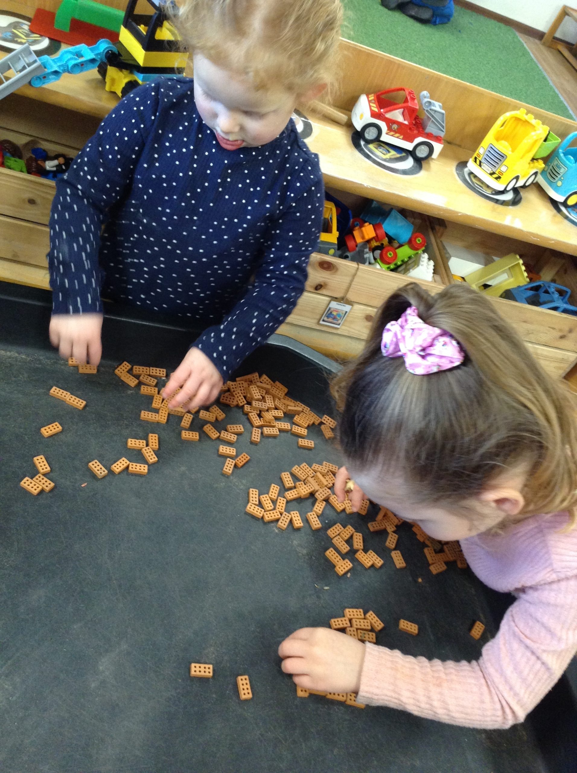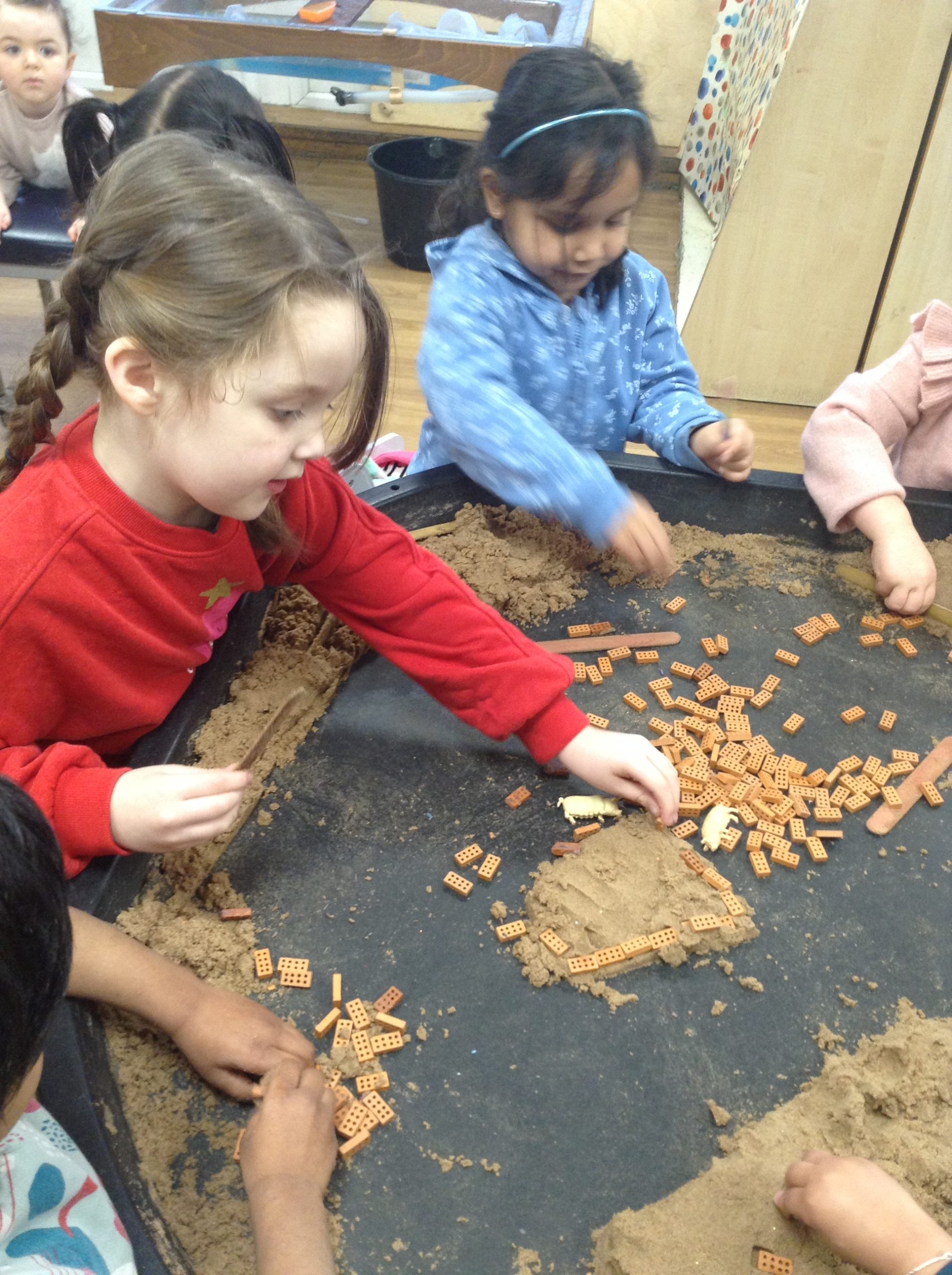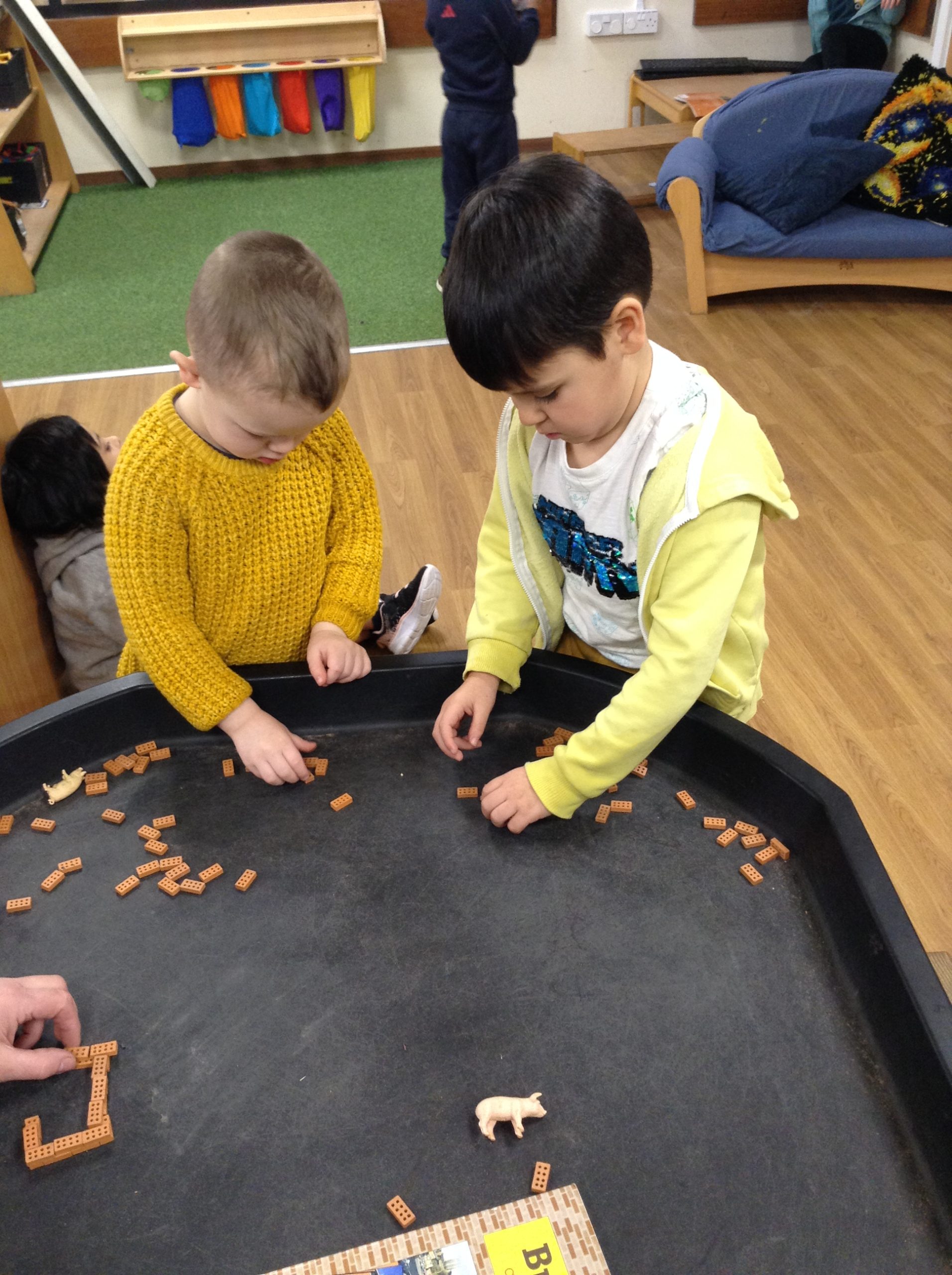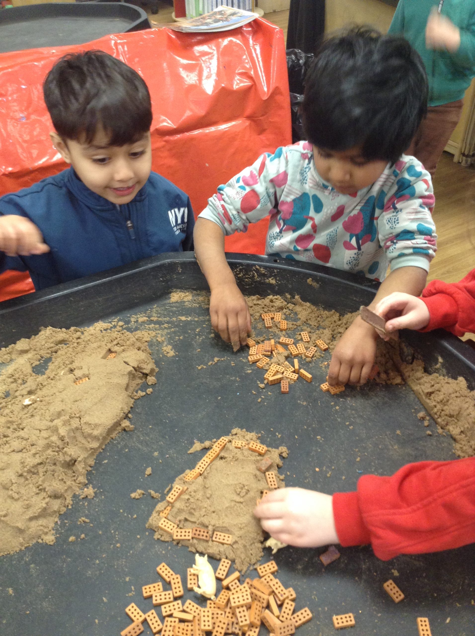 This week, the children examined bricks. We watched a video showing how bricks are made, then attempted to build a house for a pig. The children also looked at different types of houses and buildings from around the world. As we couldn’t use full-sized clay bricks, we opted for a tiny version instead. We also used the foam bricks outdoors.