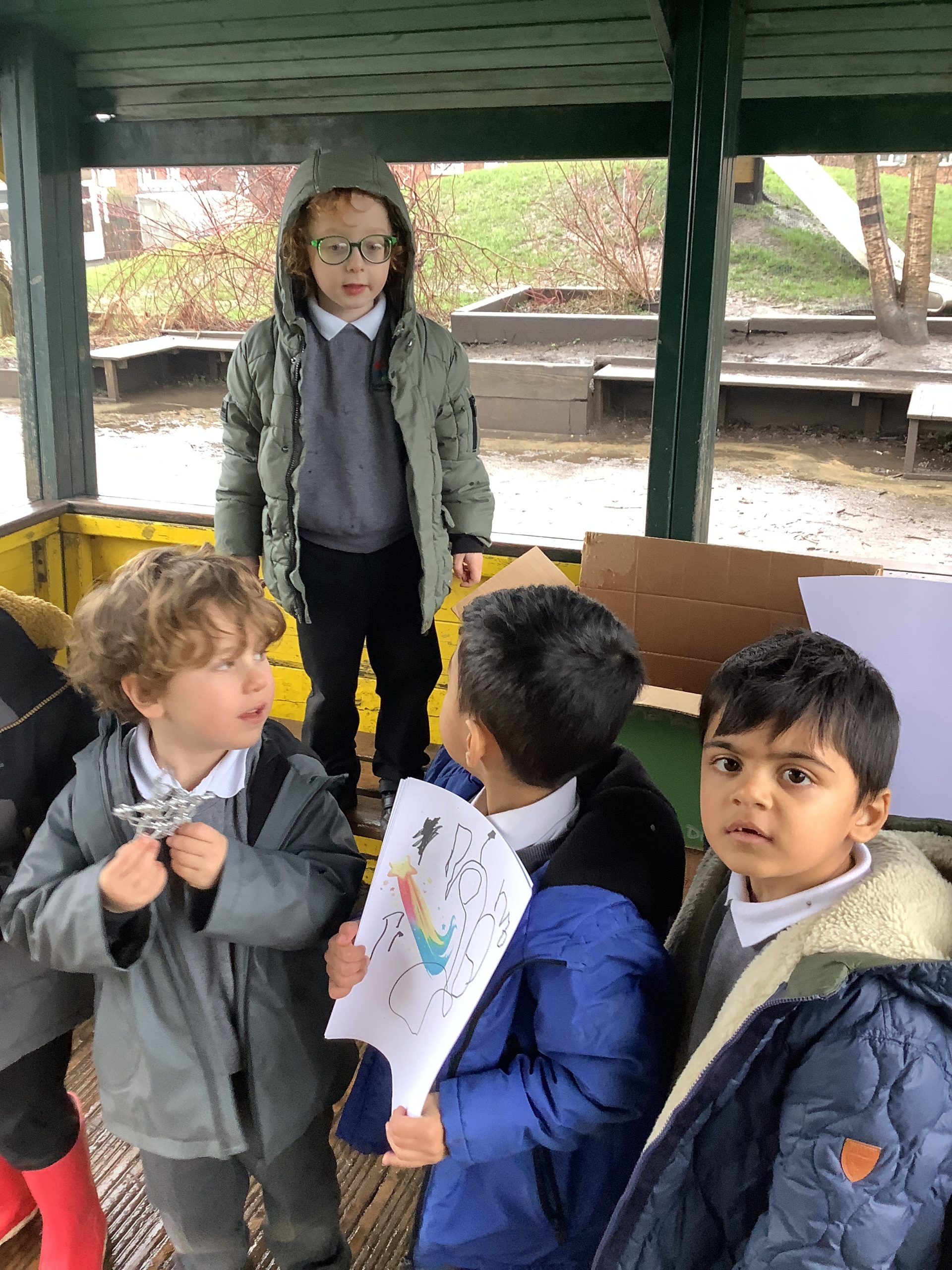 This week it was time to get the star back into the sky. Before we returned the star we took a trip to space. We got dressed in our space suits, put our seat belts on and counted down from 10 to 0. When we got to space we made peanut butter and jelly sandwiches (we had to keep grabbing all the bread that kept floating away!!), we brushed out teeth and strapped ourselves into our sleeping bags for a quick sleep before we walked in space. We returned to Earth to put all our super star writing and the items we had made in a safe place outside. Watch the sky tonight to see if you can spot our lost star!
