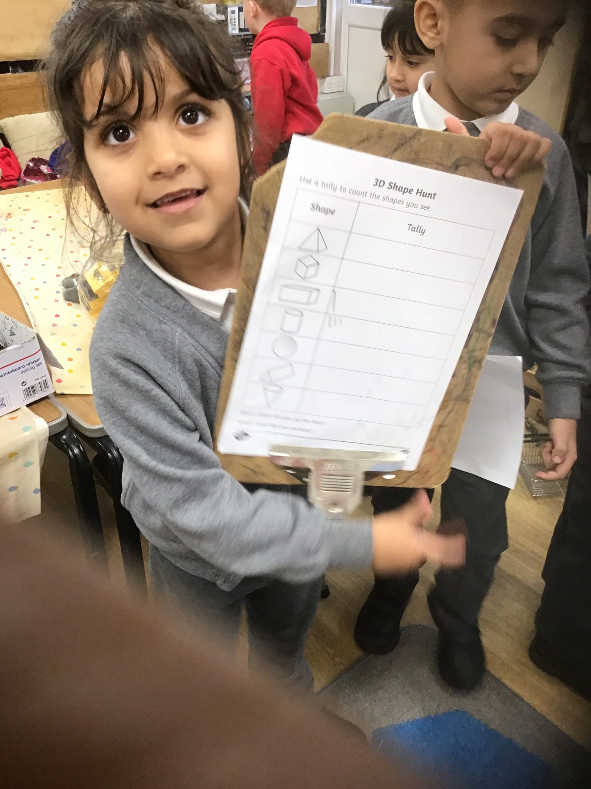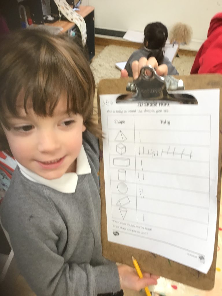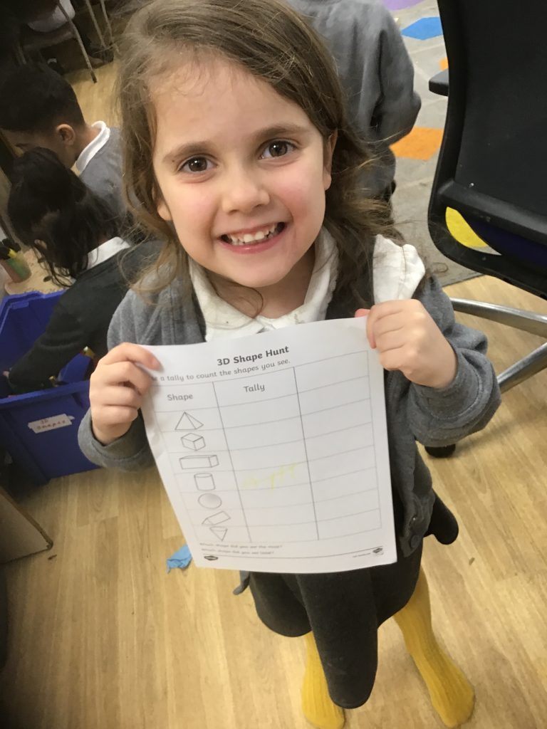 We have had lots of fun with 3D shapes this week. The children have enjoyed learning their names and their properties. They have been on a shape hunt around the classroom too. What facts can they remember?