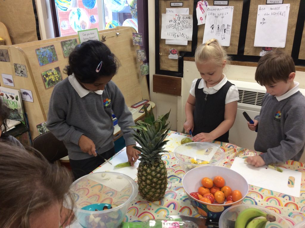Our focus book this half term is Oliver’s Fruit Salad. The children were keen to make their own fruit salad. It was delicious!