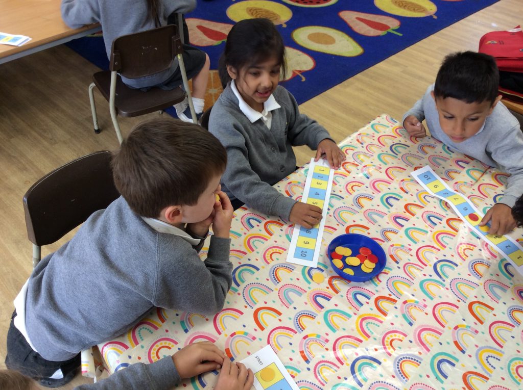 We have also been doing lots of counting using number tracks. They played games that encouraged them to compare numbers that are far apart, near and next to each other. (For example, 10 is a lot more than 2 but 5 is only 1 more than 4.)