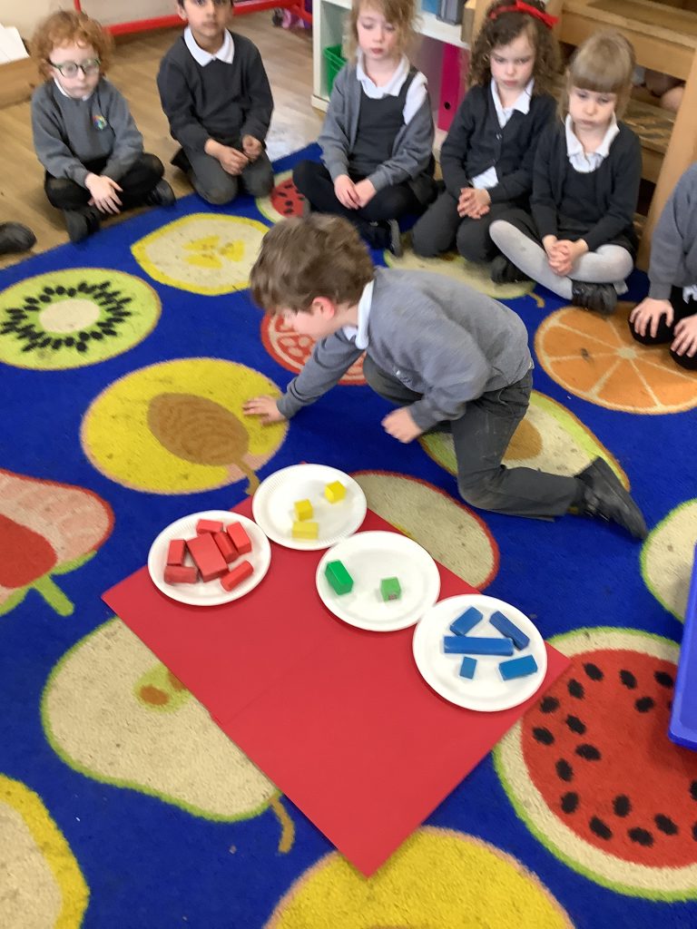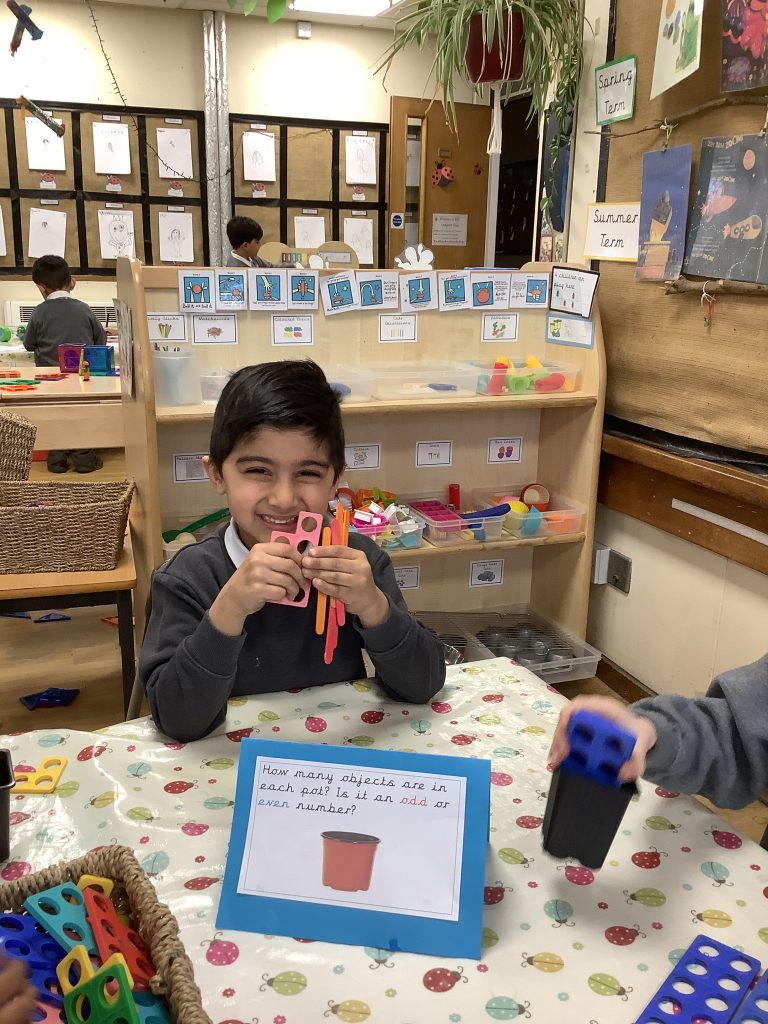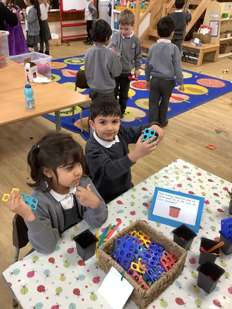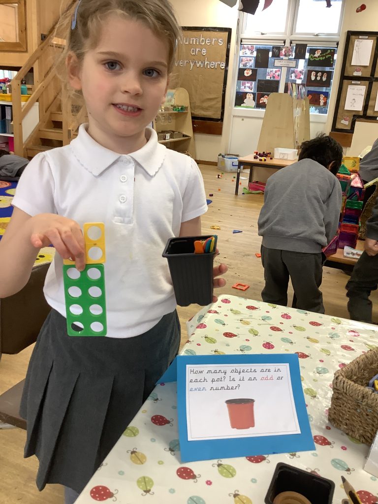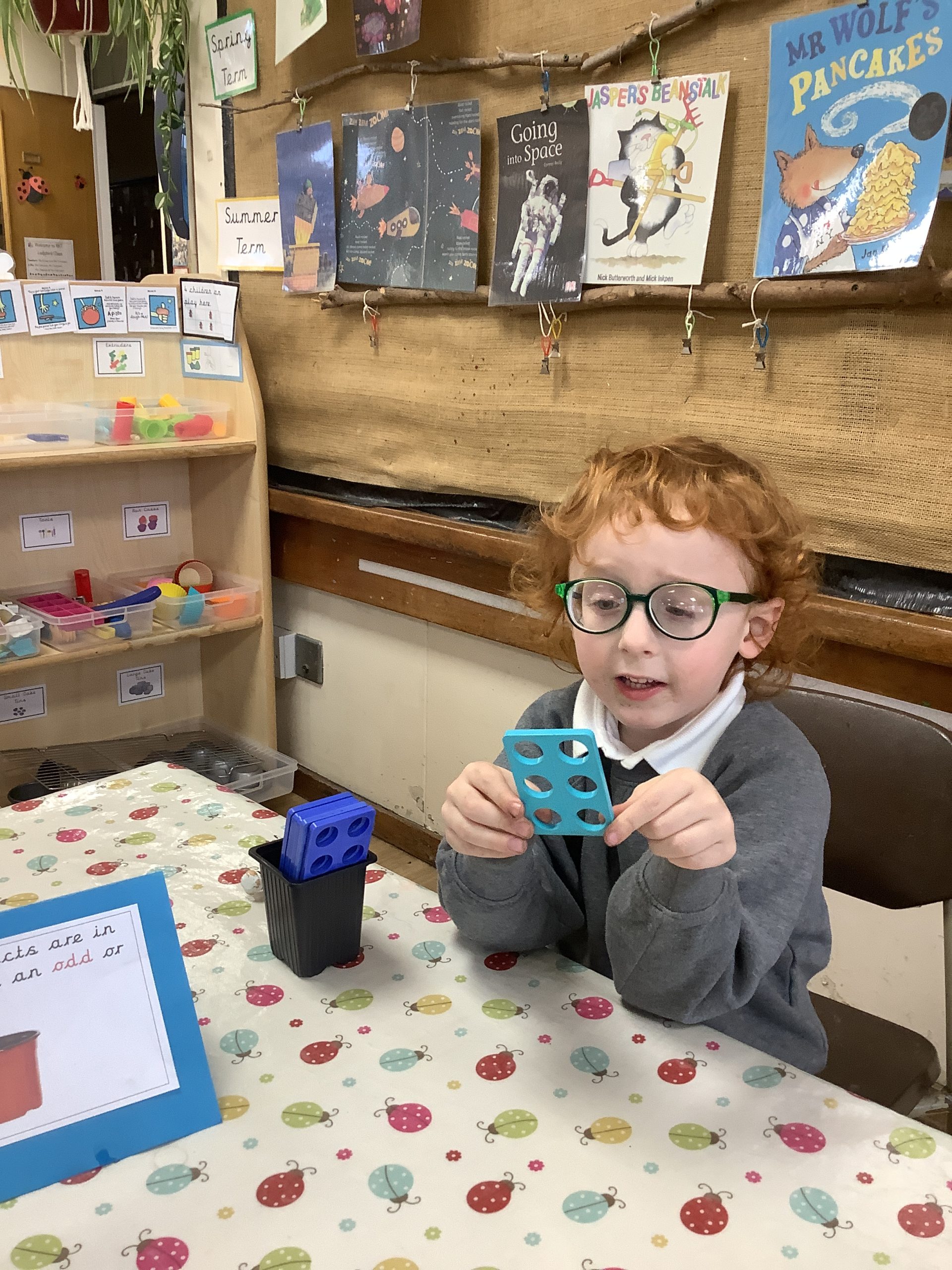 This week the children have practically sorted buttons and pens in different ways. They noticed differences such as colour and size. They have also used their previous experience of investigating doubles to begin to practically explore odd and even numbers. The children have enjoyed watching Numberblocks and they have made their own Numberblocks with ‘even’ or ‘odd’ tops!