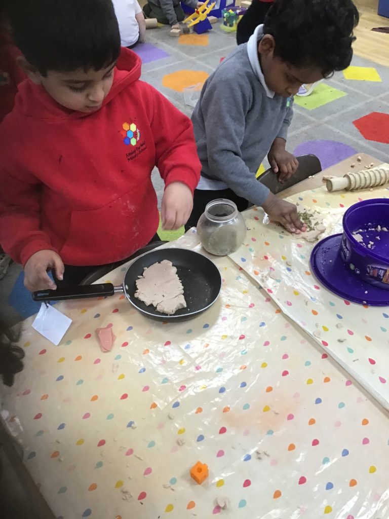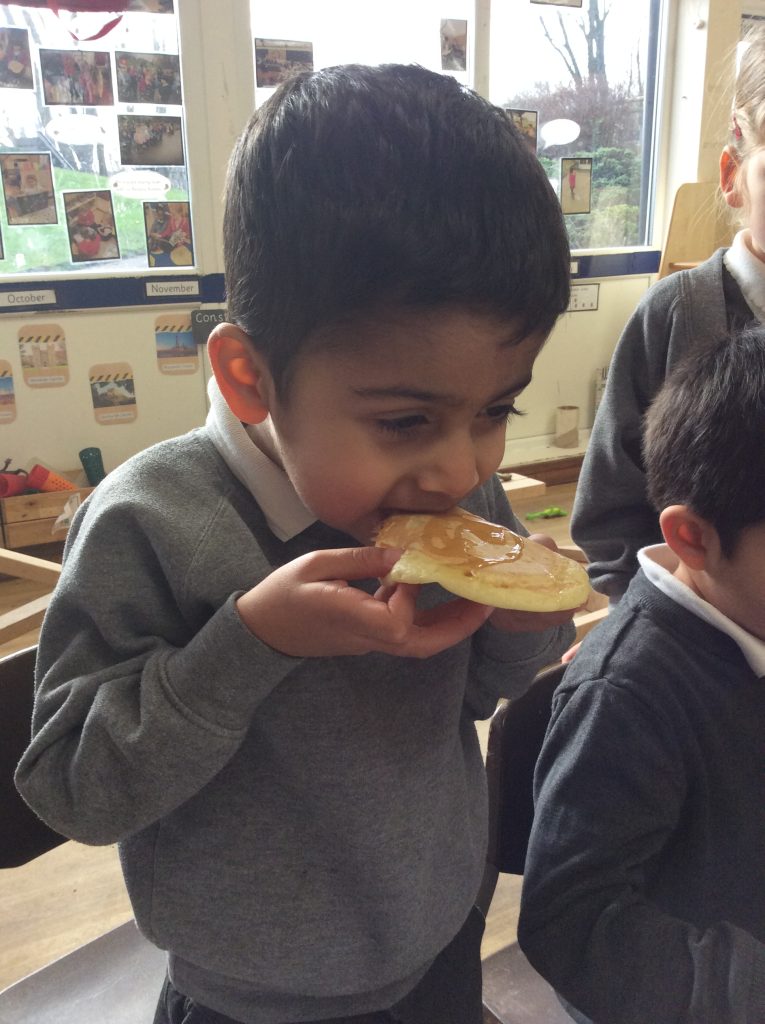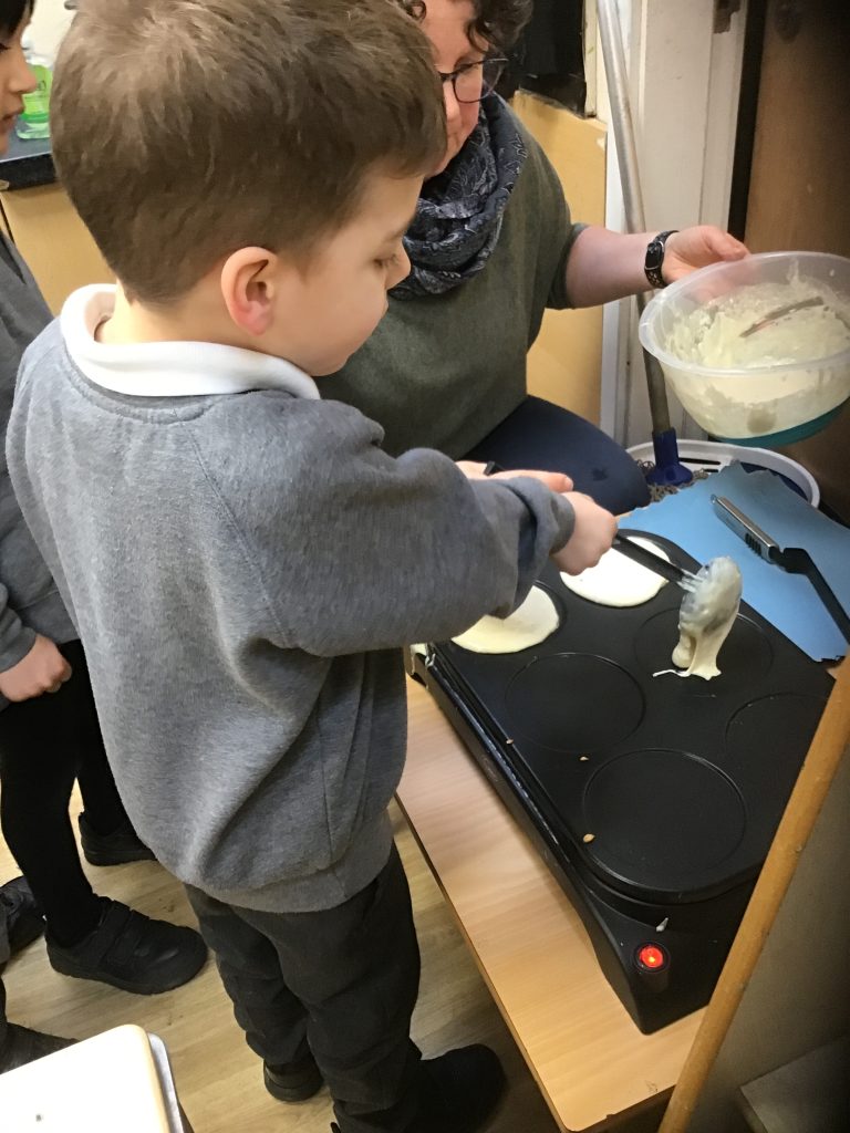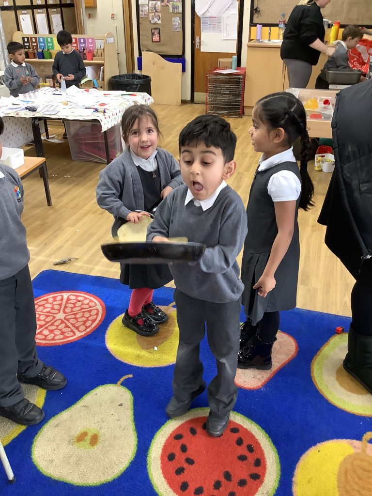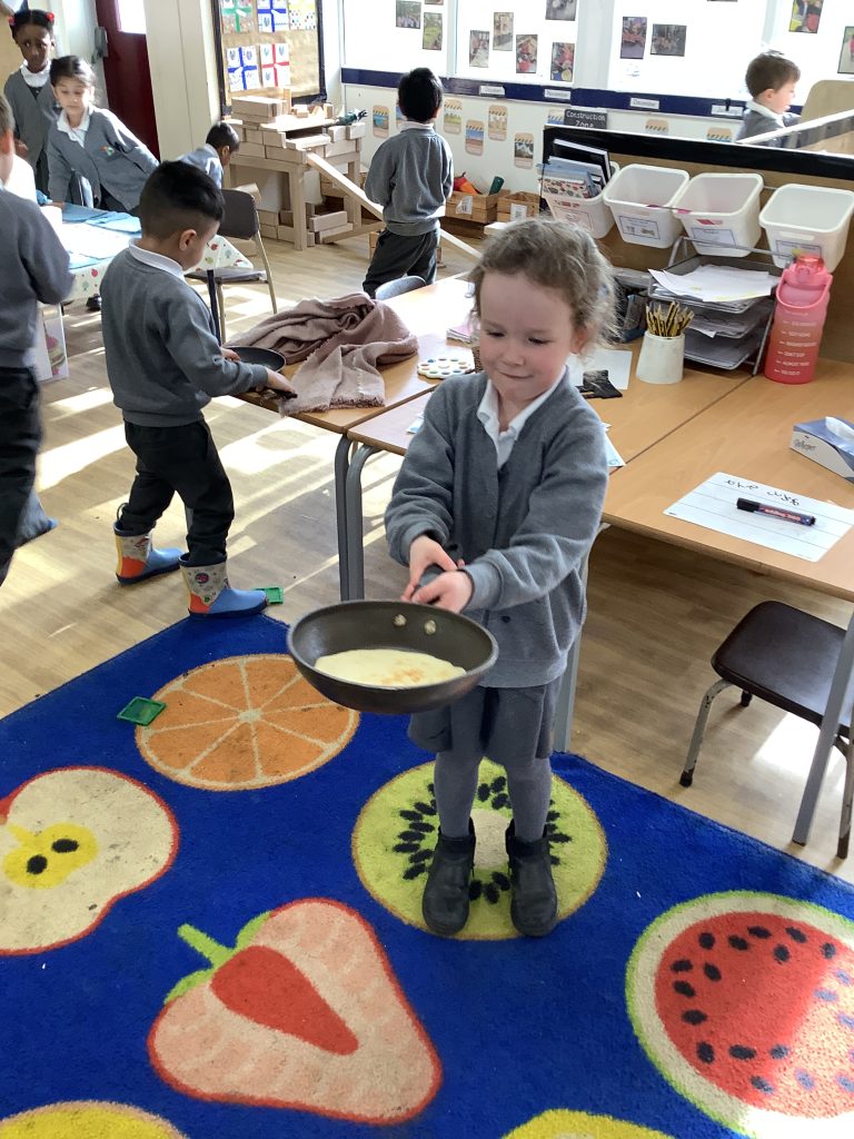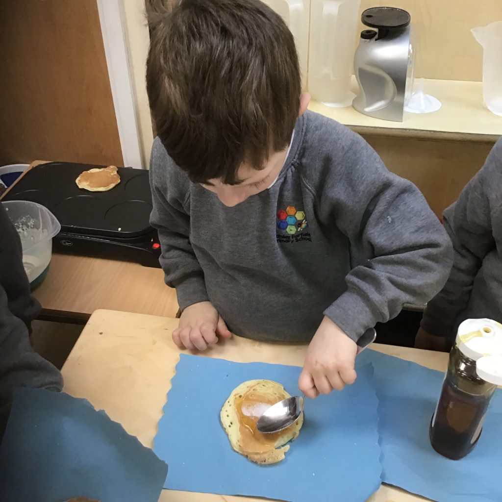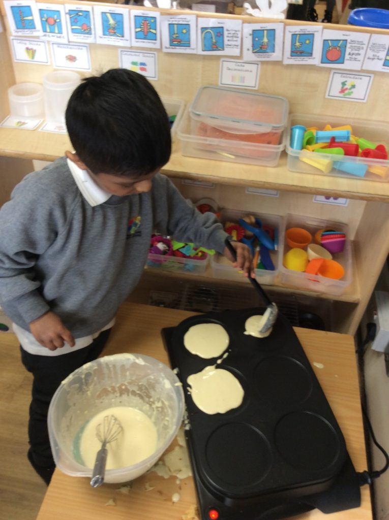 This week we celebrated ‘Shrove Tuesday’. We learnt that we celebrate ‘Pancake day’ because it was a way of Christians using up the ingredients before they gave them up for lent. The children used scales to measure out the ingredients and named the equipment used. They cooked their own pancake and chose their own topping. Both RKT and RPT ‘s favourite topping was syrup and sugar. We had a lot of fun tossing the pancakes and enjoying the book ‘Mr Wolf’s Pancakes’.