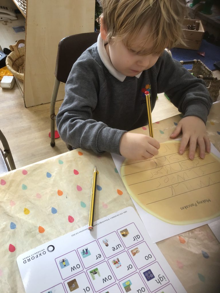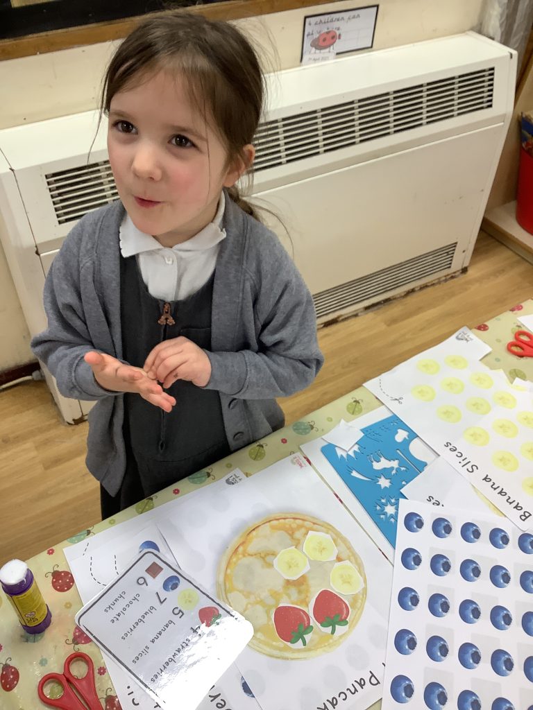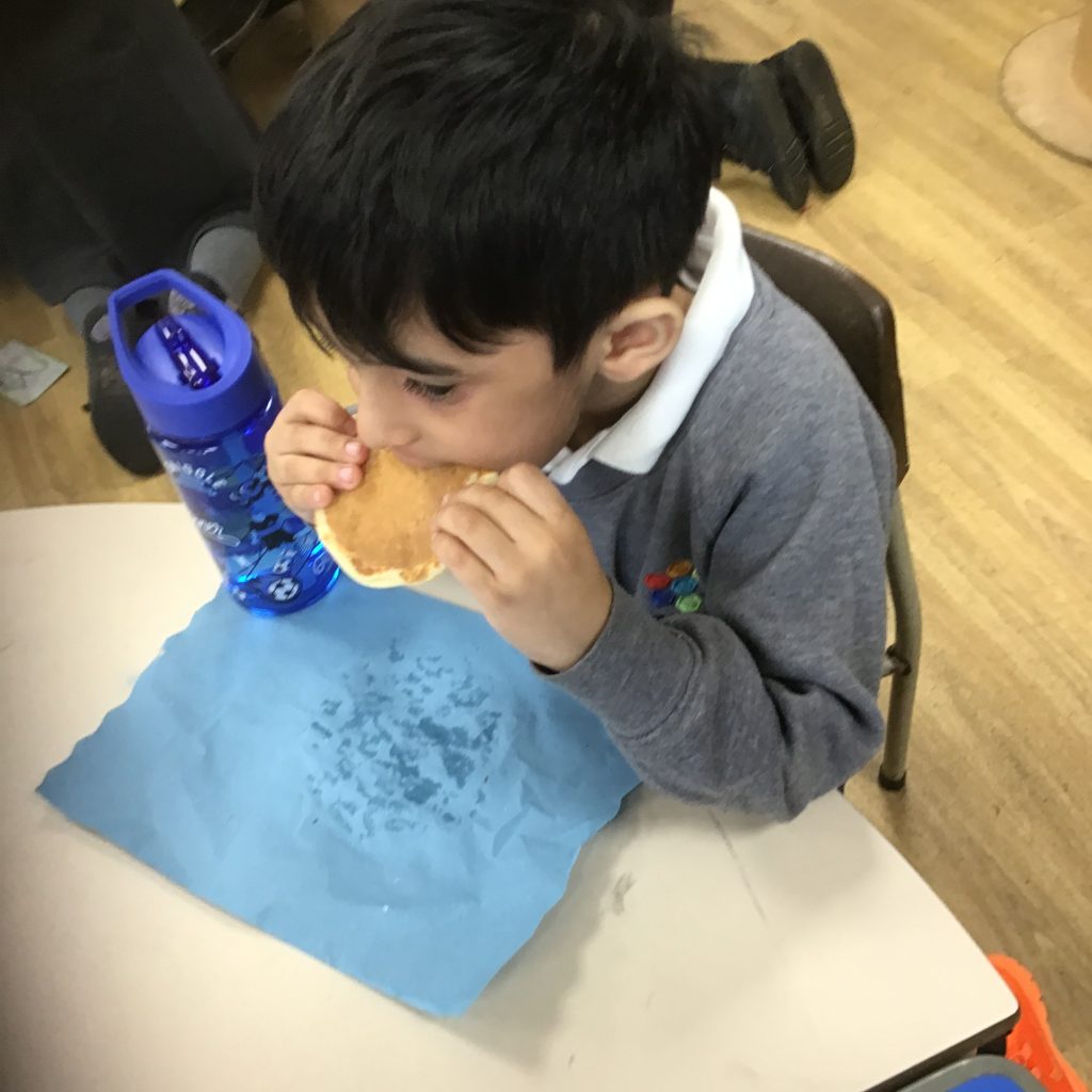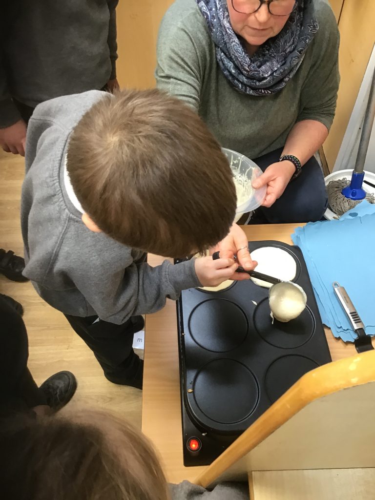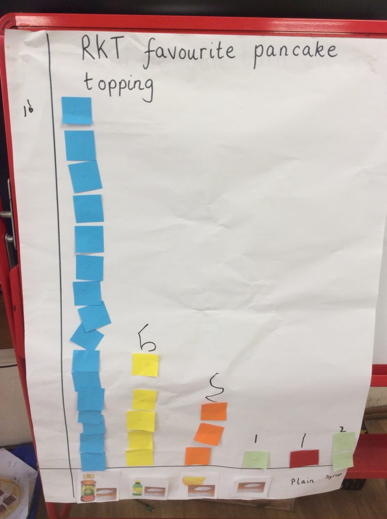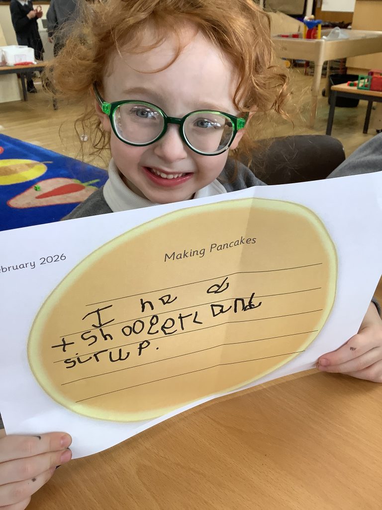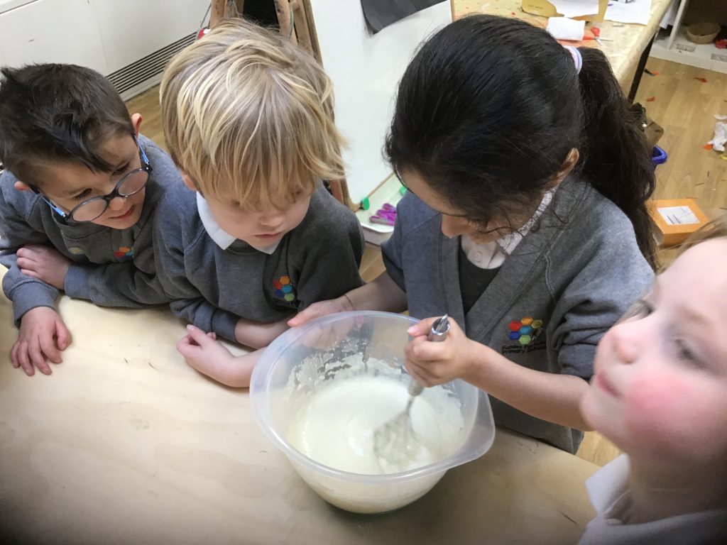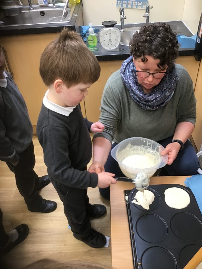 This week we celebrated ‘Shrove Tuesday’. We learnt that we celebrate ‘Pancake day’ because it was a way of Christians using up the ingredients before they gave them up for lent. The children used scales to measure out the ingredients and named the equipment used. They cooked their own pancake and chose their own topping. Both RKT and RPT ‘s favourite topping was syrup and sugar. We had a lot of fun tossing the pancakes and enjoying the book ‘Mr Wolf’s Pancakes’.