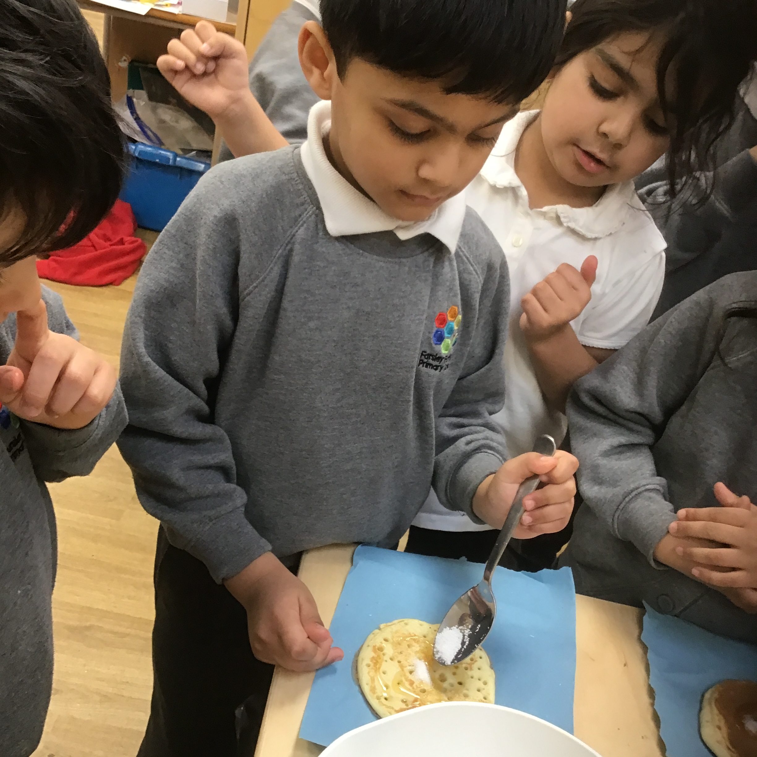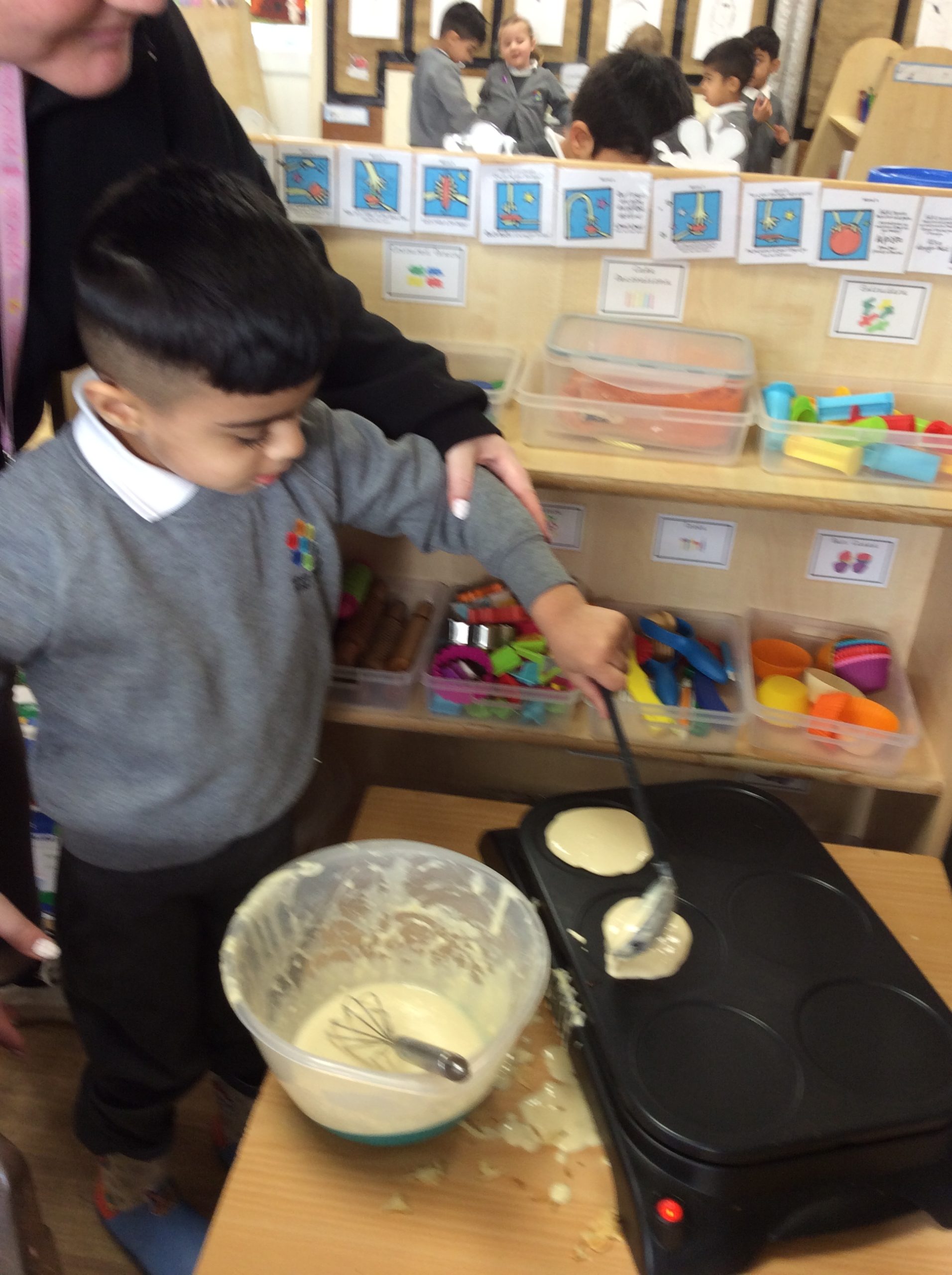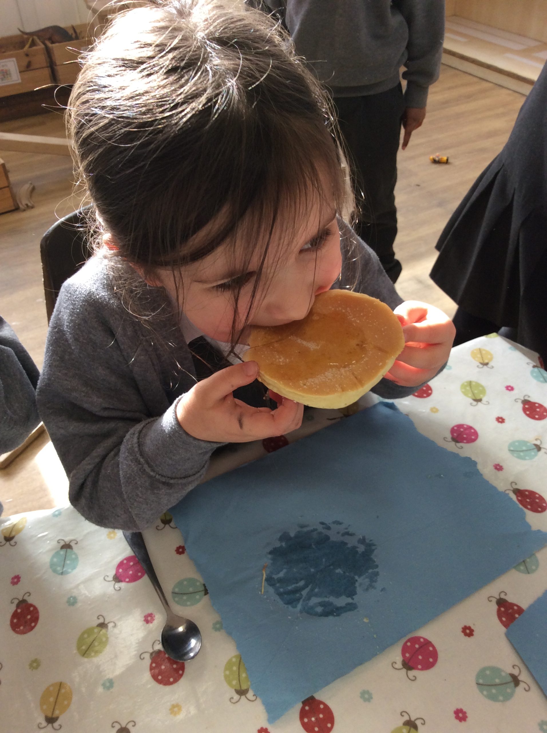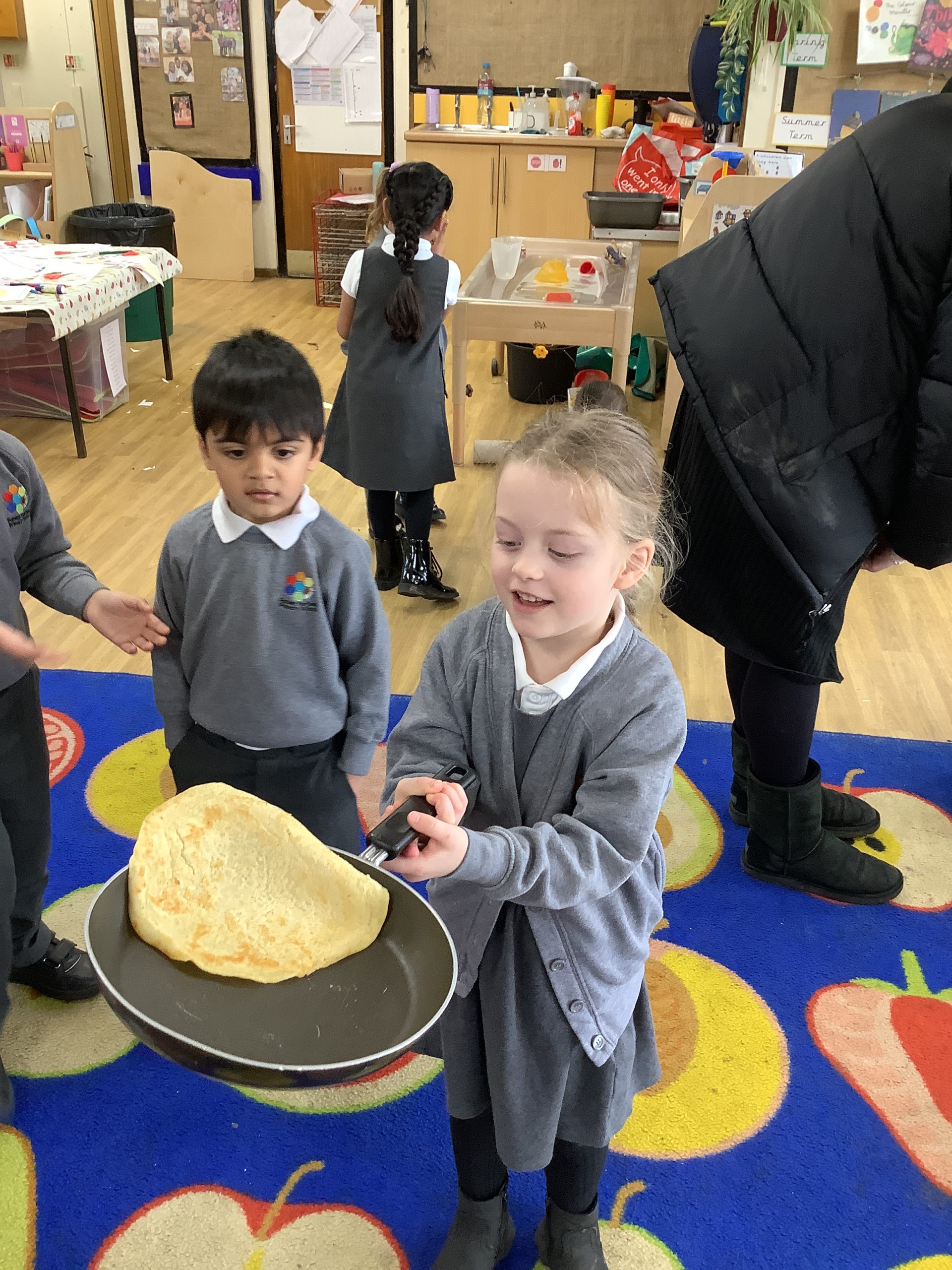 This week we celebrated ‘Shrove Tuesday’. We learnt that we celebrate ‘Pancake day’ because it was a way of Christians using up the ingredients before they gave them up for lent. The children used scales to measure out the ingredients and named the equipment used. They cooked their own pancake and chose their own topping. Both RKT and RPT ‘s favourite topping was syrup and sugar. We had a lot of fun tossing the pancakes and enjoying the book ‘Mr Wolf’s Pancakes’.