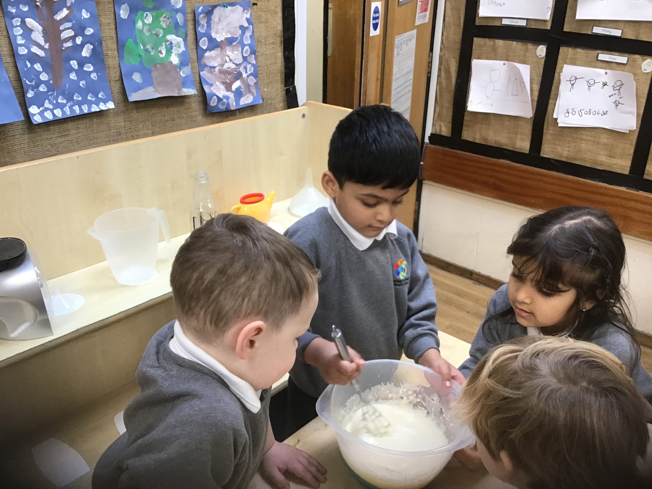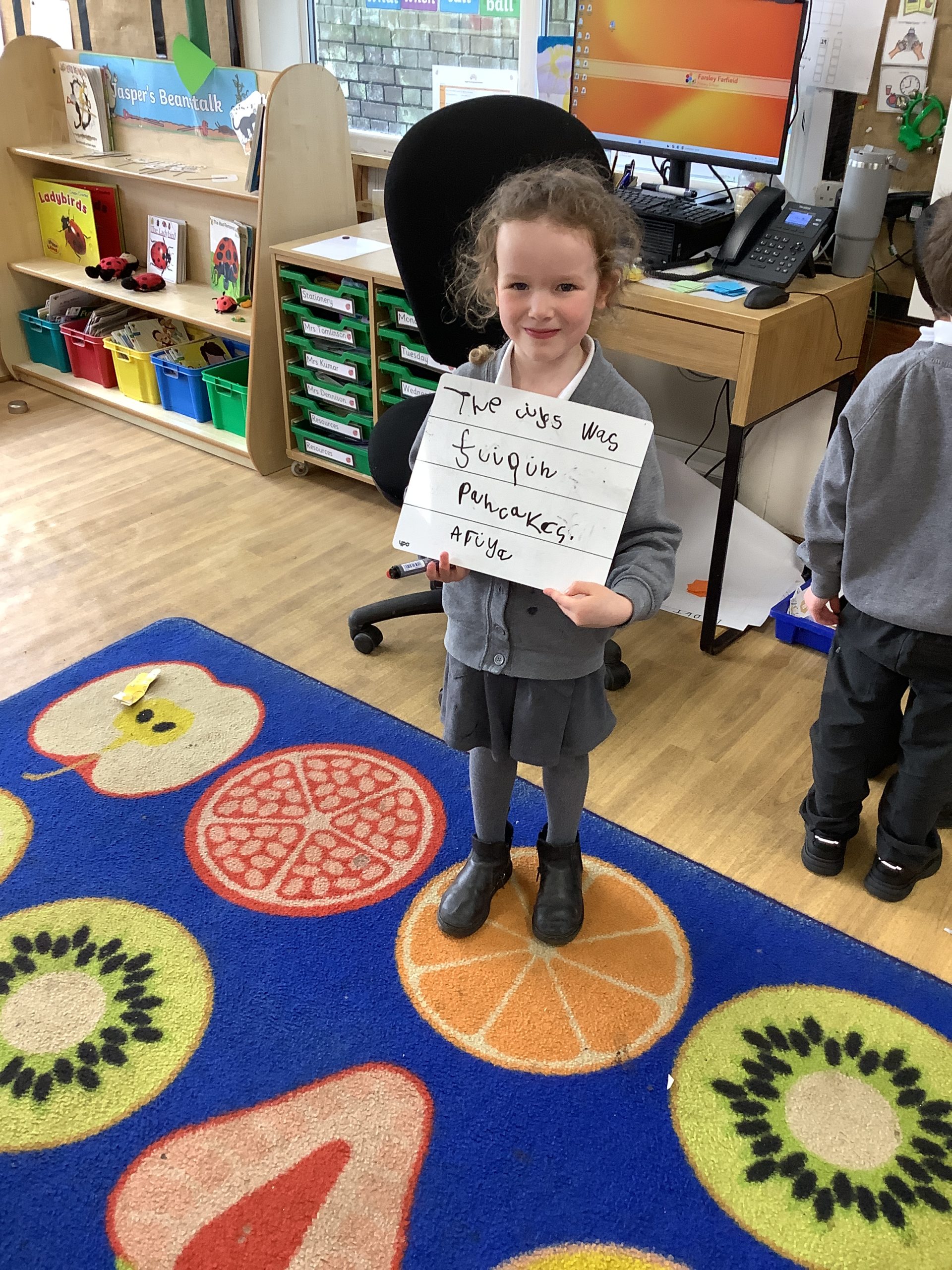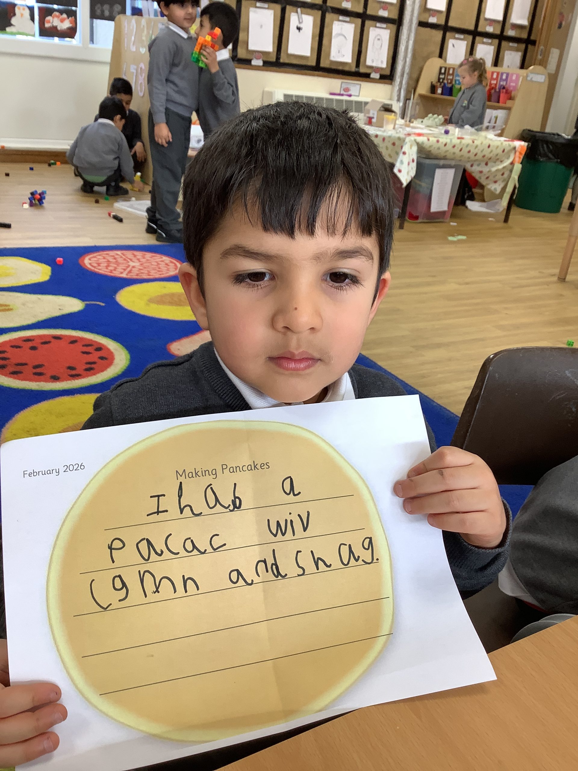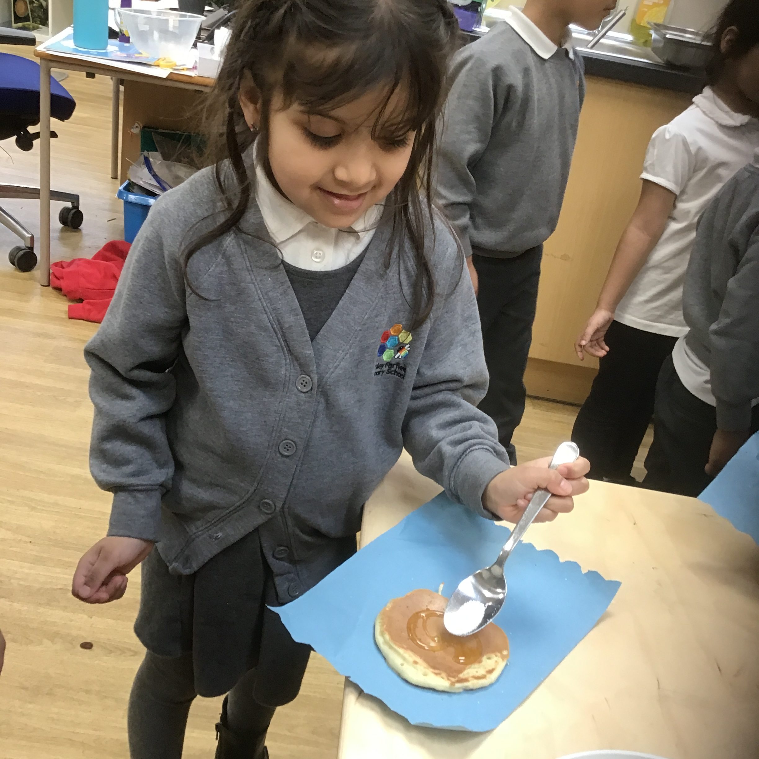 This week we celebrated ‘Shrove Tuesday’. We learnt that we celebrate ‘Pancake day’ because it was a way of Christians using up the ingredients before they gave them up for lent. The children used scales to measure out the ingredients and named the equipment used. They cooked their own pancake and chose their own topping. Both RKT and RPT ‘s favourite topping was syrup and sugar. We had a lot of fun tossing the pancakes and enjoying the book ‘Mr Wolf’s Pancakes’.