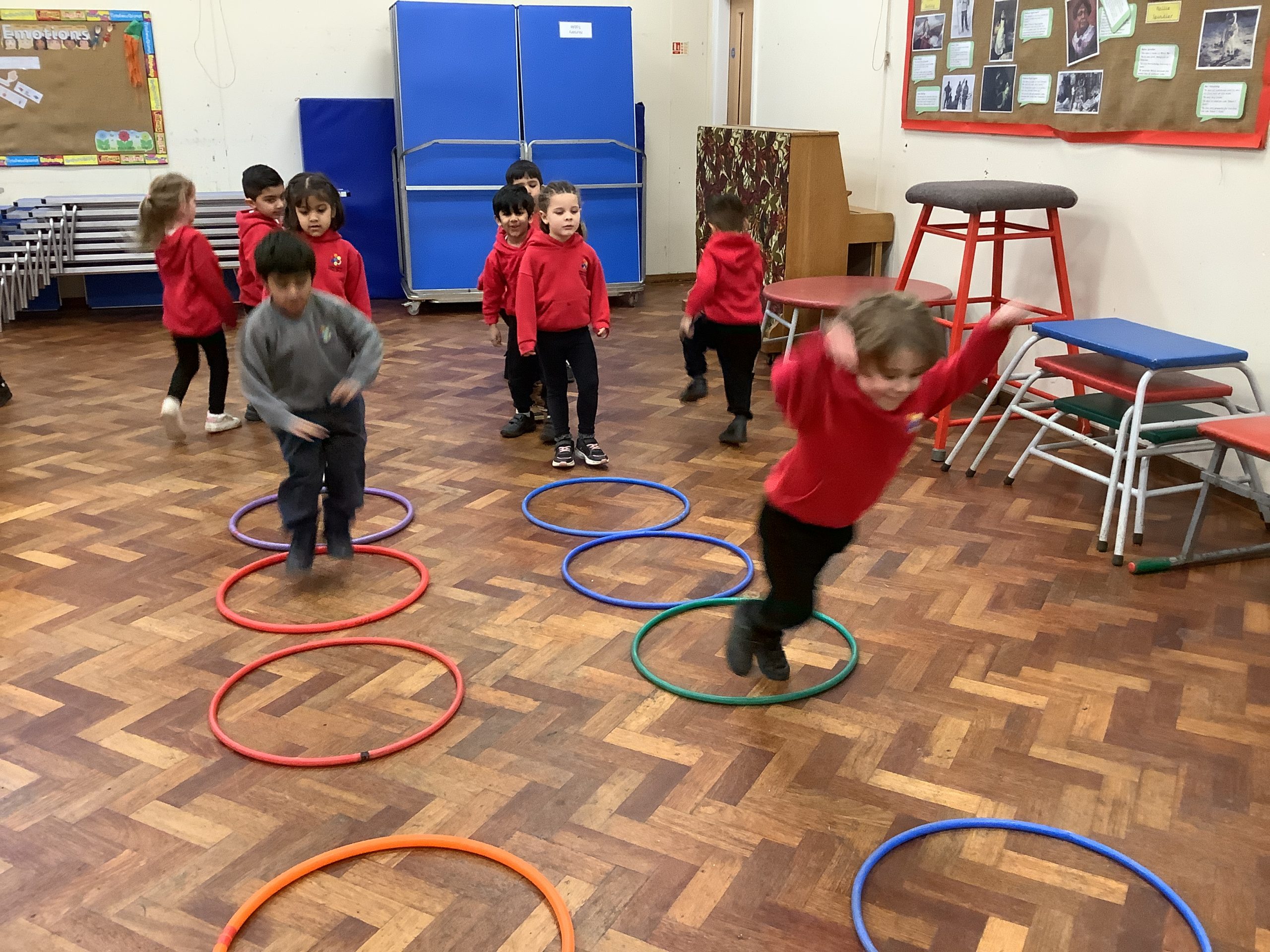 In PE we started our unit on running and jumping. The children did a great job navigating the hall without bumping into others, and they tried very hard to jump with both feet at the same time.