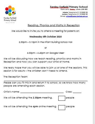 Every child should have brought home a letter informing you about our Reading and Maths meeting. The meeting takes place on Wednesday 8th October at 2.30pm (North Hall) and online at 6pm. We really recommend everyone attends one of these meetings as we will be talking about our new phonics scheme – ELS and how reading will be taught. We will also discuss how we teach Maths and what it looks like in our classrooms.