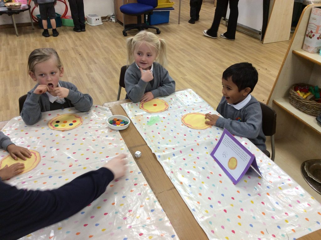 The children have done lots of counting activities this week. They have reinforced their understanding of cardinality – that the last number in the count tells us ‘how many’ things there are altogether in a set of objects. They have also deepened their understanding of the number 5 and used a die frame.