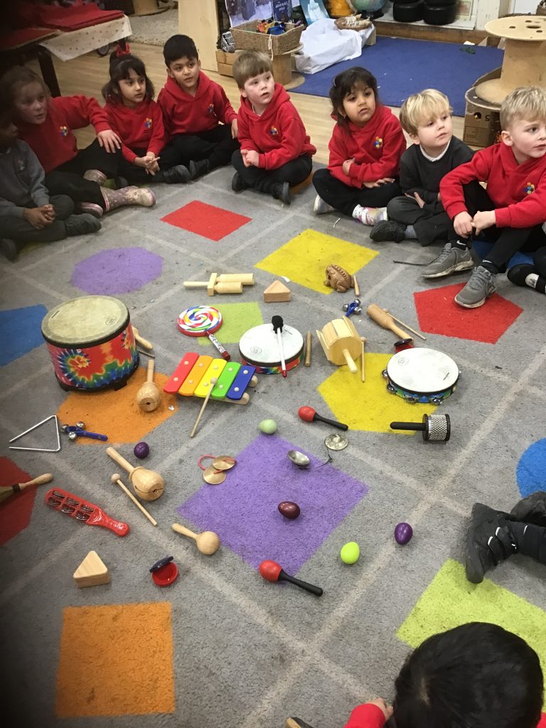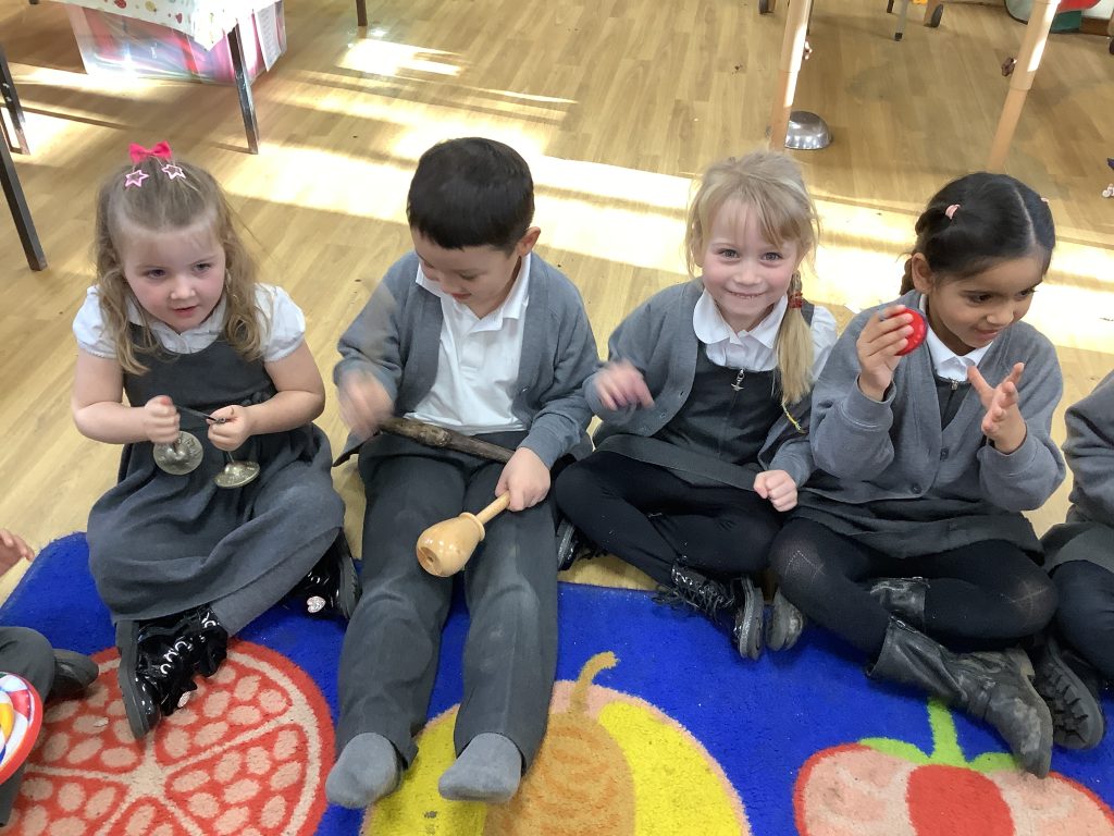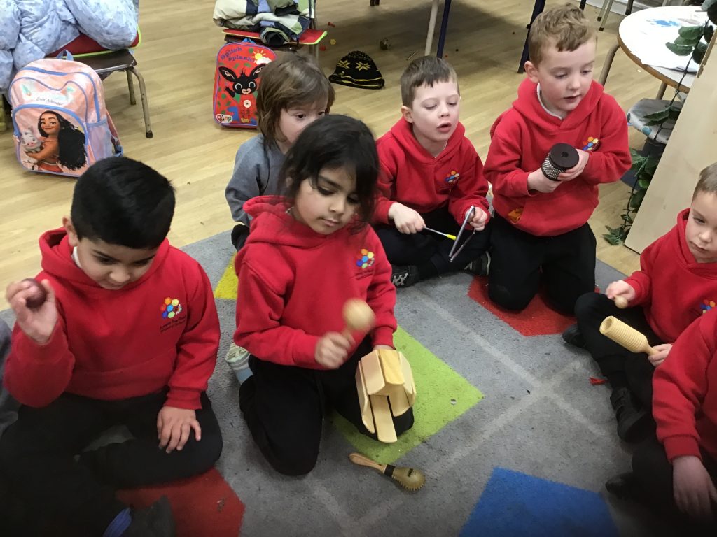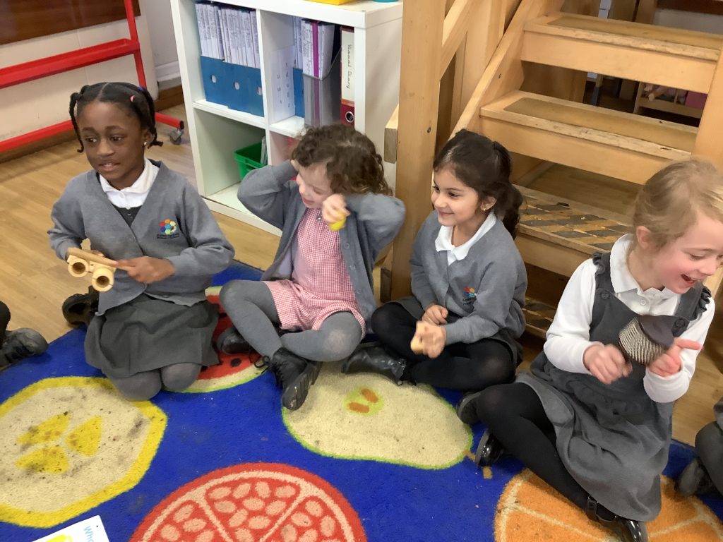 This half term in music the children are learning new songs, one is called ‘Have you brought your talking voices?’ This is encouraging the children to use different voices to develop their pitch. ‘5 little monkeys’ this is an action song so we are encouraging the children to watch and follow the leader with the words, pitch and actions.