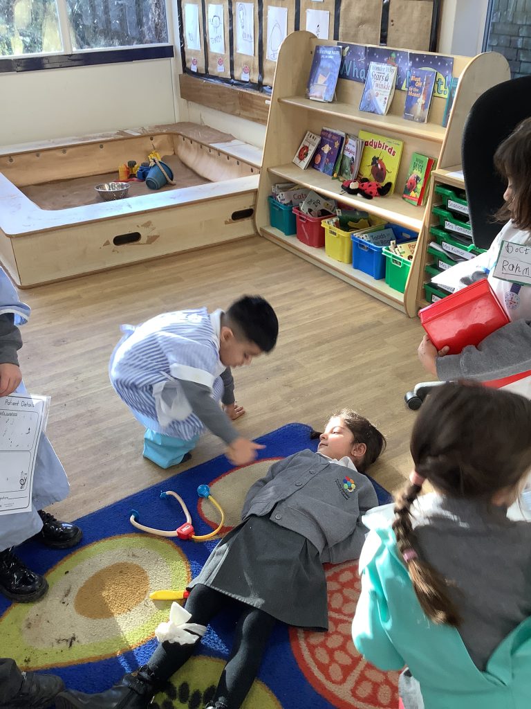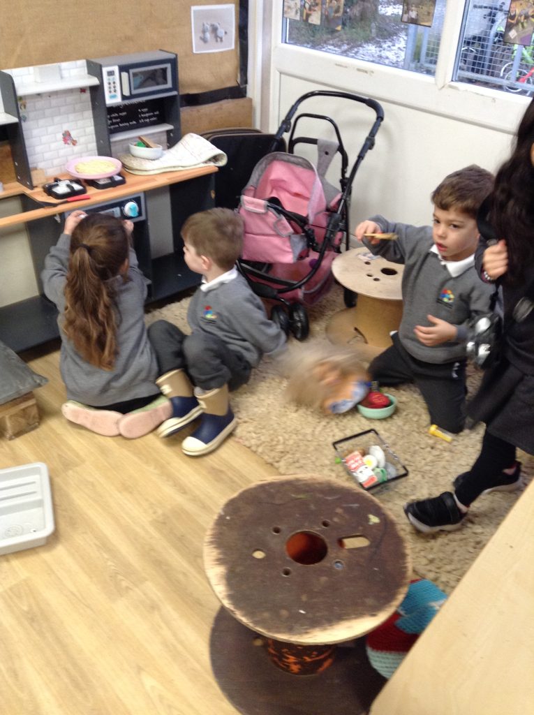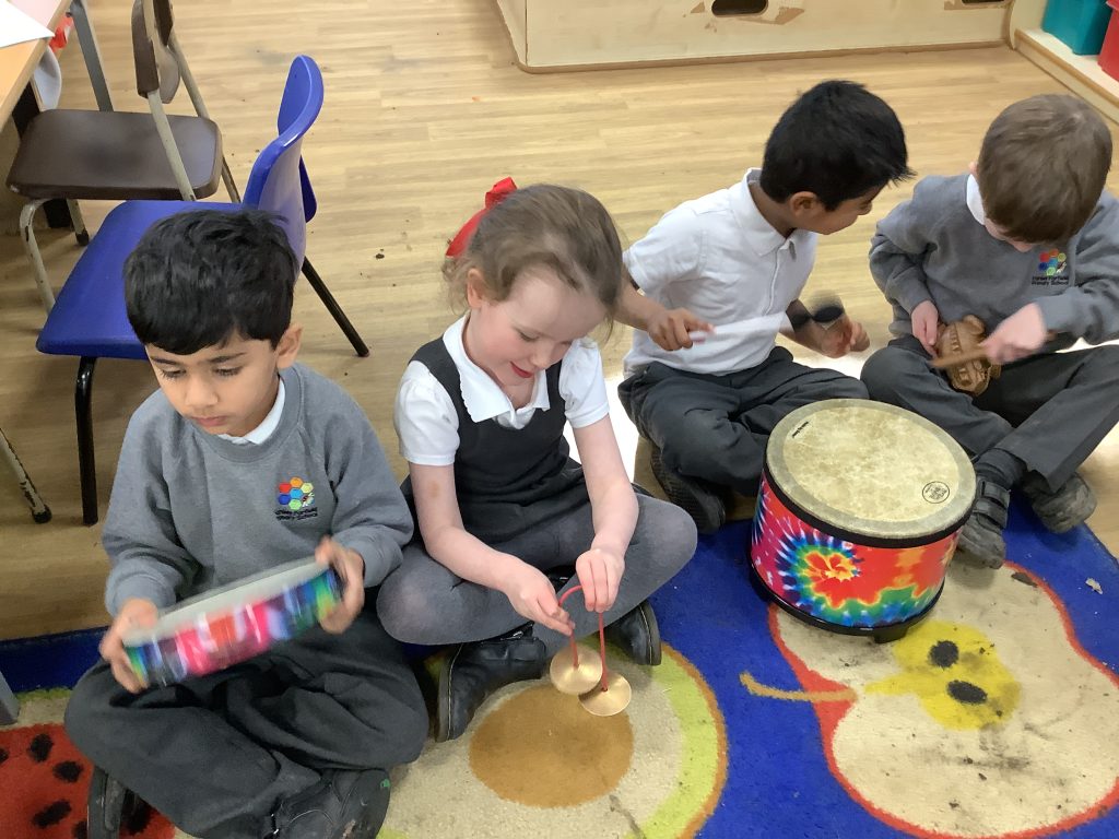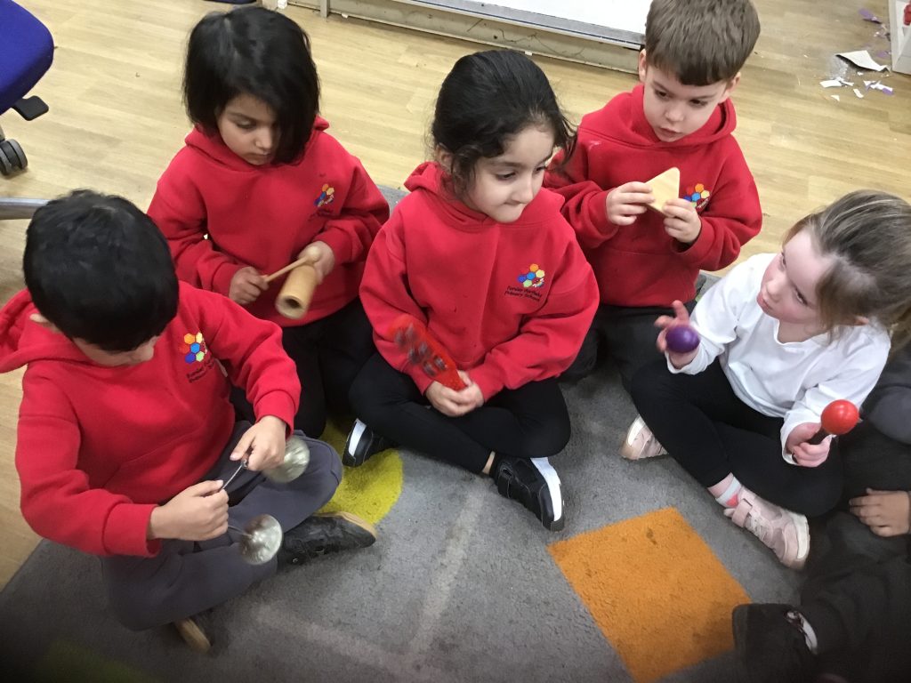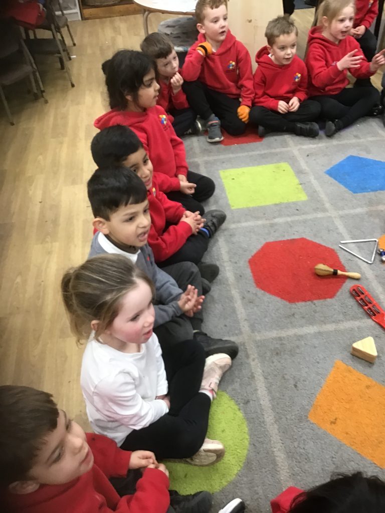 This half term in music the children are learning new songs, one is called ‘Have you brought your talking voices?’ This is encouraging the children to use different voices to develop their pitch. ‘5 little monkeys’ this is an action song so we are encouraging the children to watch and follow the leader with the words, pitch and actions.