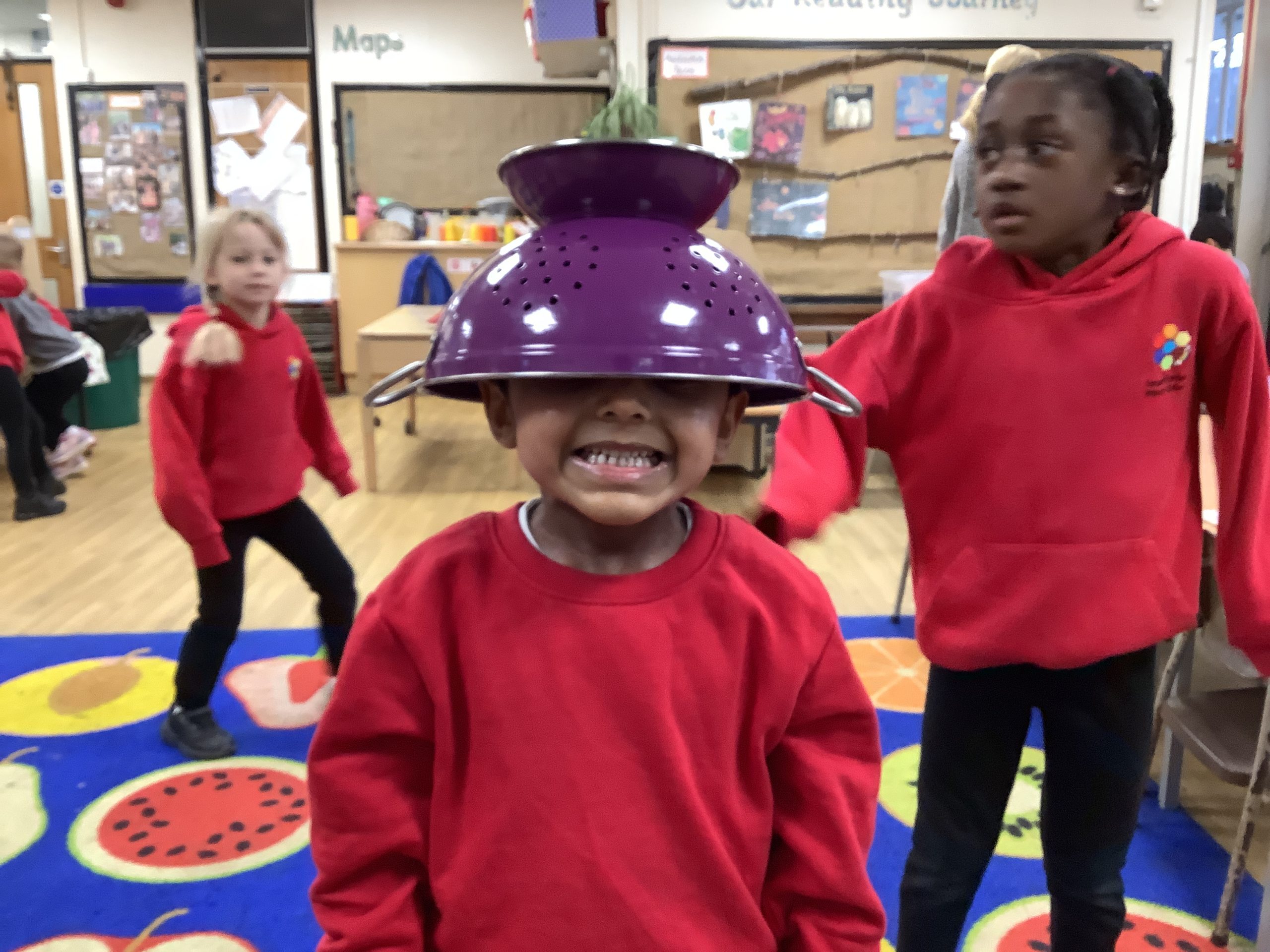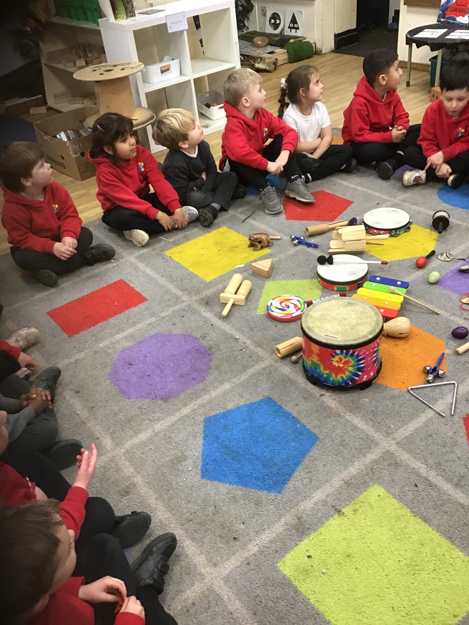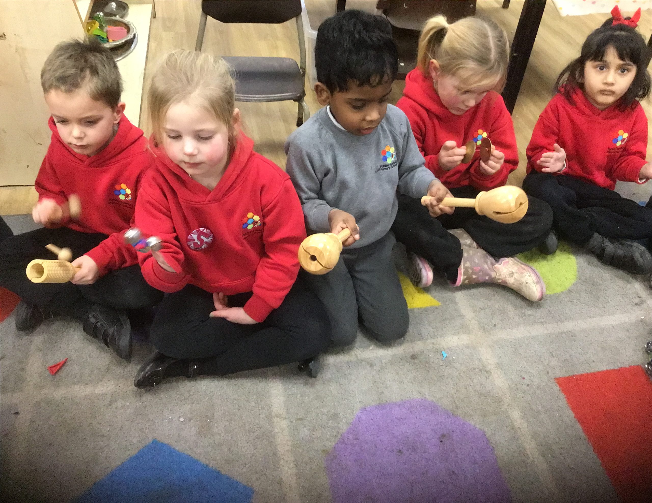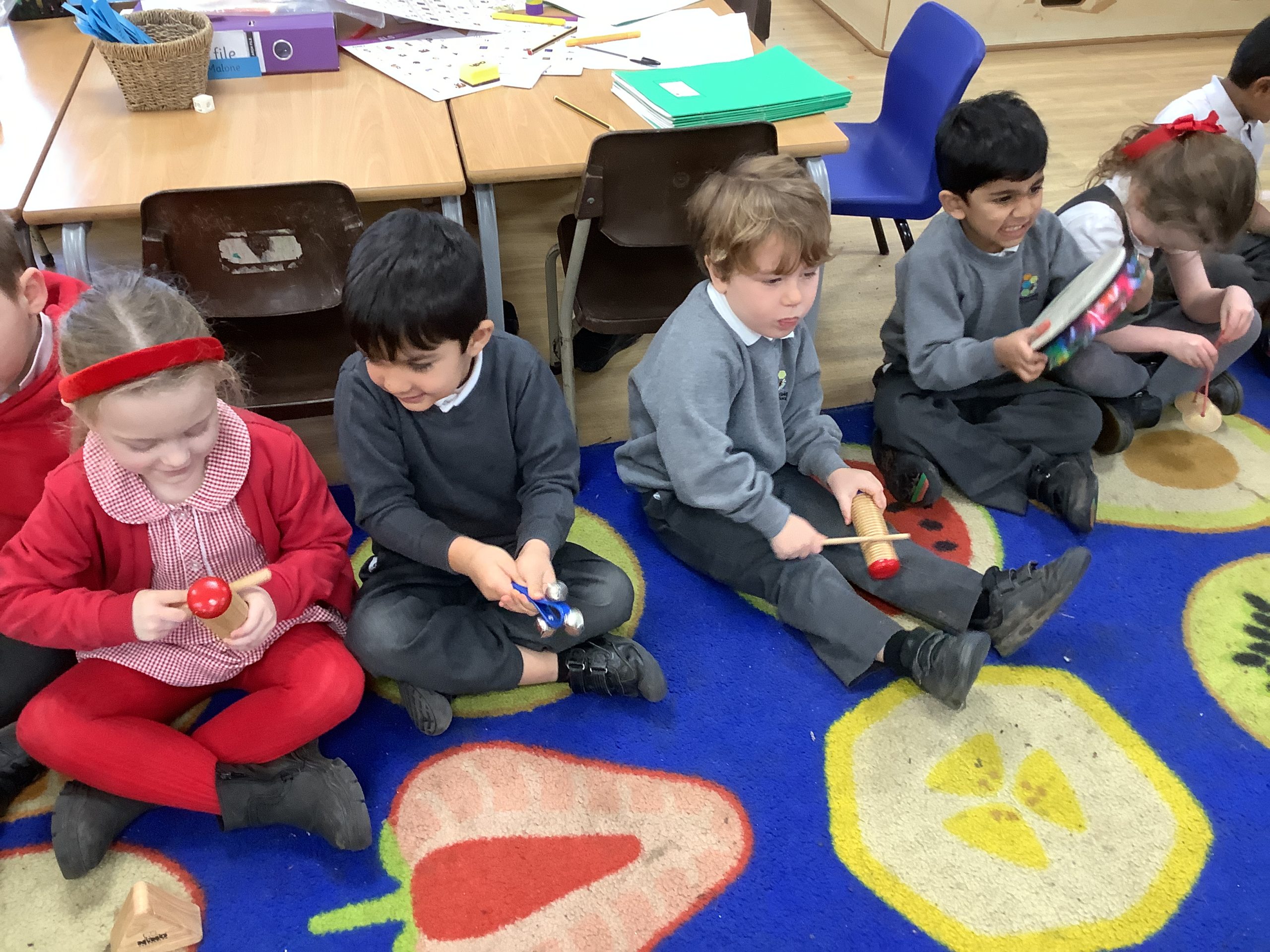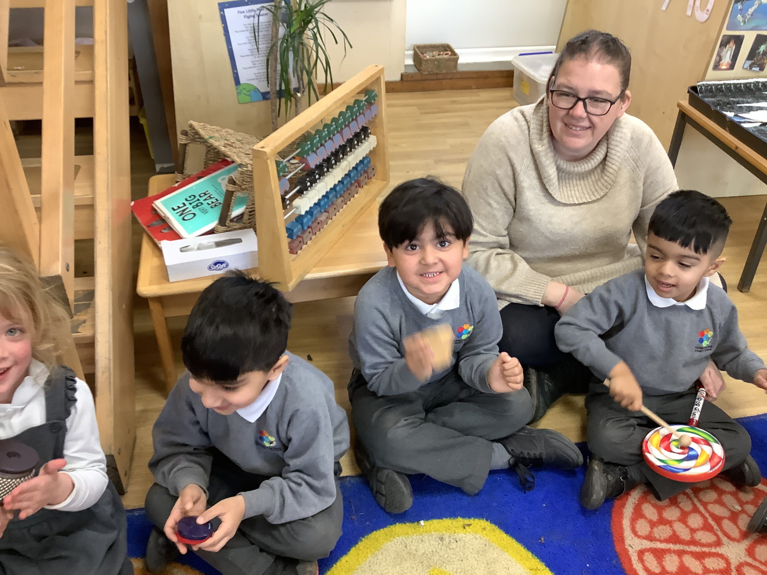 This half term in music the children are learning new songs, one is called ‘Have you brought your talking voices?’ This is encouraging the children to use different voices to develop their pitch. ‘5 little monkeys’ this is an action song so we are encouraging the children to watch and follow the leader with the words, pitch and actions.