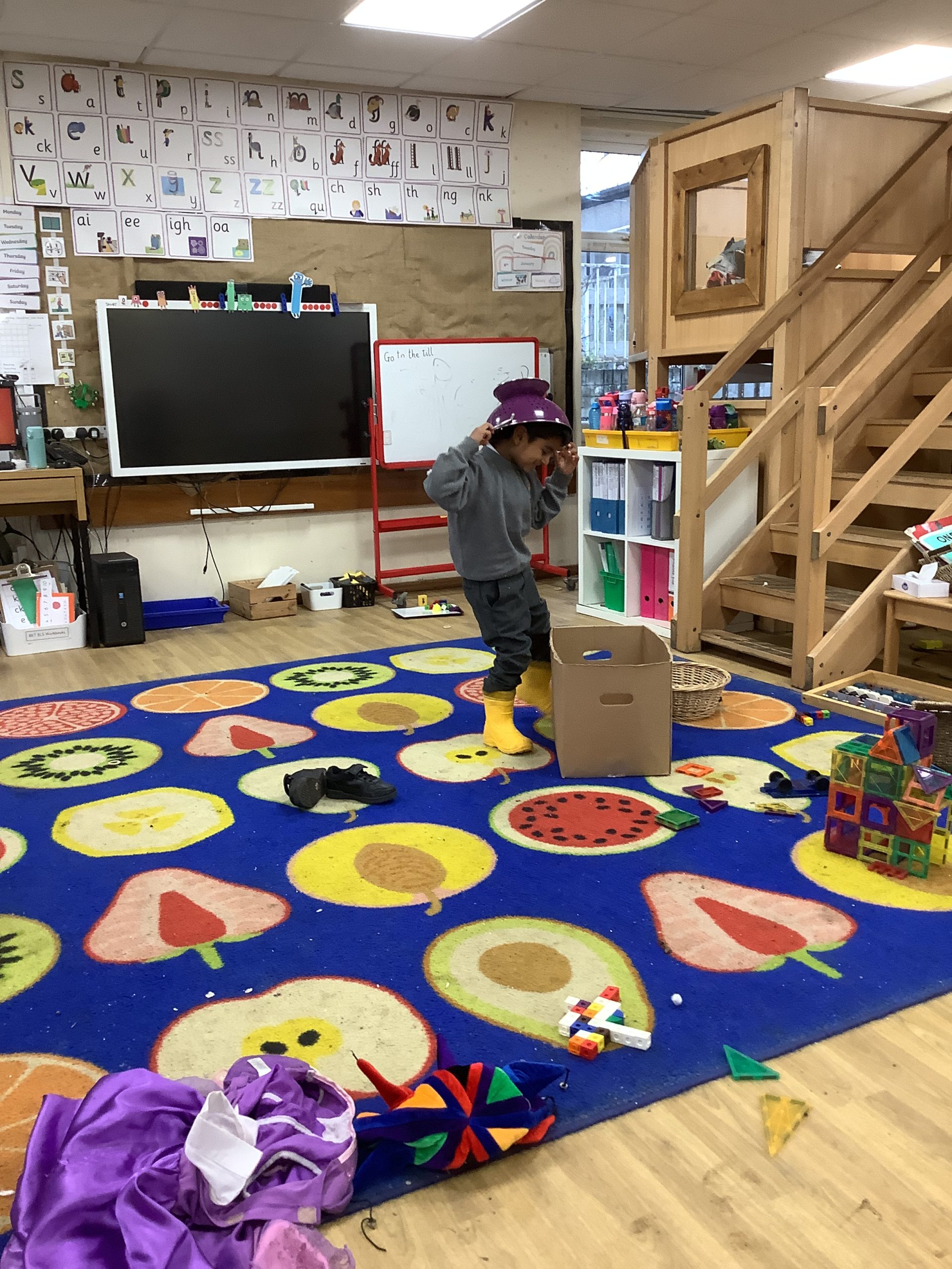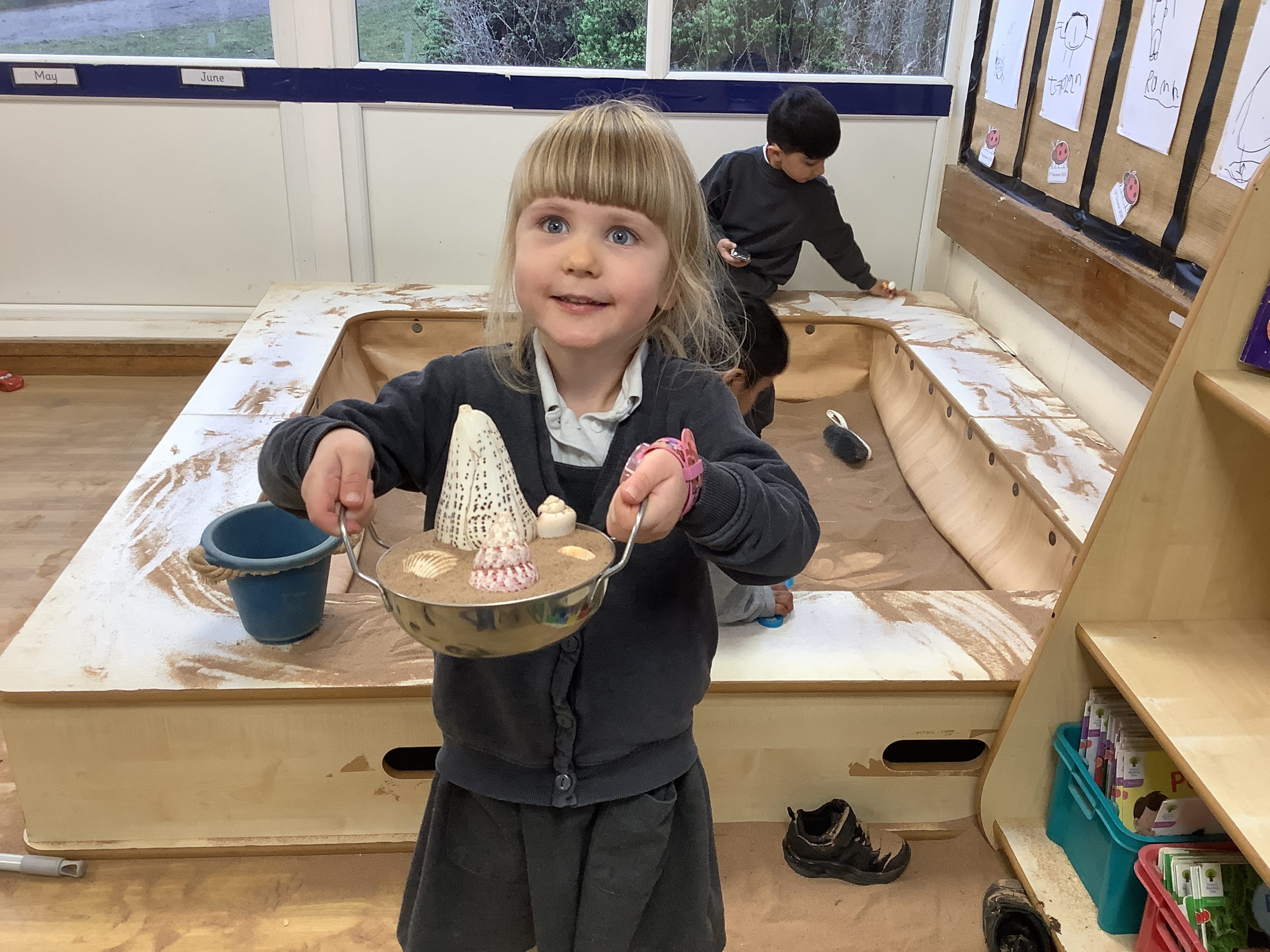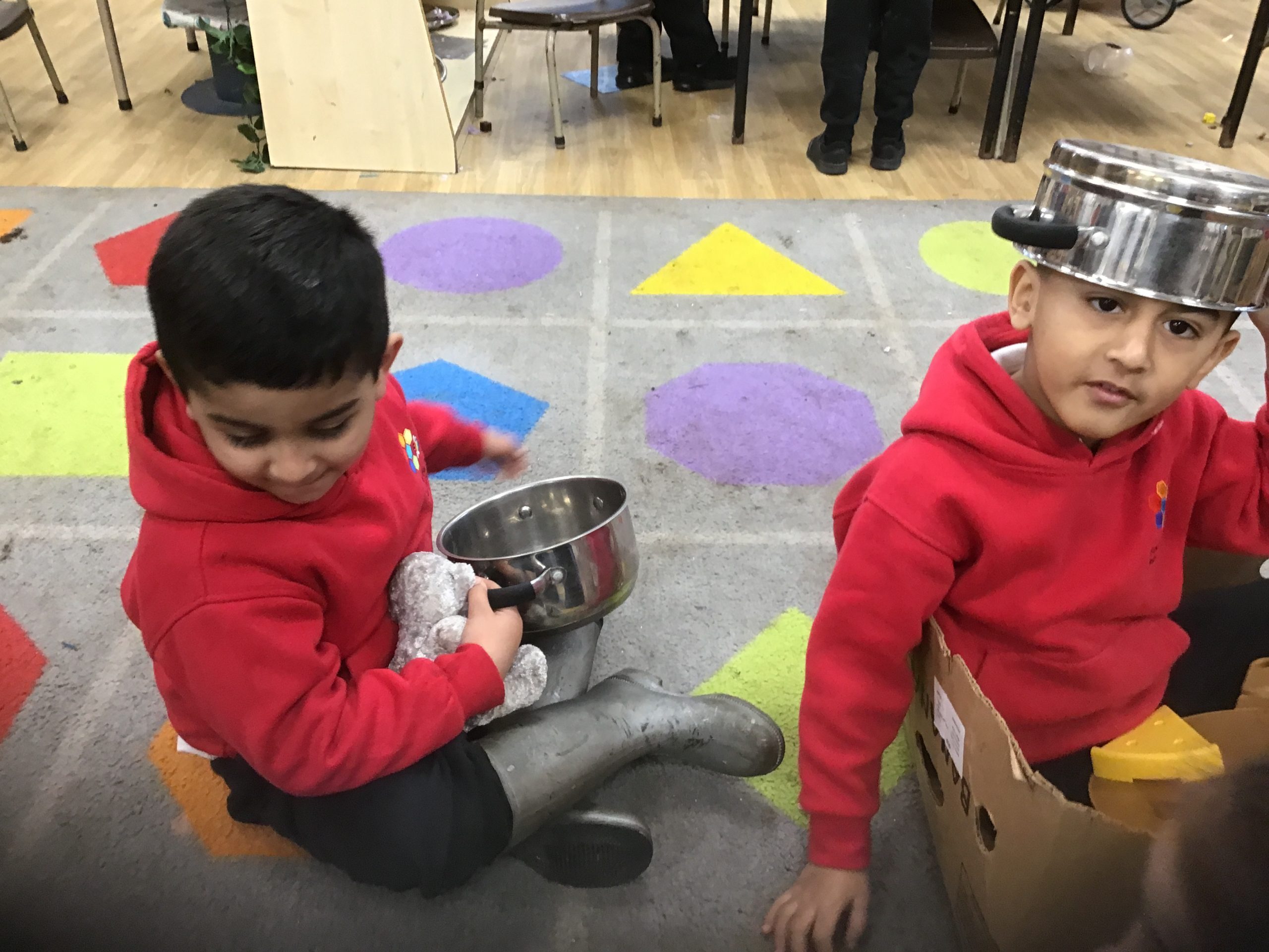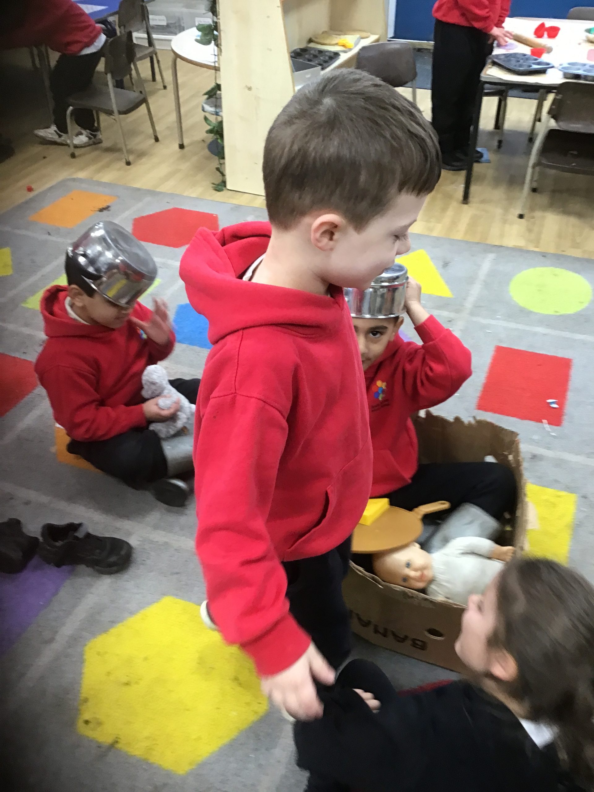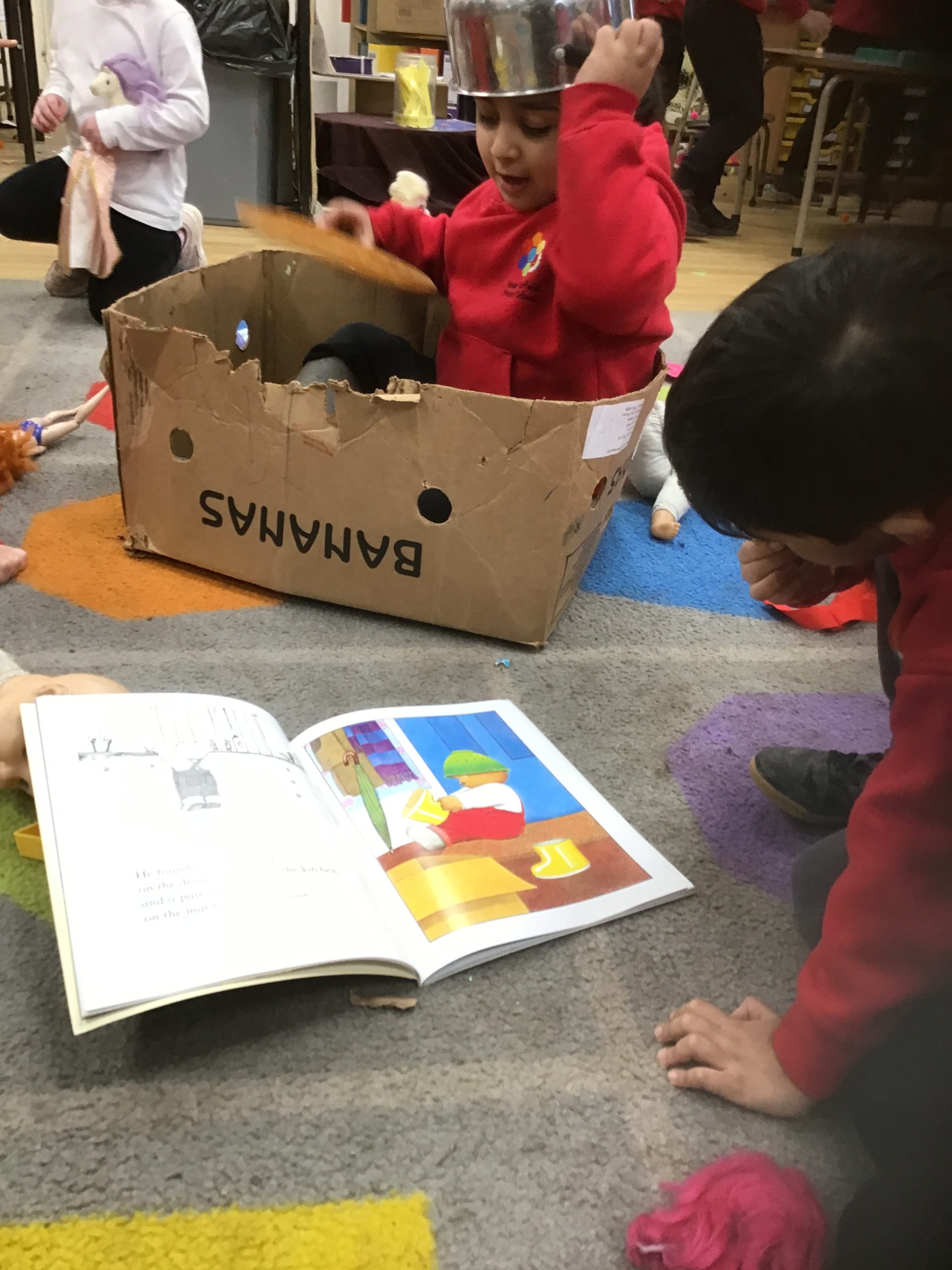 This half term in music the children are learning new songs, one is called ‘Have you brought your talking voices?’ This is encouraging the children to use different voices to develop their pitch. ‘5 little monkeys’ this is an action song so we are encouraging the children to watch and follow the leader with the words, pitch and actions.