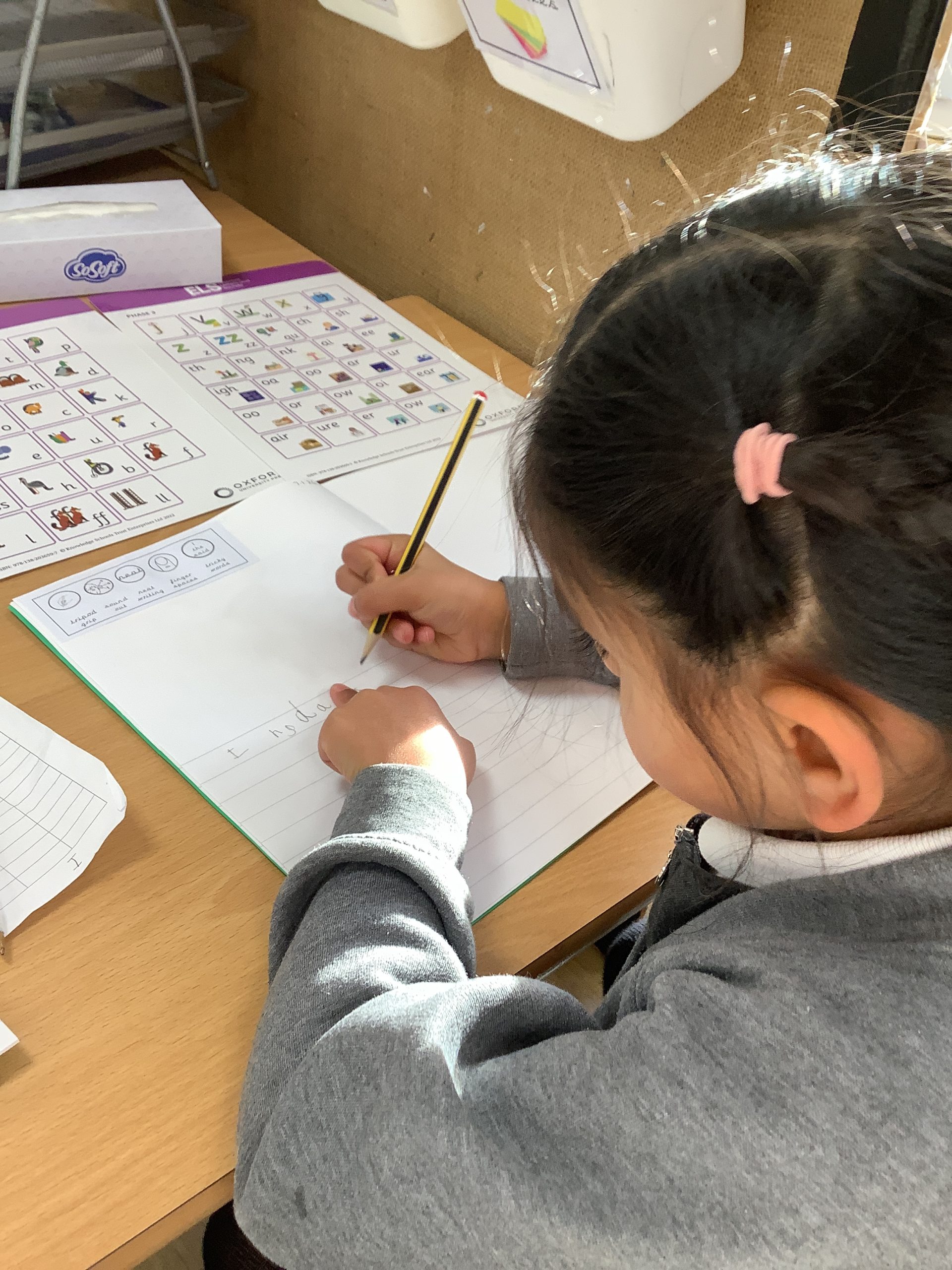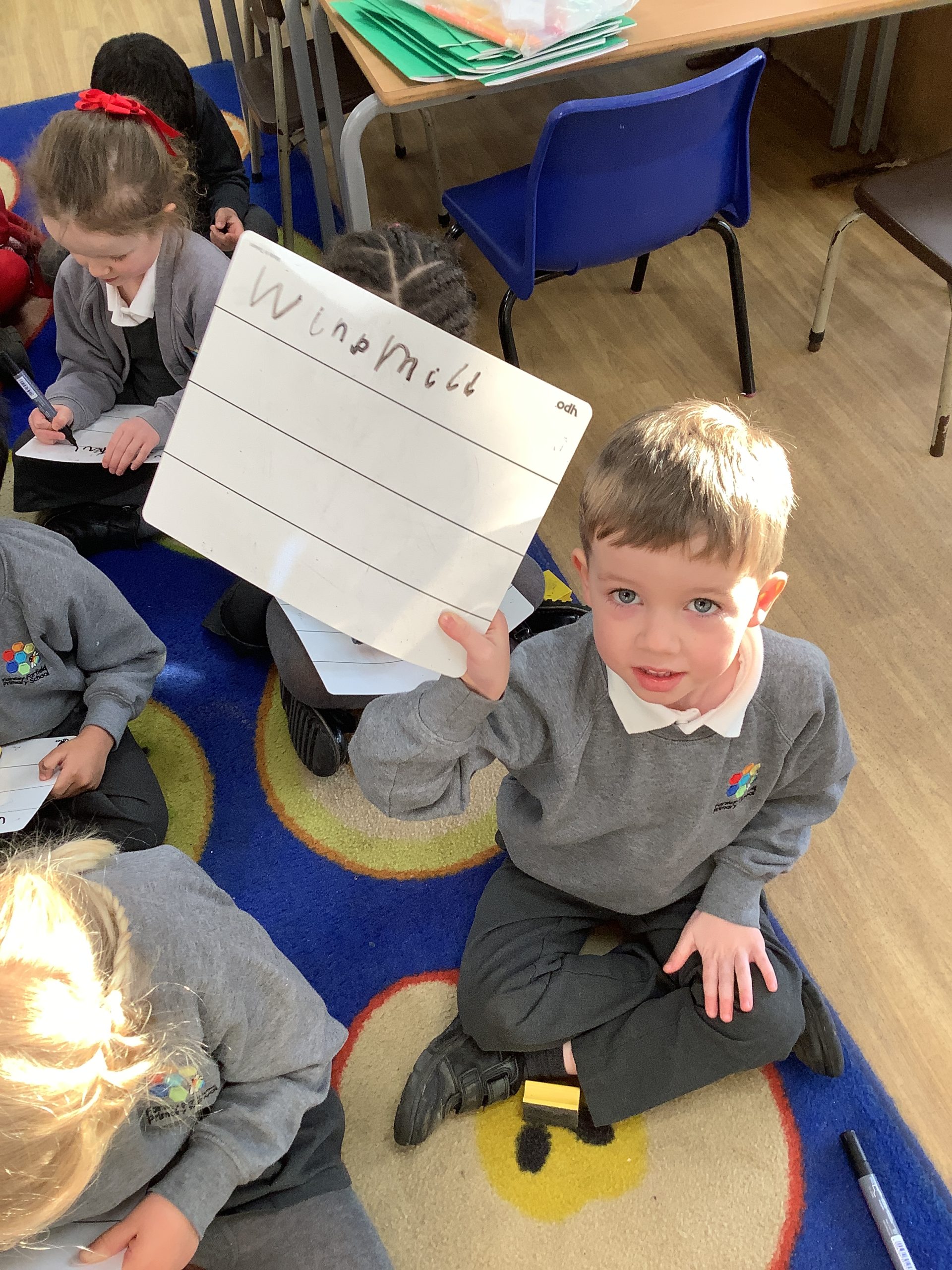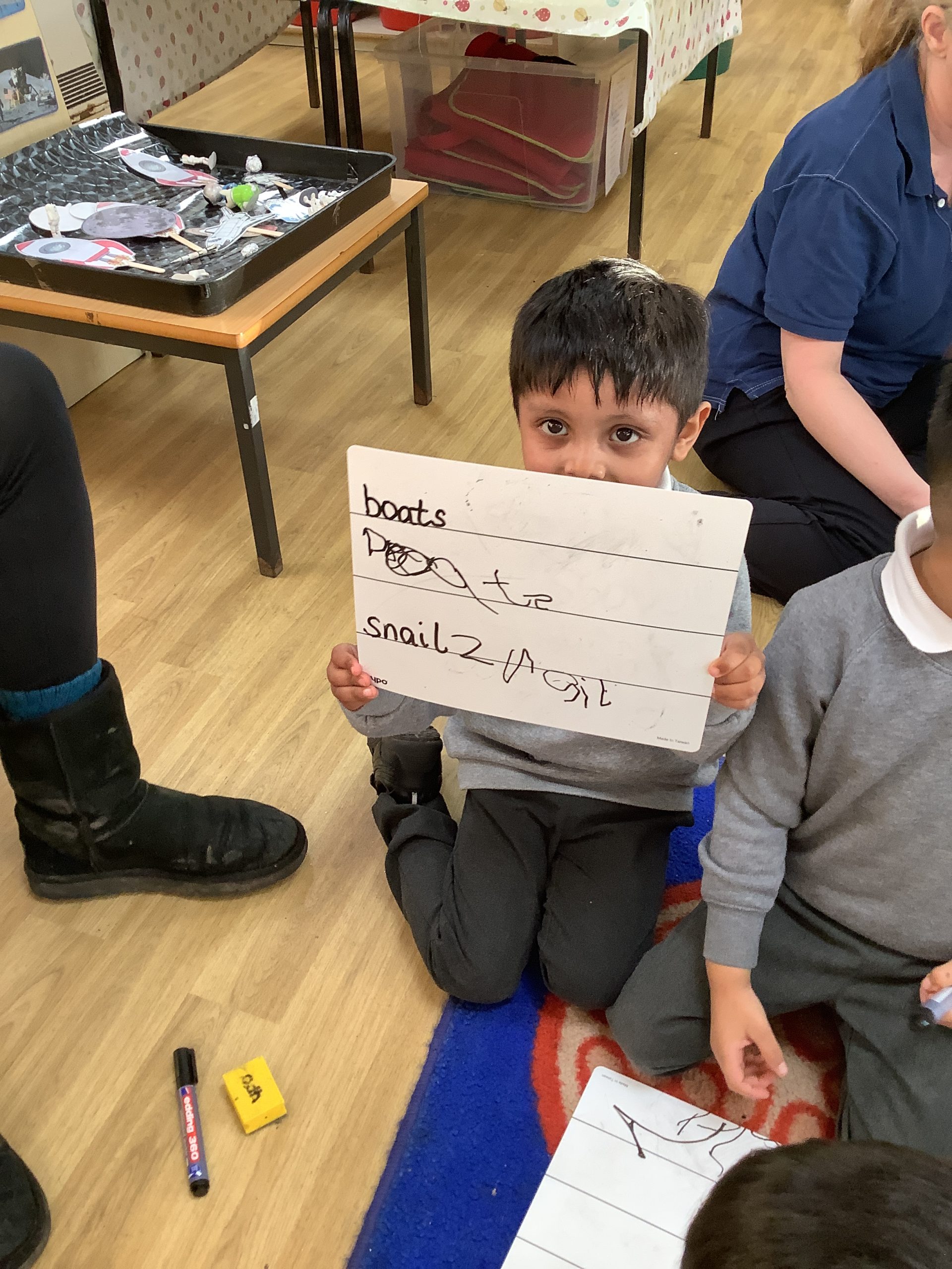 We have been writing about what they did over the school holidays or about a gift they may have received. The children are hearing some of the phonemes at the beginning, middle and end of words and starting to spell hard to read and spell words correctly like the, is, we.