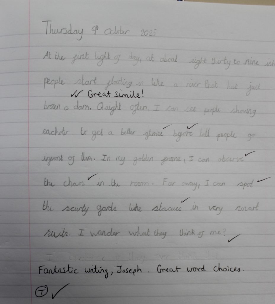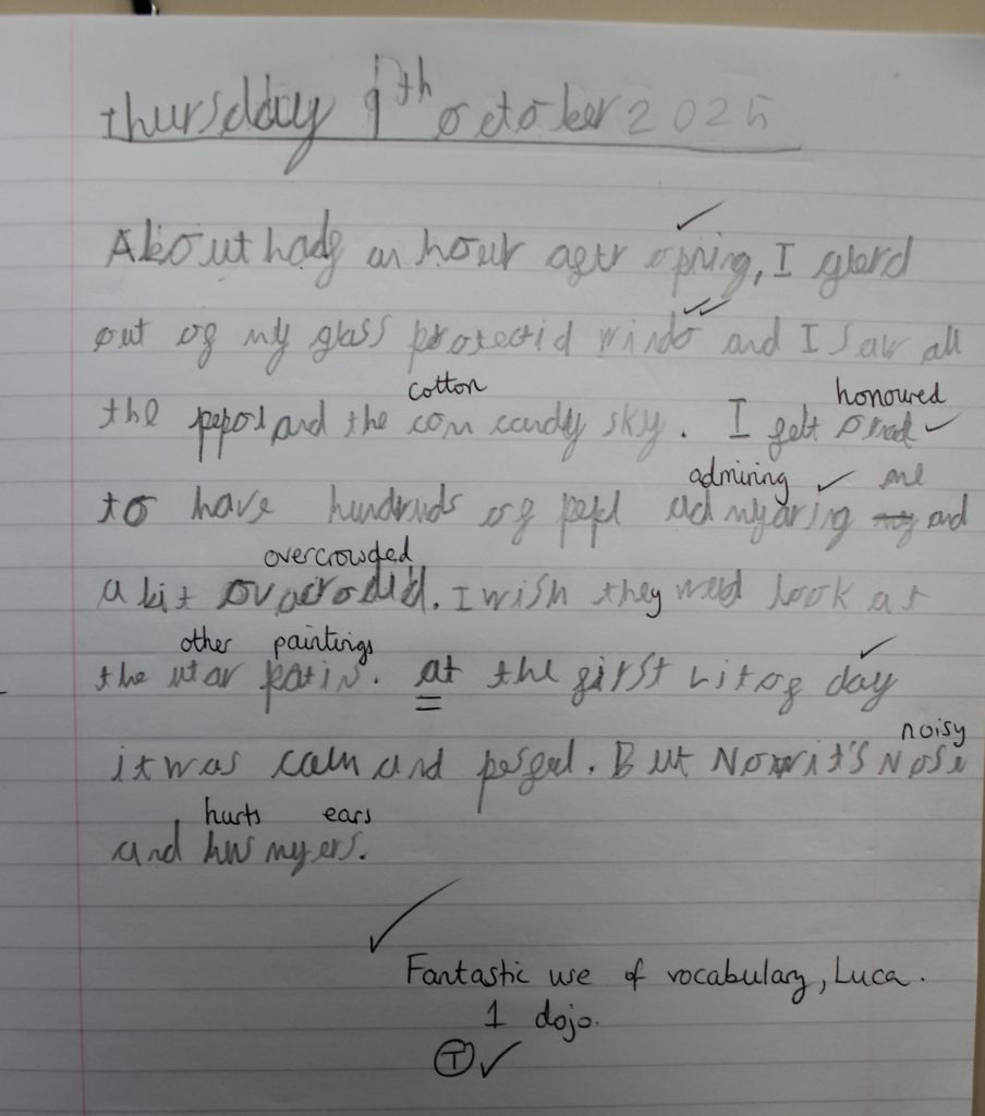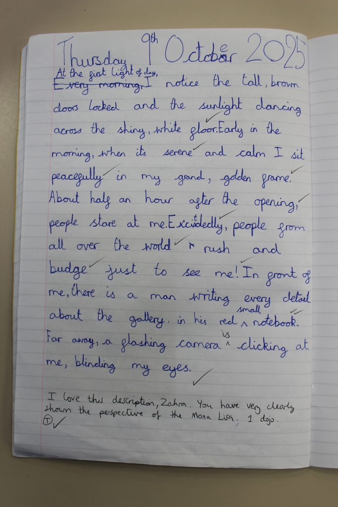 Continuing our learning about perspective, the children produced some fantastic writing this week from the point of view of the Mona Lisa. The children did a super job of describing what they could see and how they felt. Some children thought the Mona Lisa would enjoy being admired by thousands of visitors, while others thought she might feel lonely or bored. We had some brilliant discussions and the children worked really hard on their written pieces.