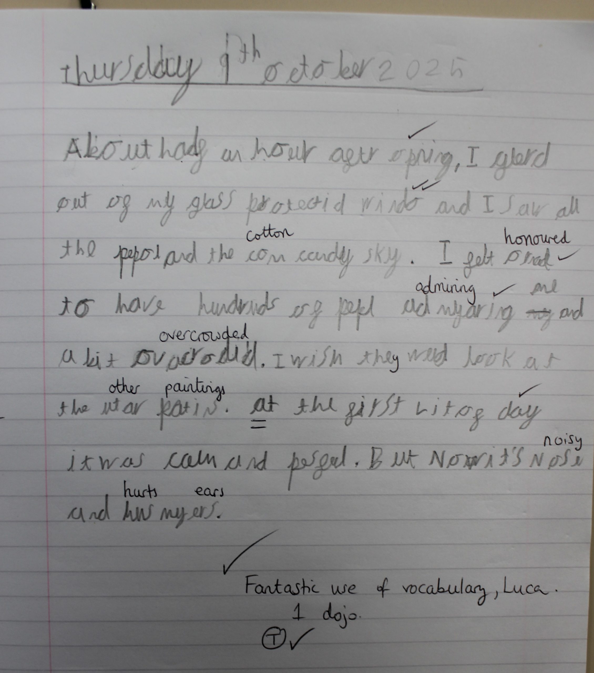 Continuing our learning about perspective, the children produced some fantastic writing this week from the point of view of the Mona Lisa. The children did a super job of describing what they could see and how they felt. Some children thought the Mona Lisa would enjoy being admired by thousands of visitors, while others thought she might feel lonely or bored. We had some brilliant discussions and the children worked really hard on their written pieces.