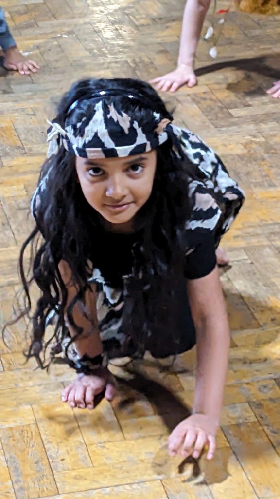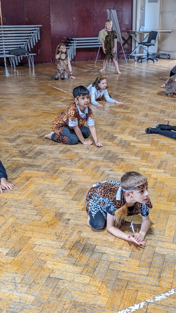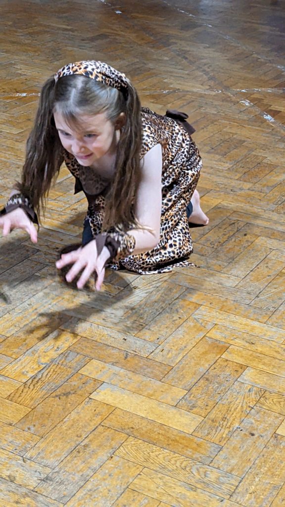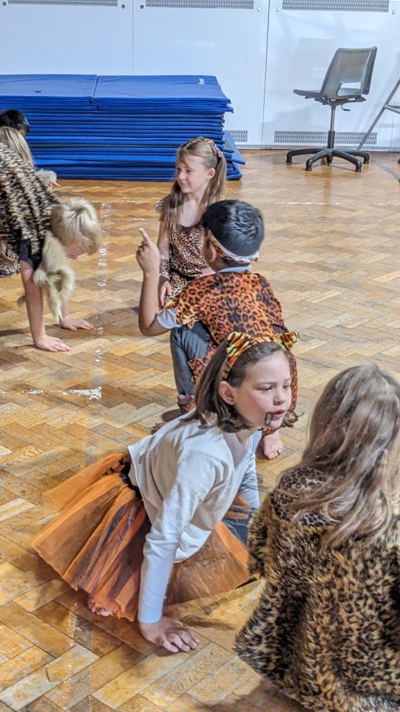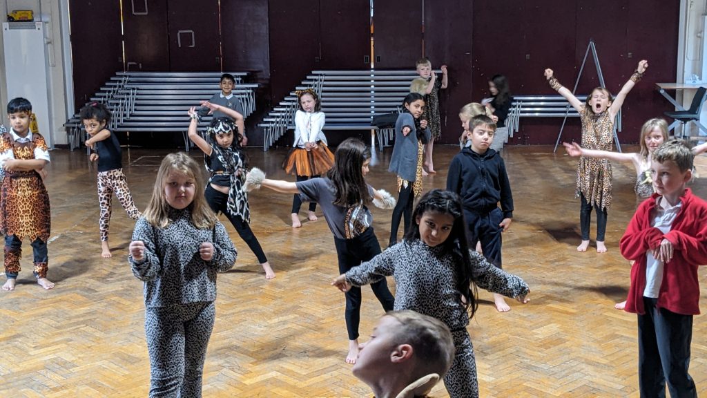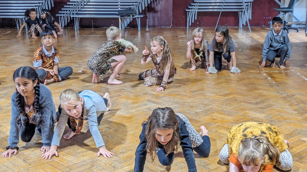 The children imagined themselves living in the Stone Age in our dance session and worked in groups to create short routines inspired by activities from the Stone Age, such as hunting, foraging, making tools and cooking. The children practised travelling in different ways depending on the scenario (e.g. creeping while hunting and stretching tall for foraging) and also created some freeze frames to represent different activities.