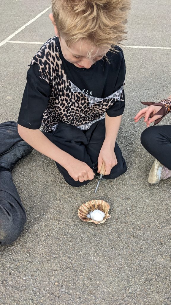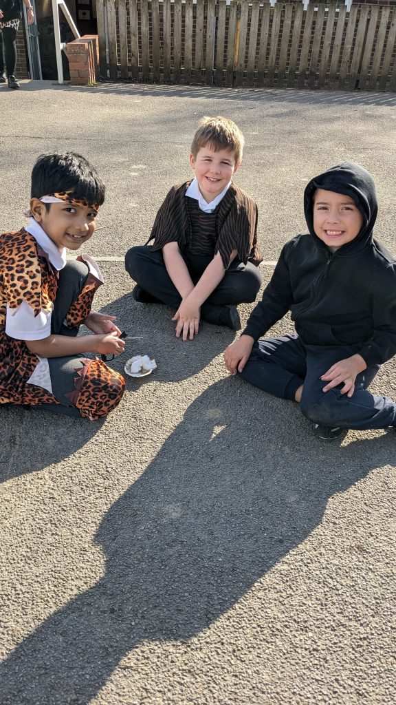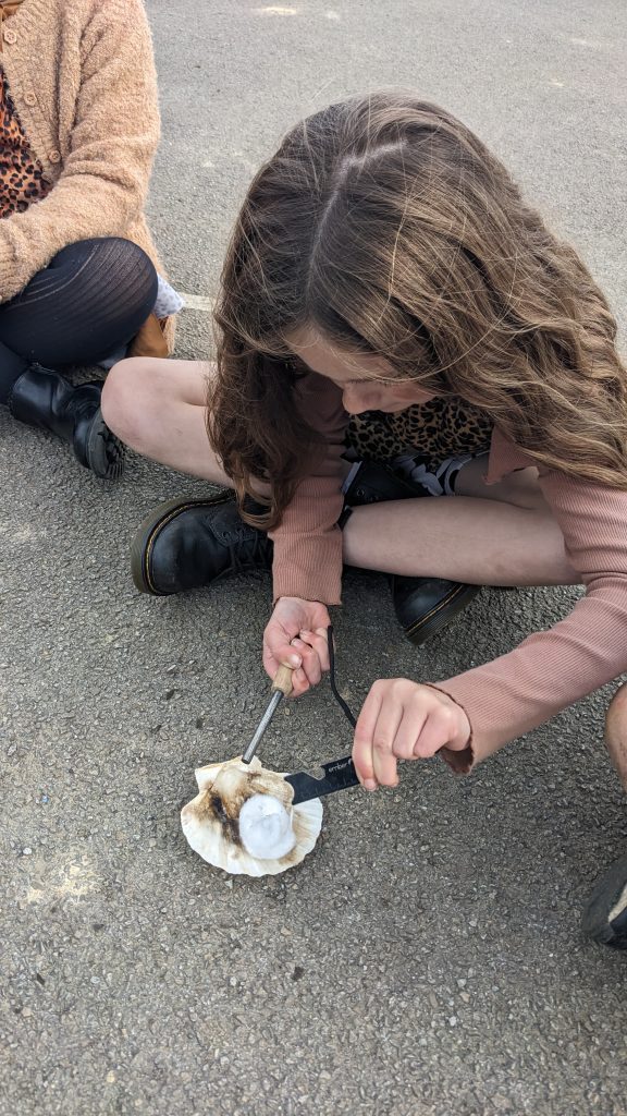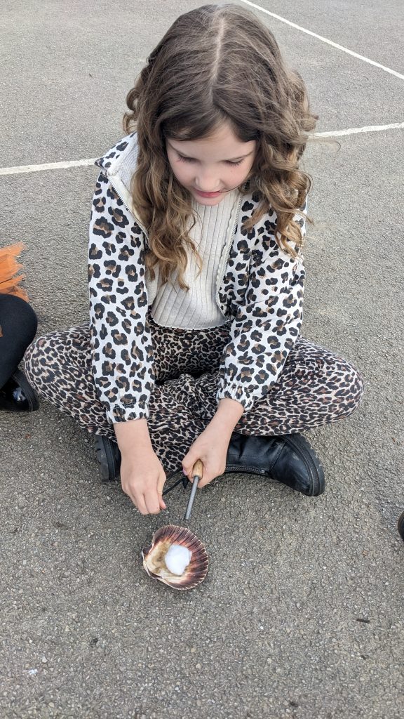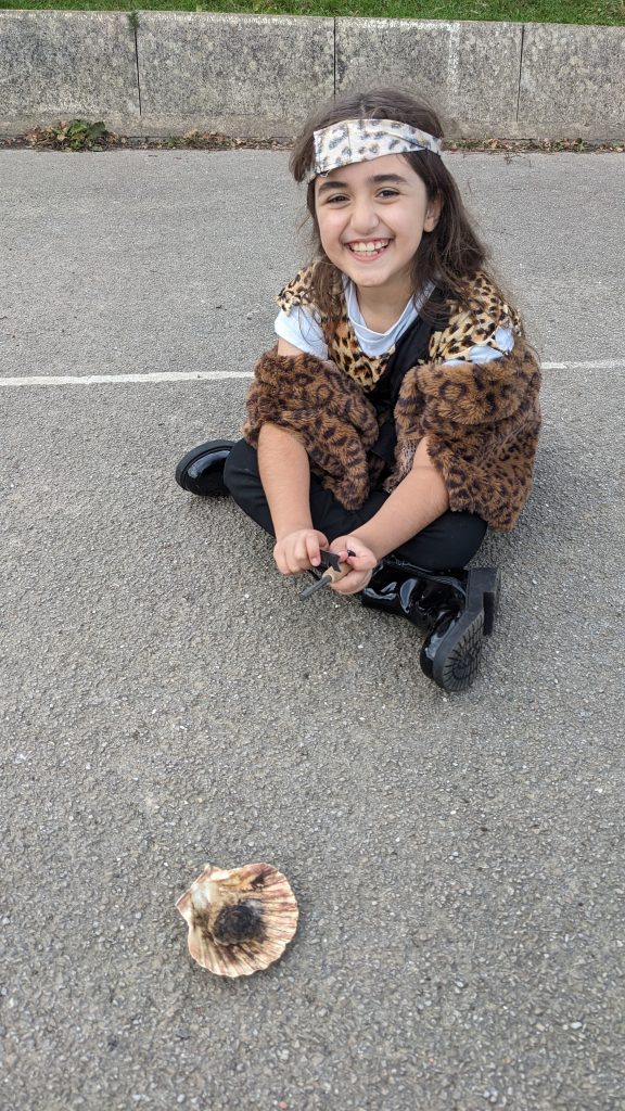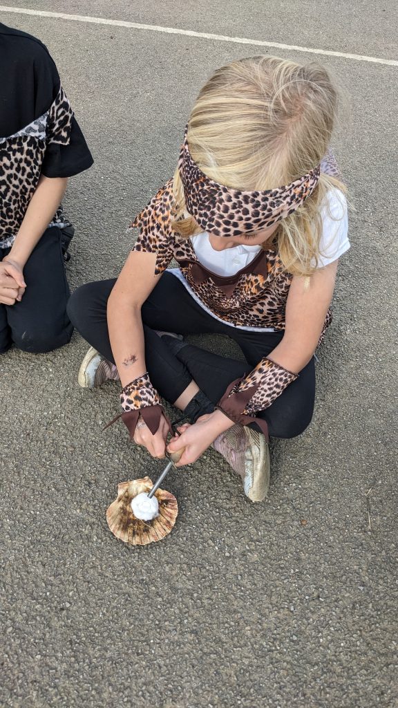 The afternoon was spent outside, where children learned more about the significance of fire, including how it was made and its purpose. After examining various pieces of flint and discussing their carving techniques, they went outside to try their hand at it. Using a shell, cotton balls, and a flint and steel tool, children worked in groups, taking turns to make a fire. Given the dry conditions and breeze, the children were surprised by the impact and their ability to make a fire. They thought that it would be simple! This led to some brilliant discussions on the difficulty of building a fire and keeping it going, especially when this grew in size for different reasons, including keeping a large group warm and cooking. We were very impressed with the children’s perseverance. We managed to make some fires!