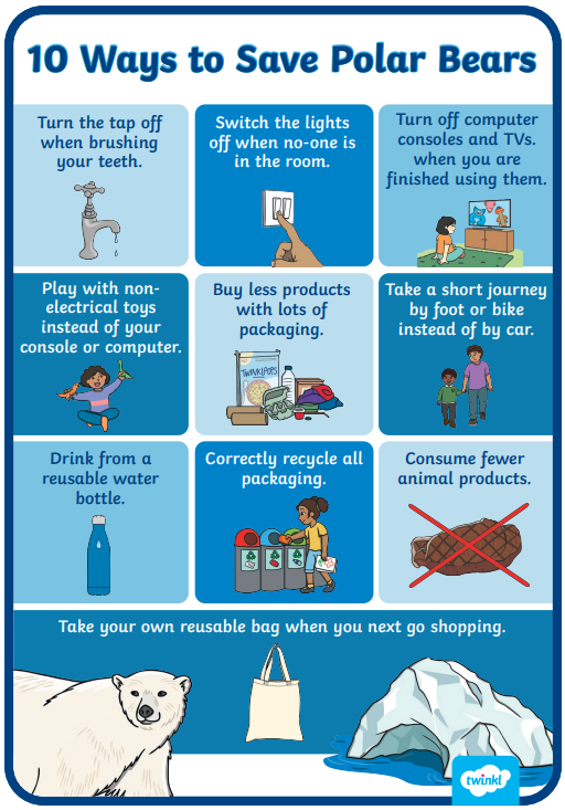 In geography, we talked about global warming. The world is getting warmer due to pollution and the ice in the Arctic is melting. This is bad news for polar bears because their home is getting smaller and there are fewer places for them to hunt for food. Polar bears are an endangered species. What can we do to help save the polar bears?