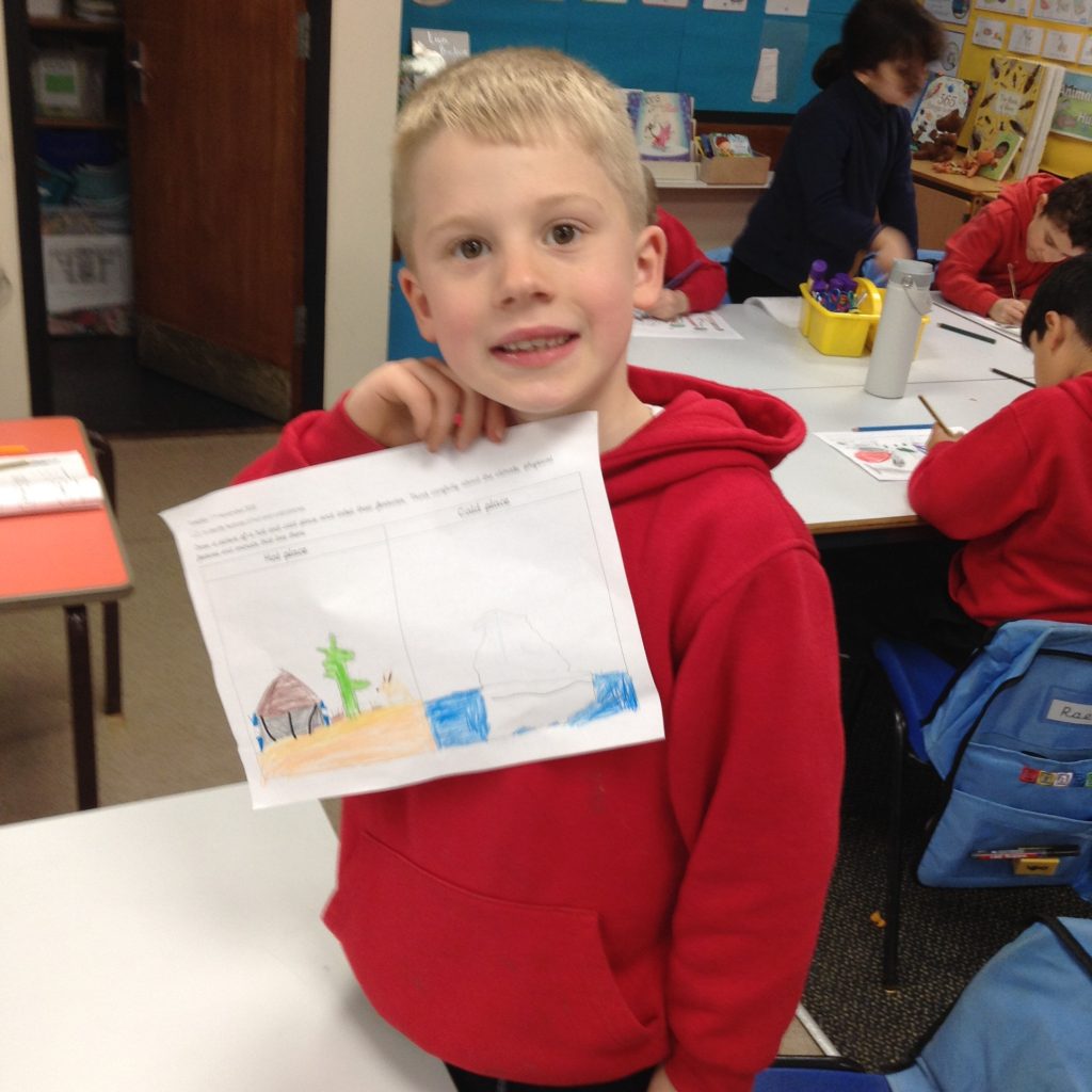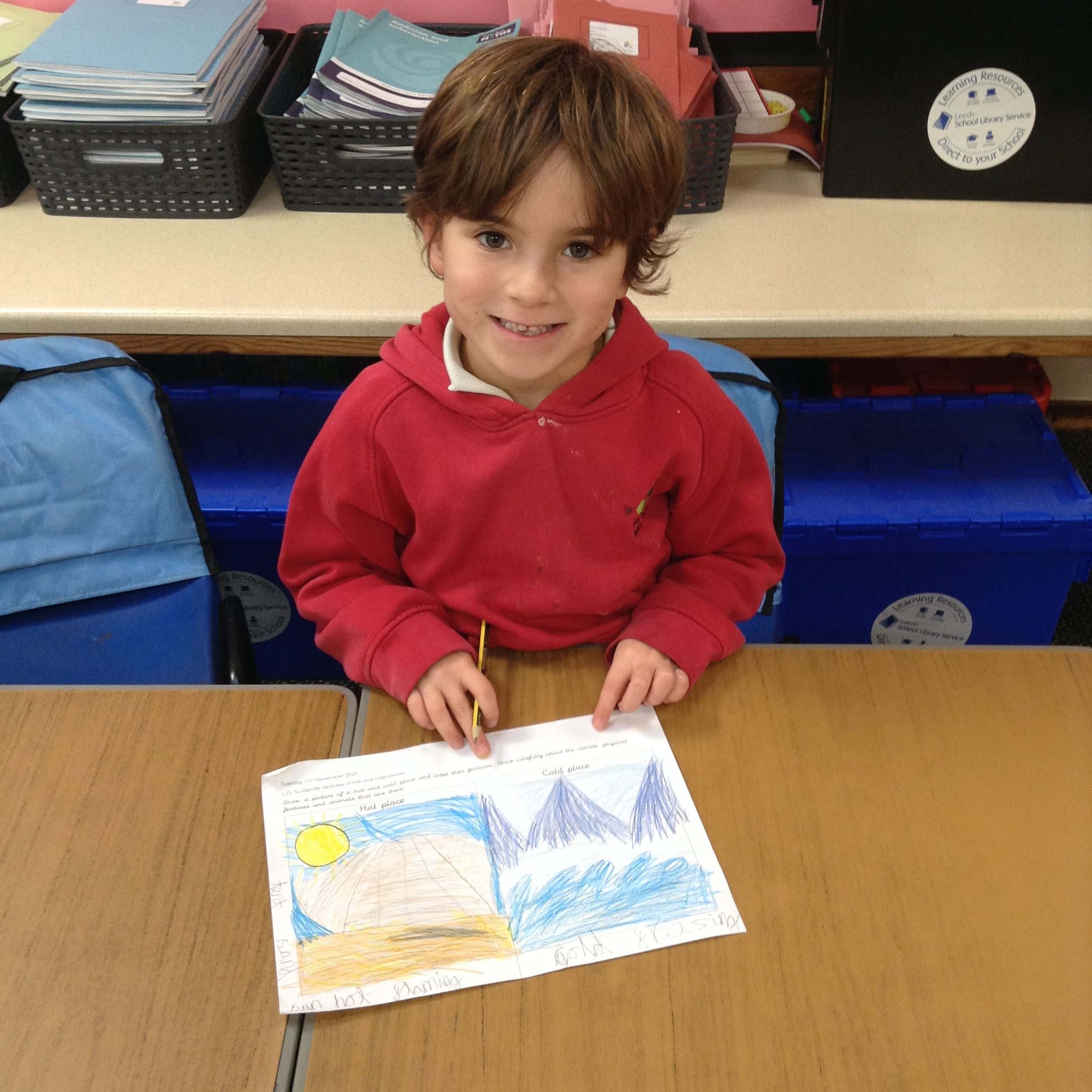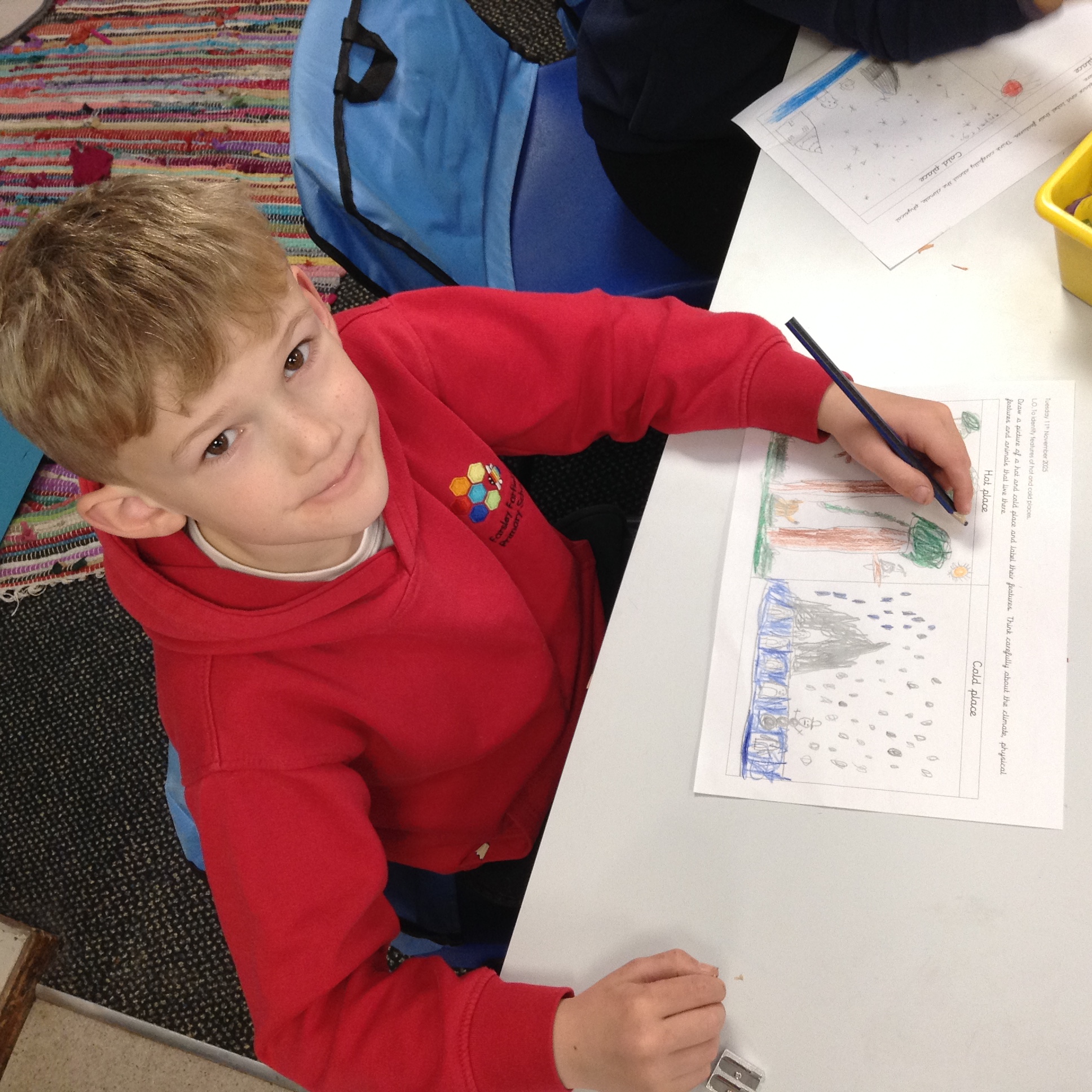 We have enjoyed locating hot and cold places on maps and globes again this week. After looking at photographs of Antarctica, hot deserts and rainforests, children drew a hot place and a cold place and labelled their features.