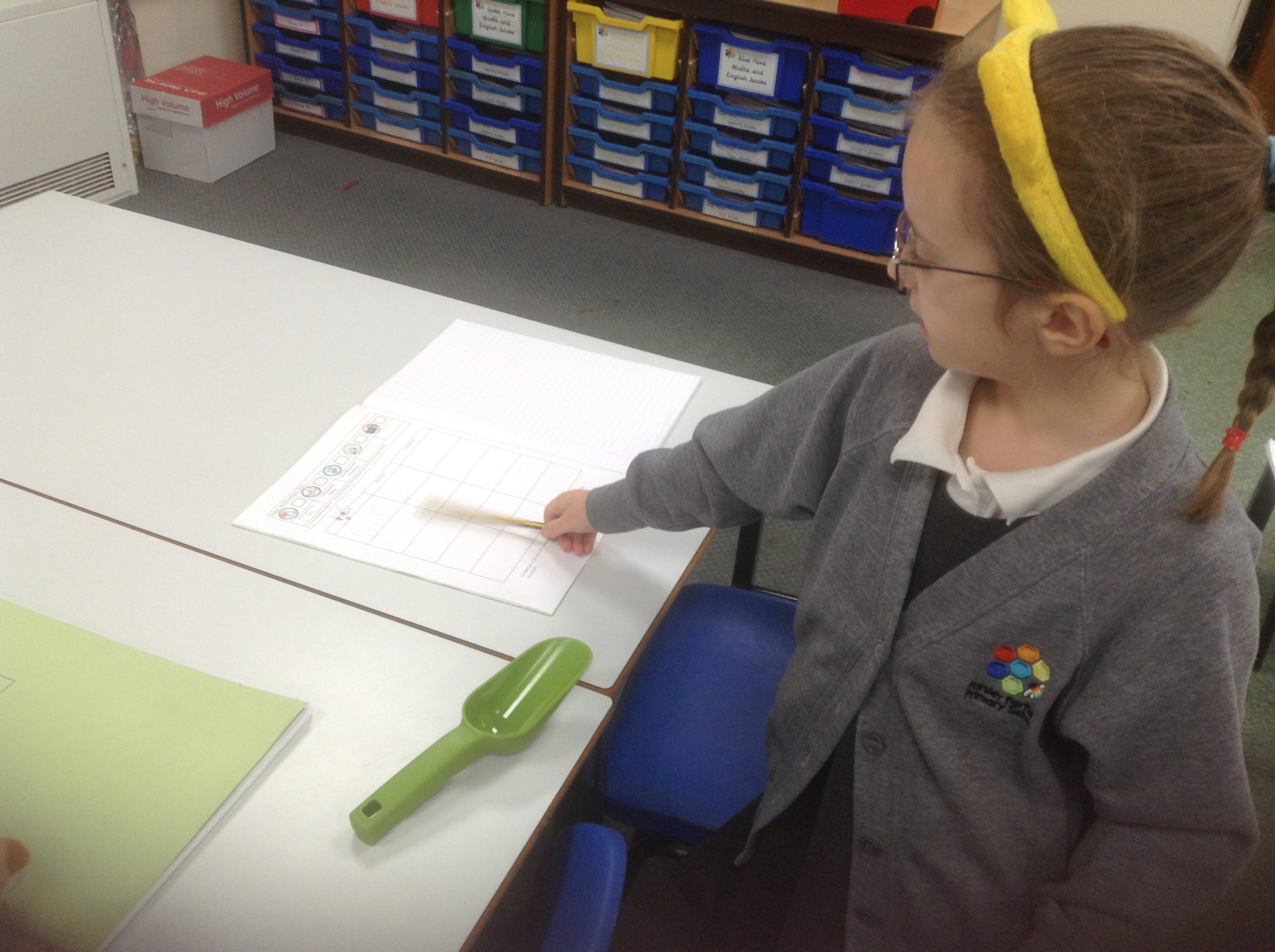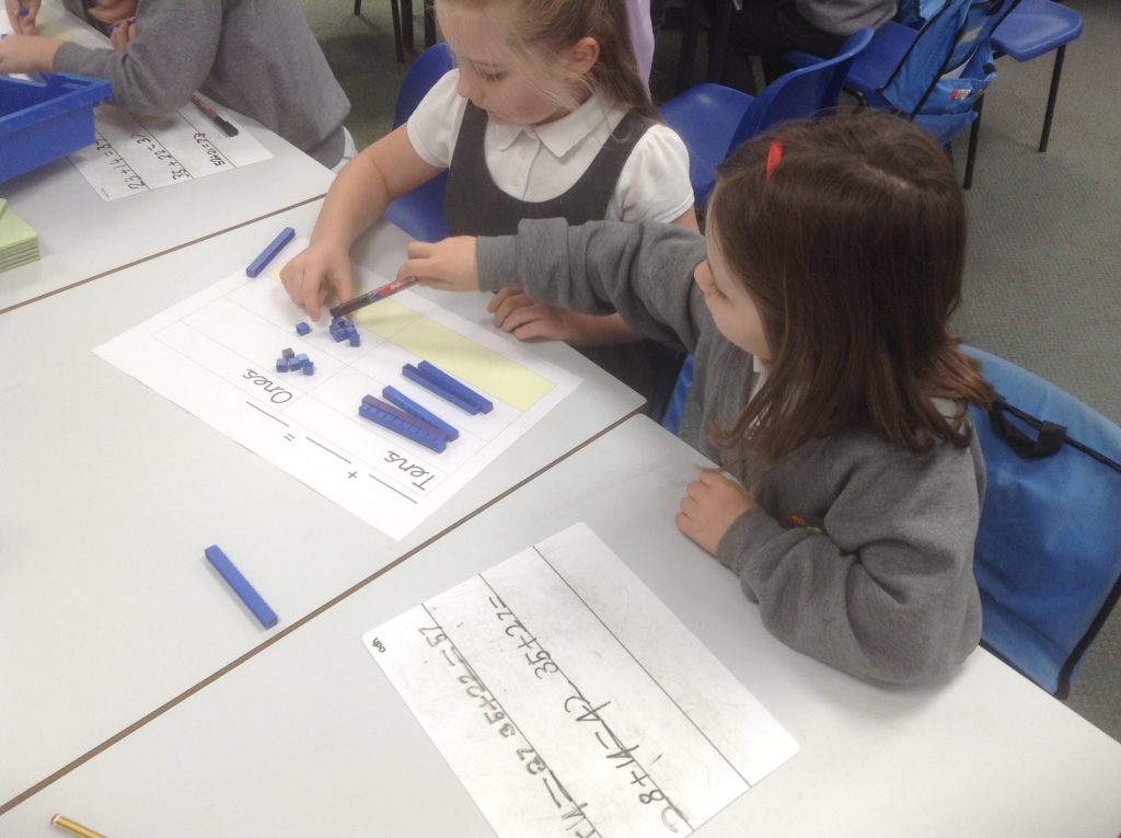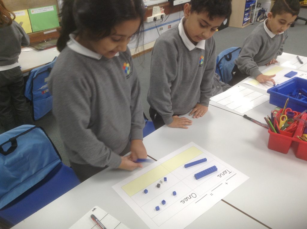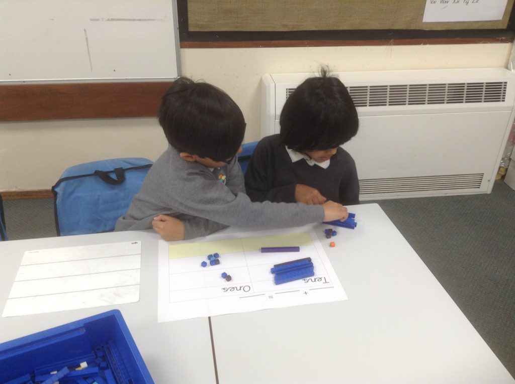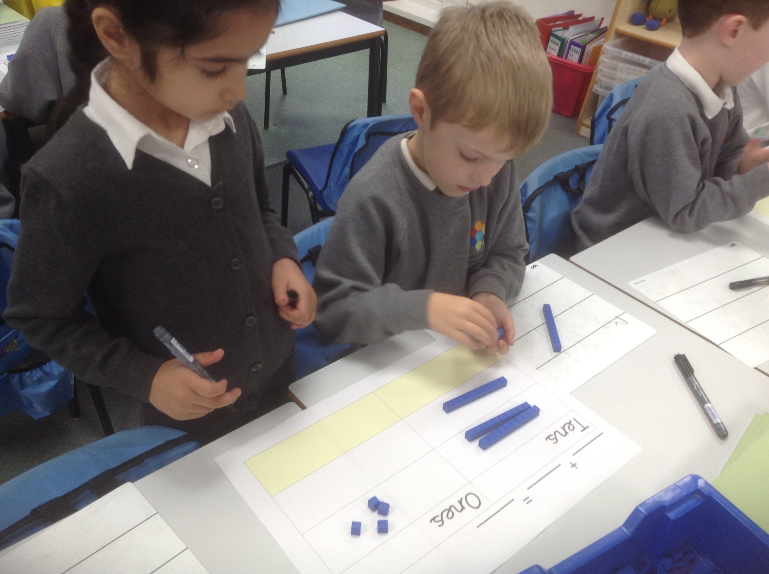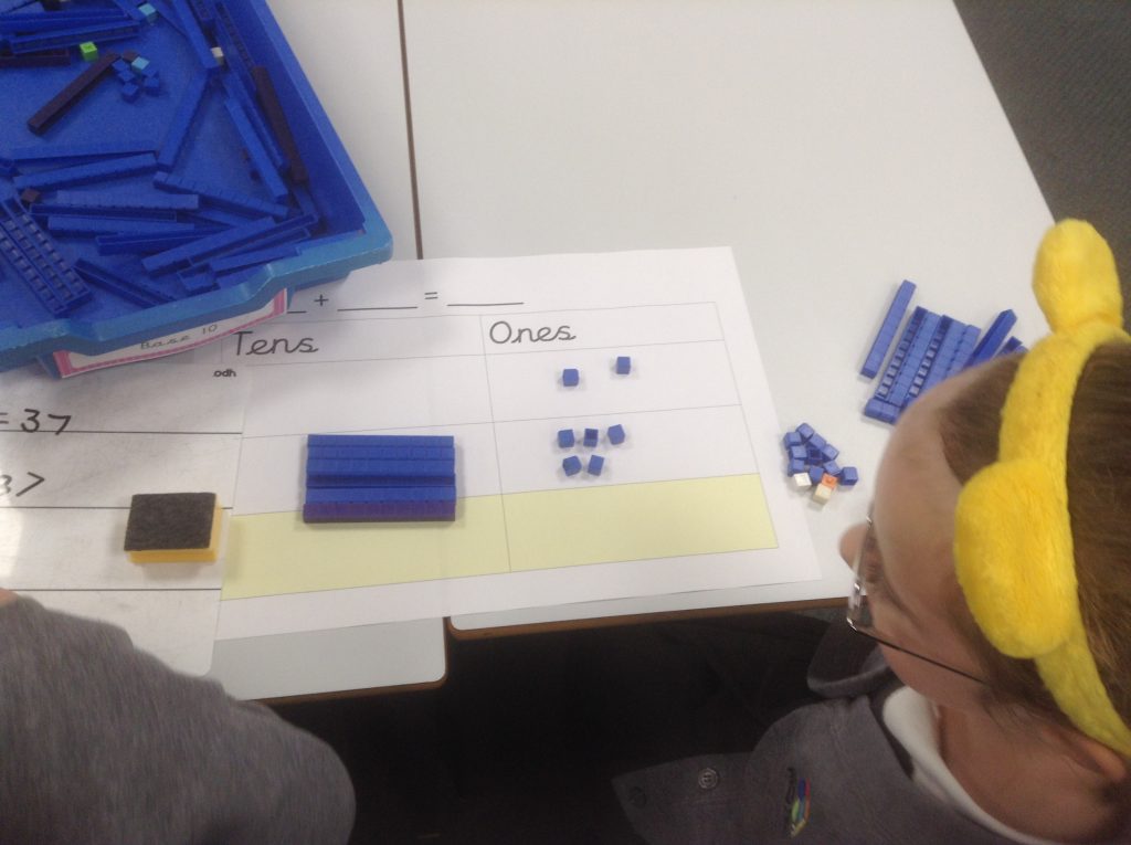 In maths we have been developing our addition skills through adding tens and ones. Here we are using tens and ones on place value grids.