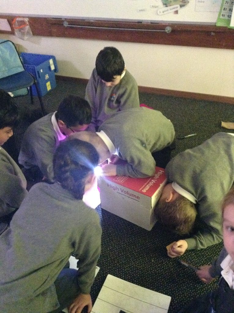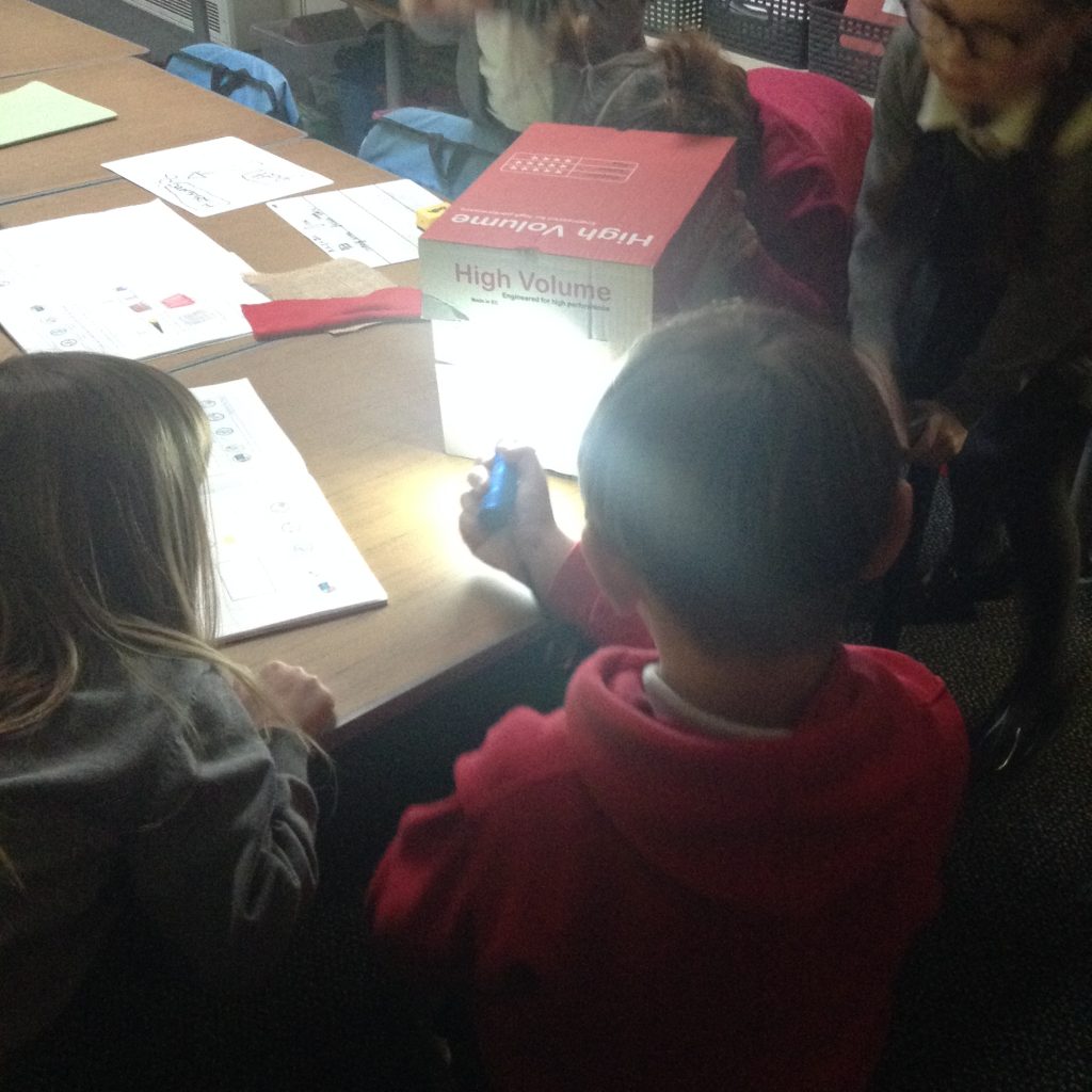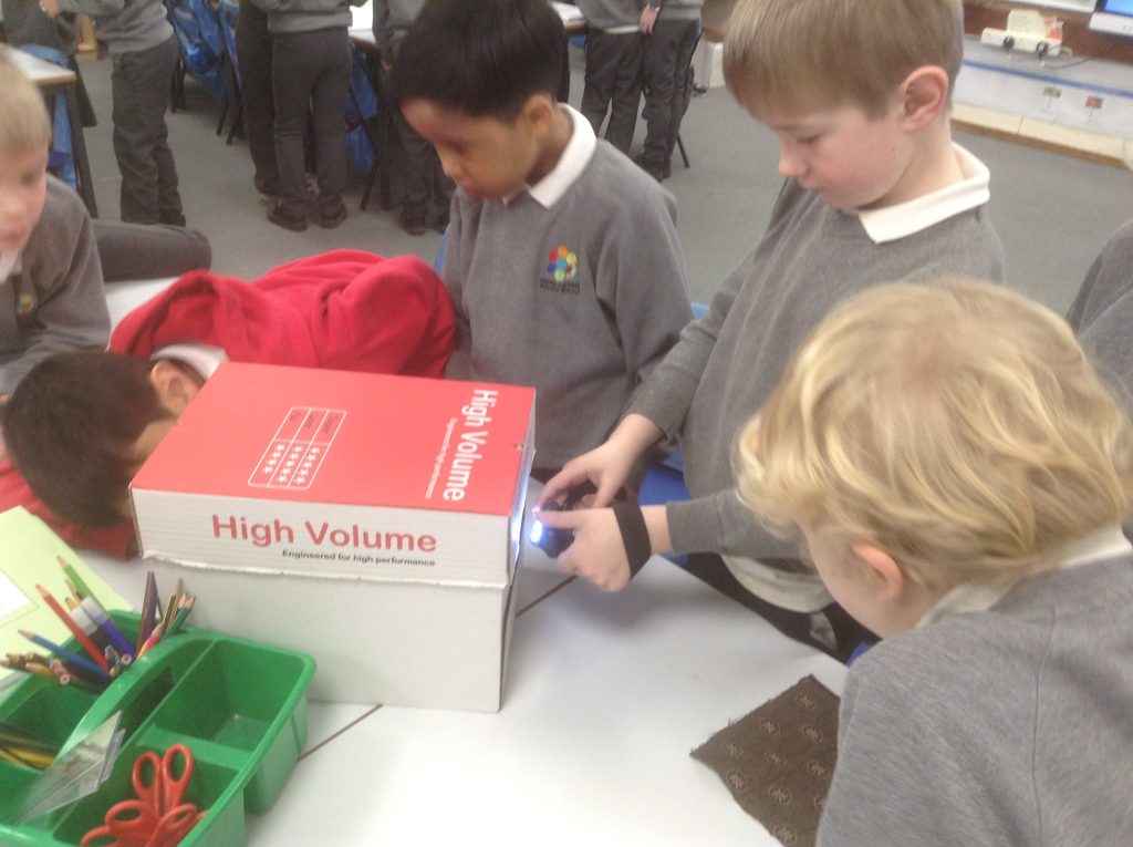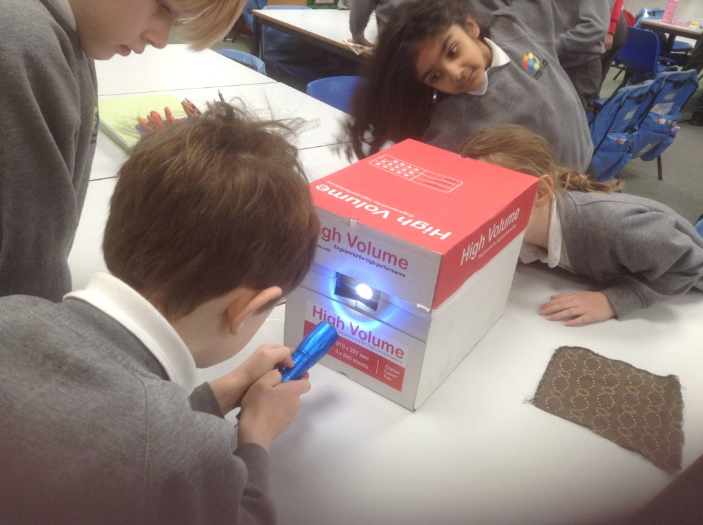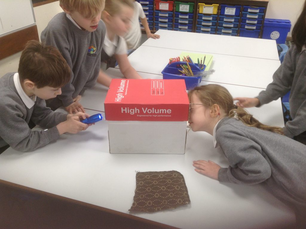 In science we have been investigating which fabrics let through the least amount of light. Children set up their investigation using a bog, torch and fabrics.