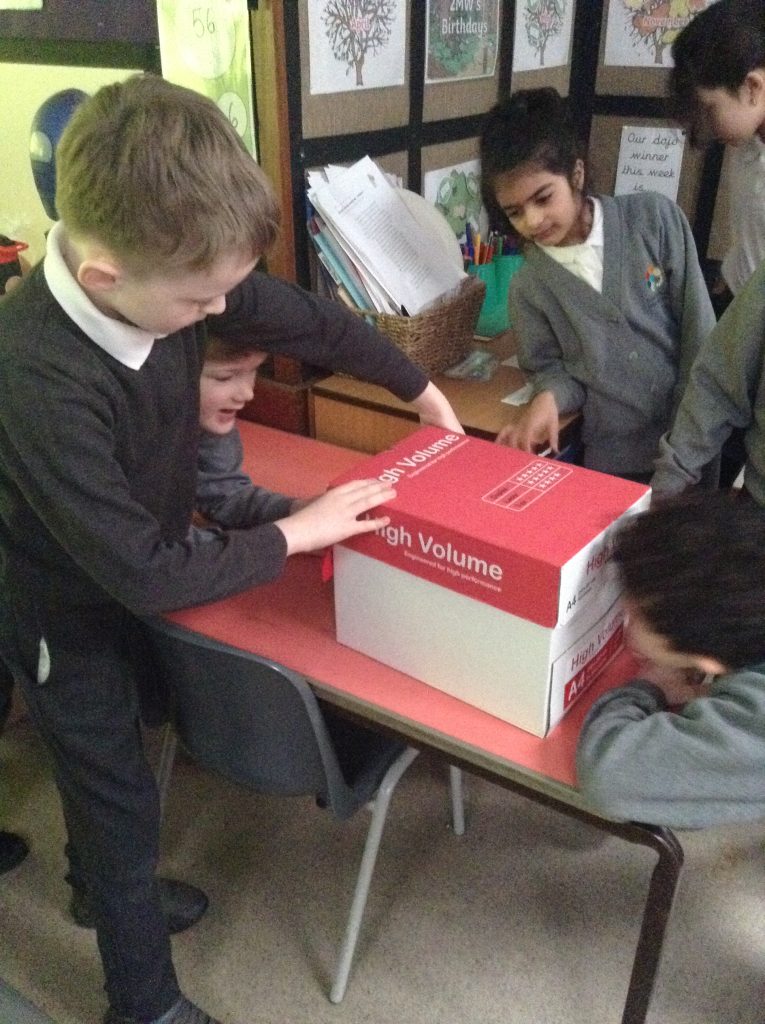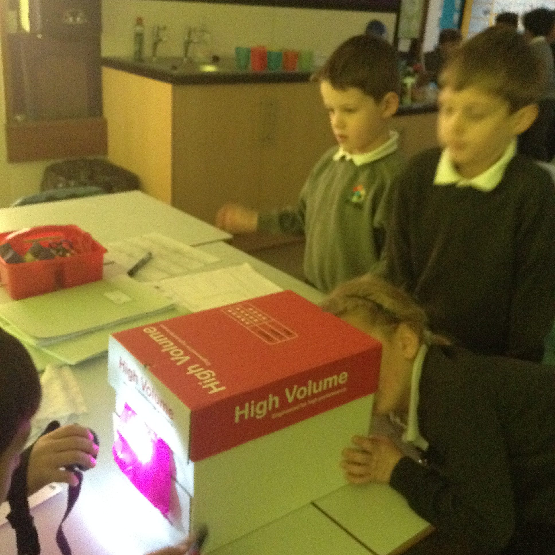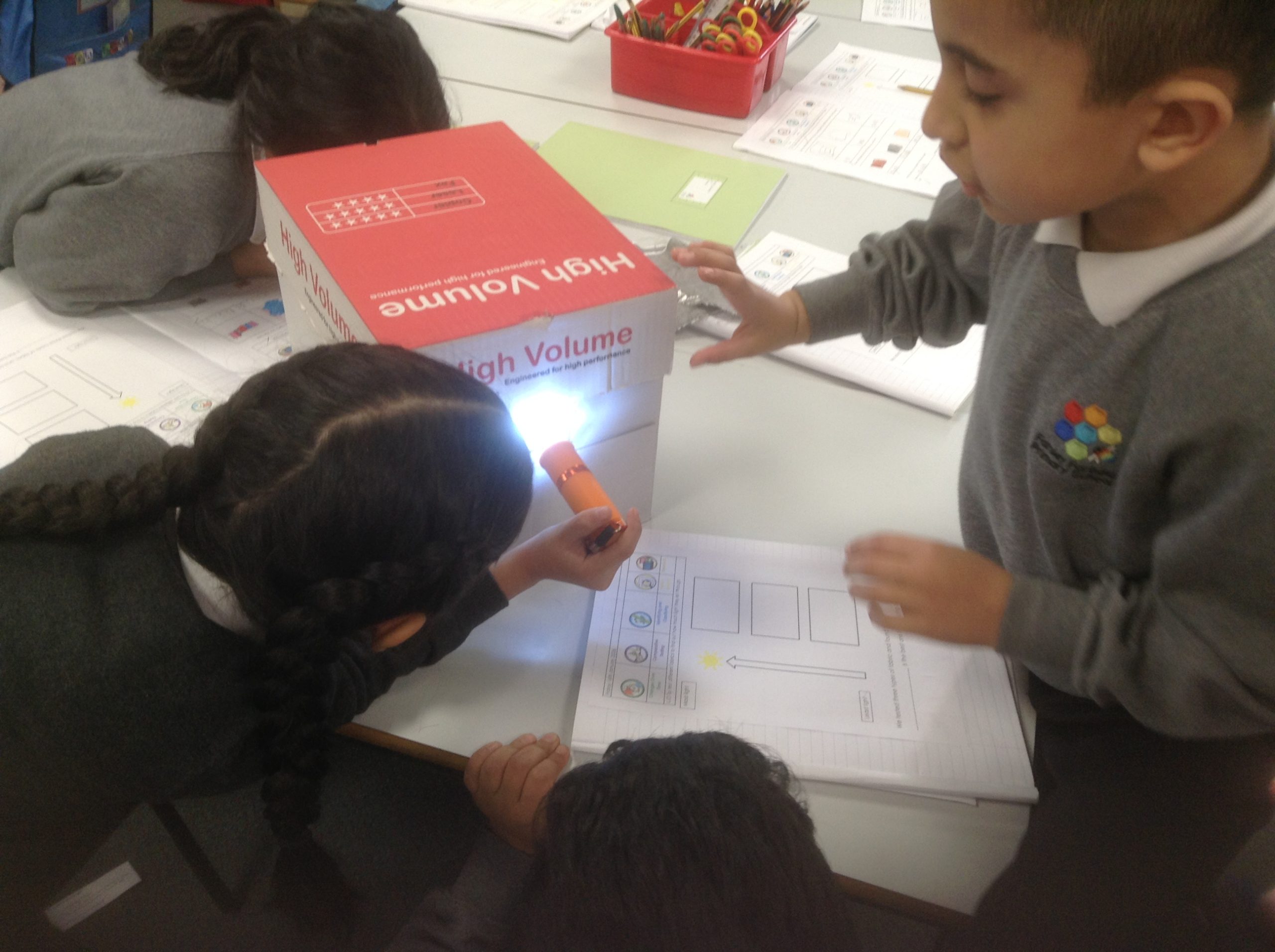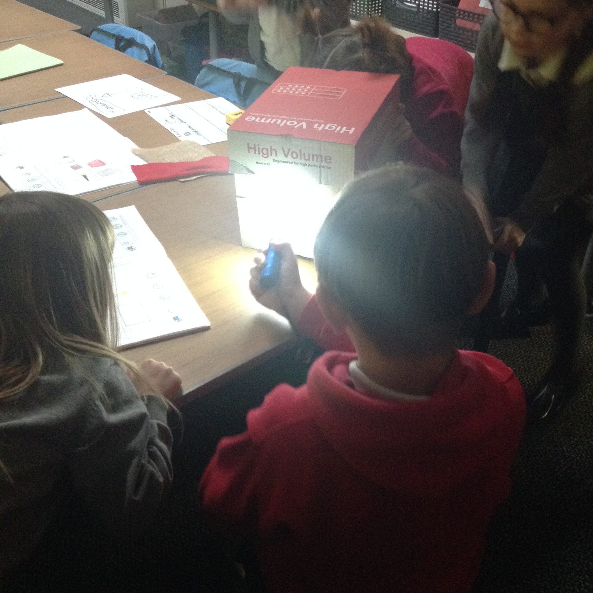 In science we have been investigating which fabrics let through the least amount of light. Children set up their investigation using a bog, torch and fabrics.