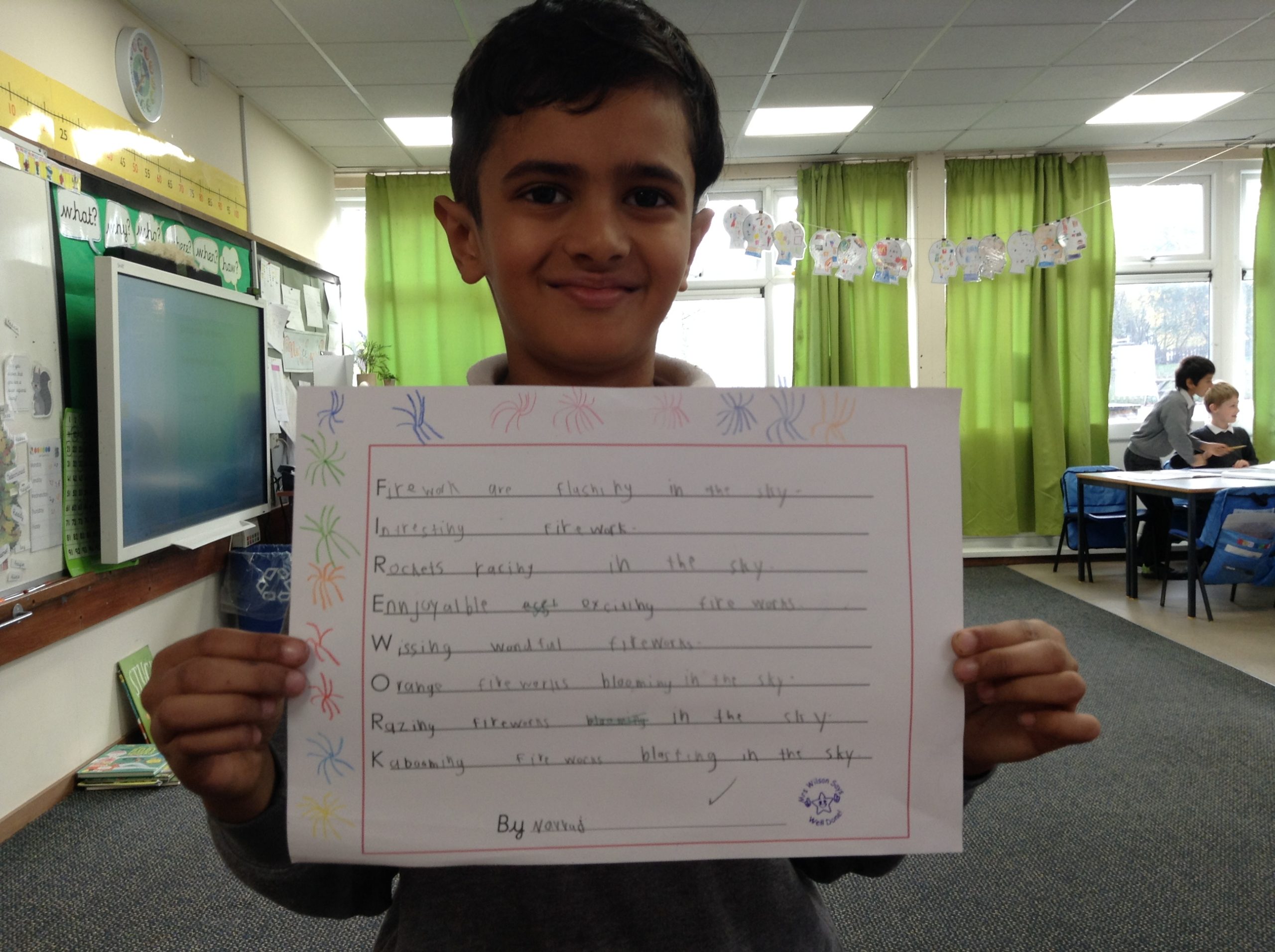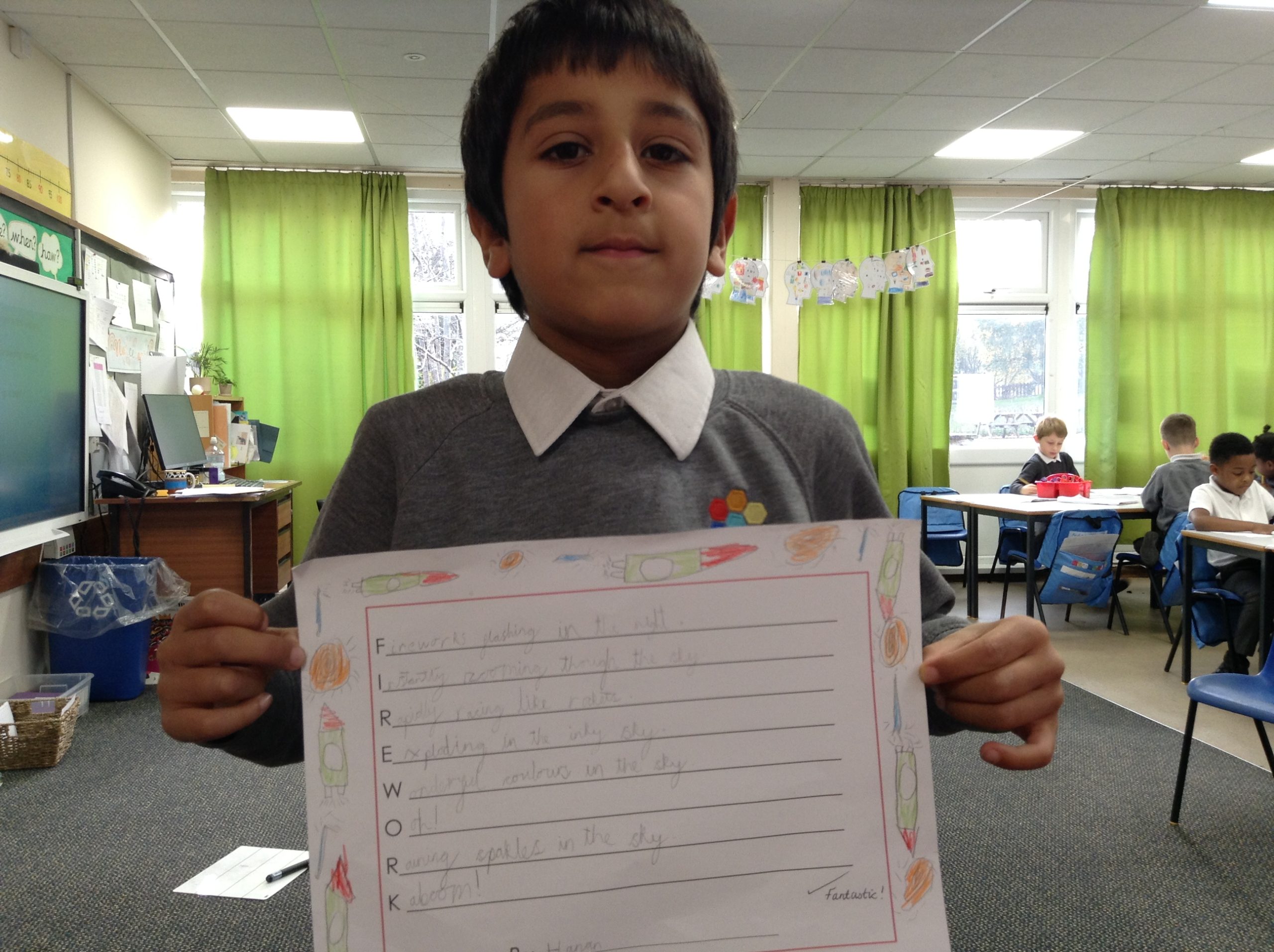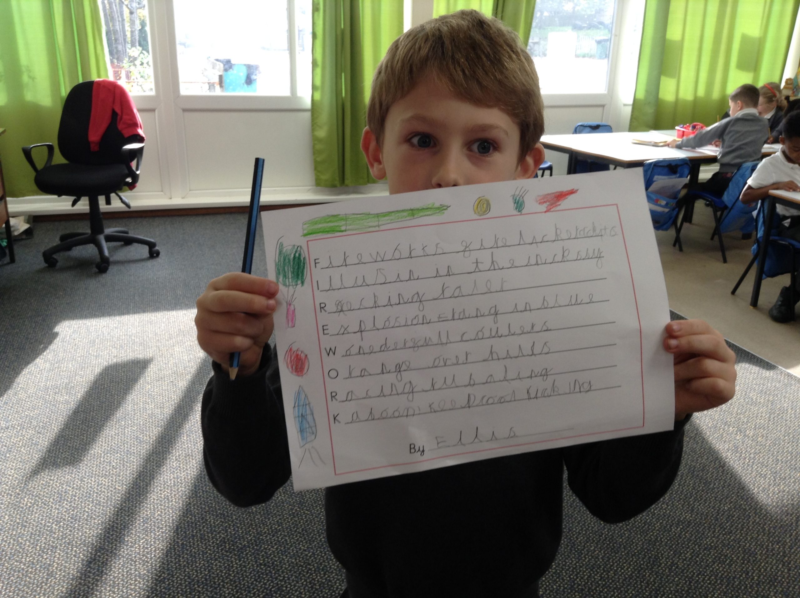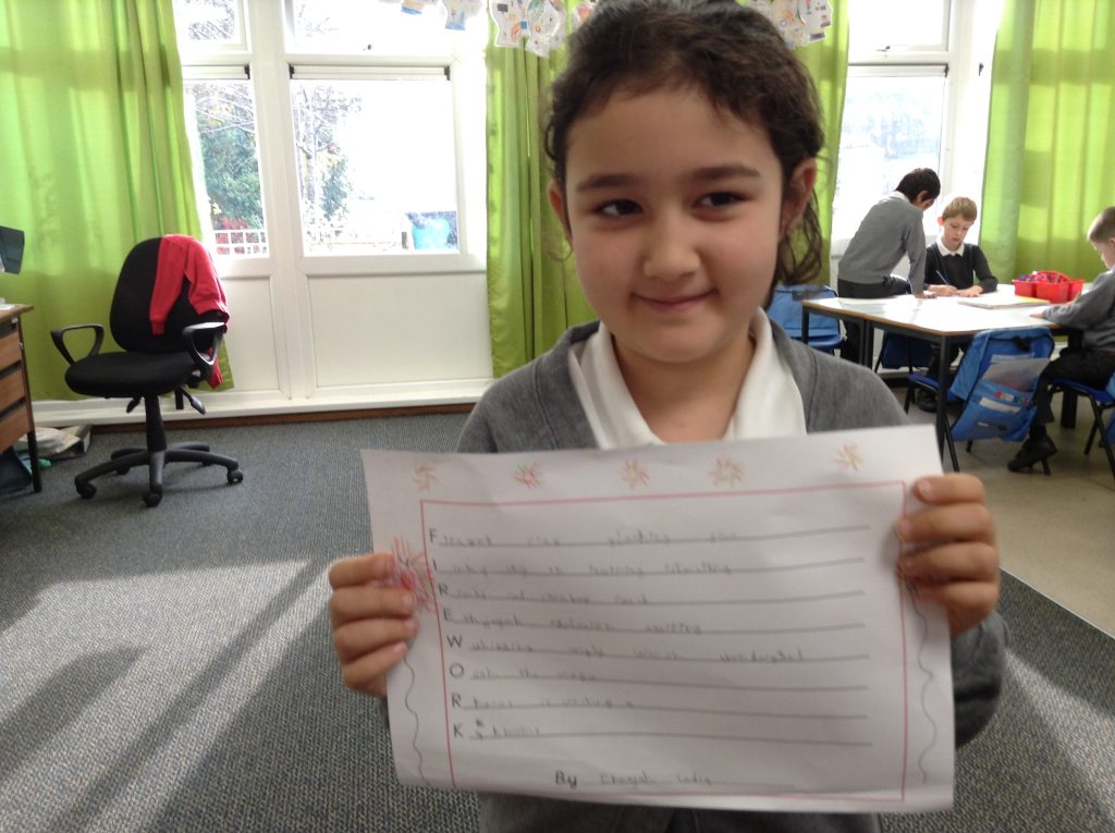 This week we have been reading and writing poetry about fireworks. We collected words and phrases and discussed features such as alliteration and rhyme. Finally we created our own acrostic poems. The finished poems were fantastic!