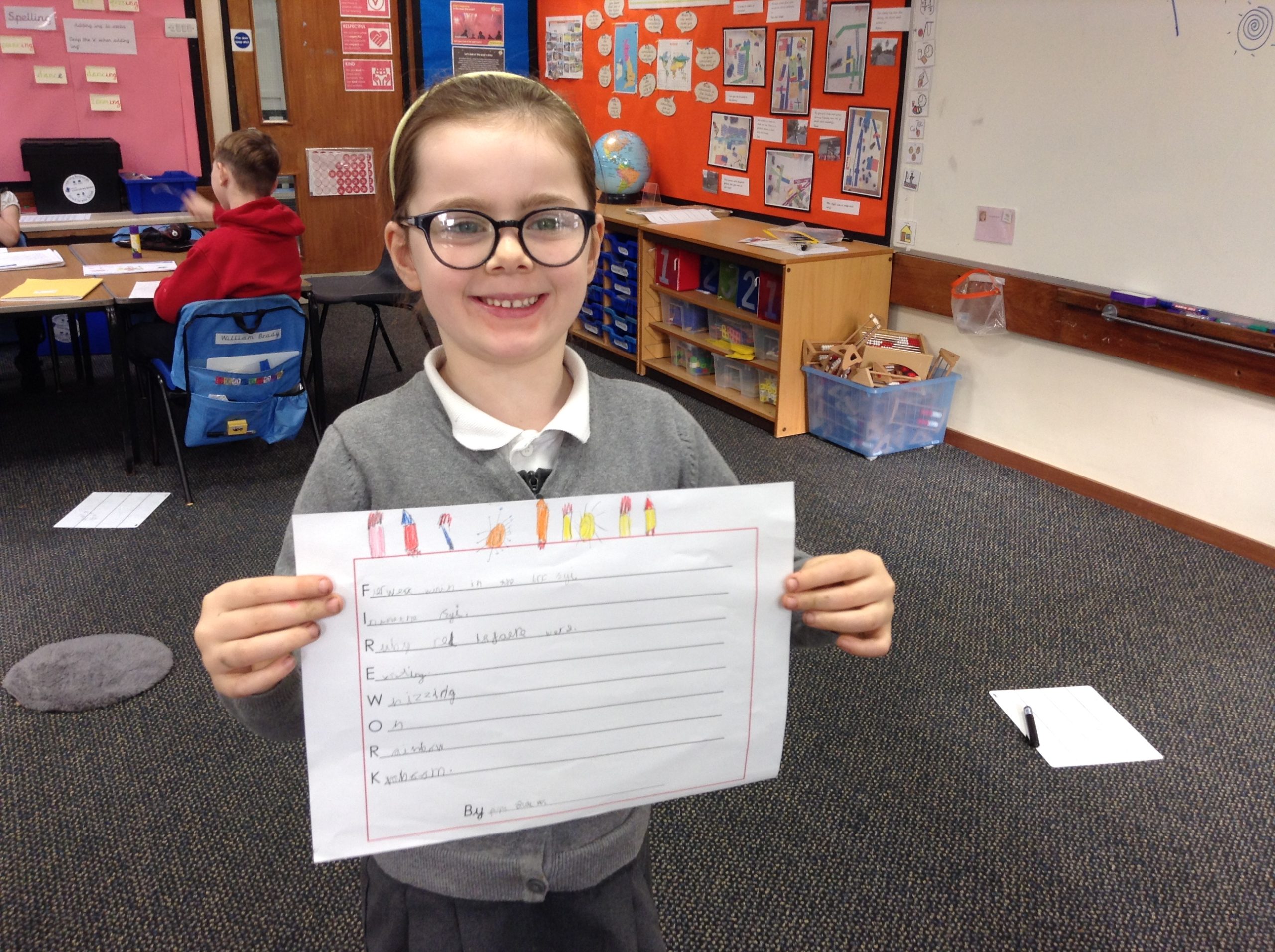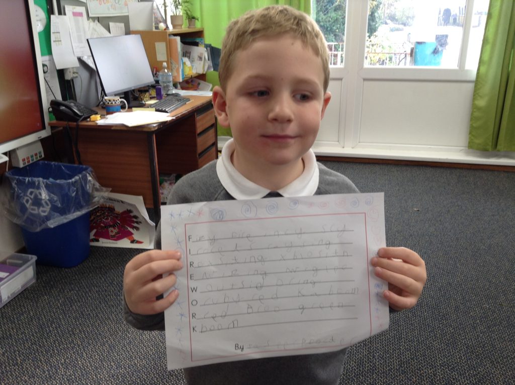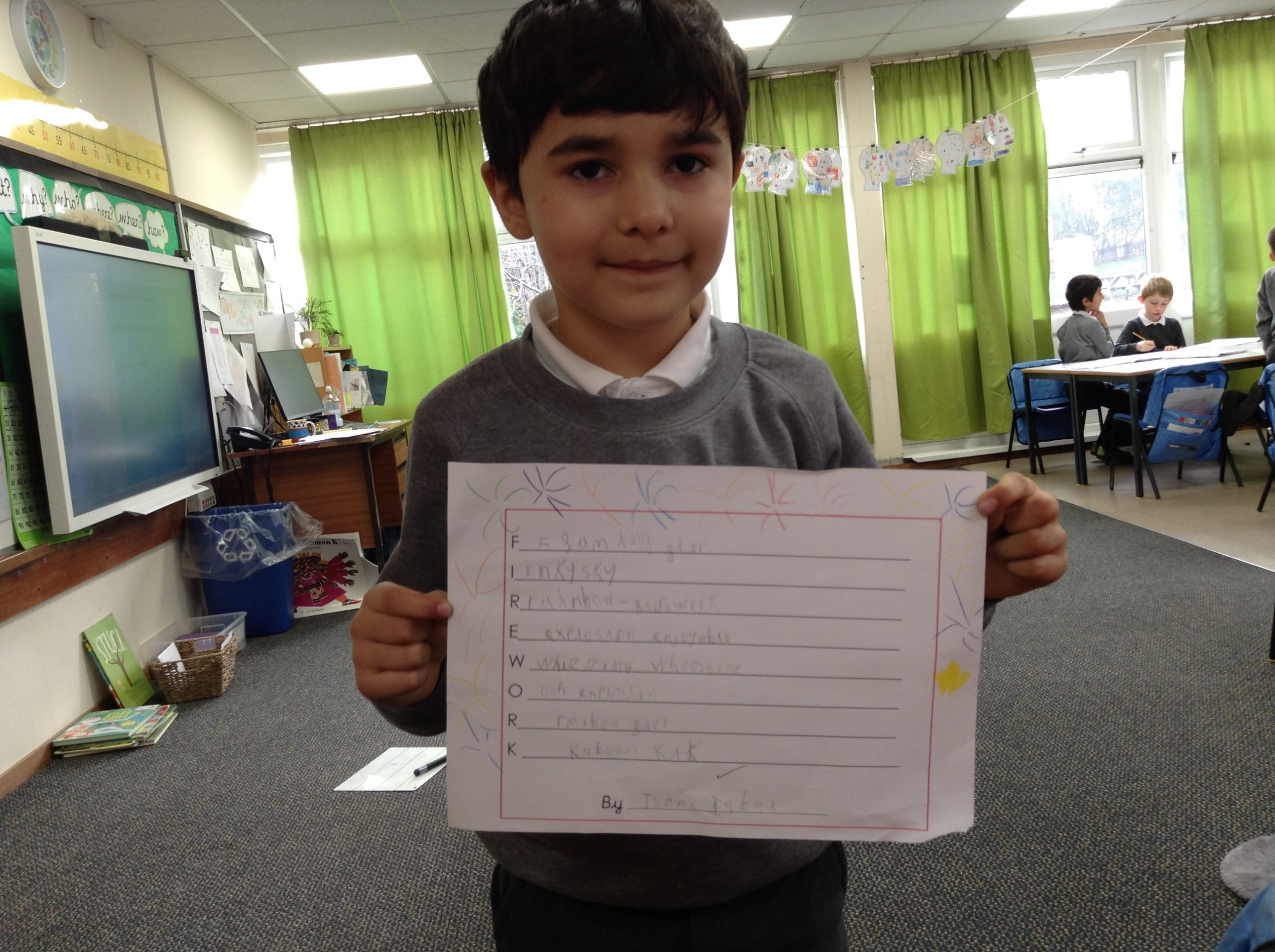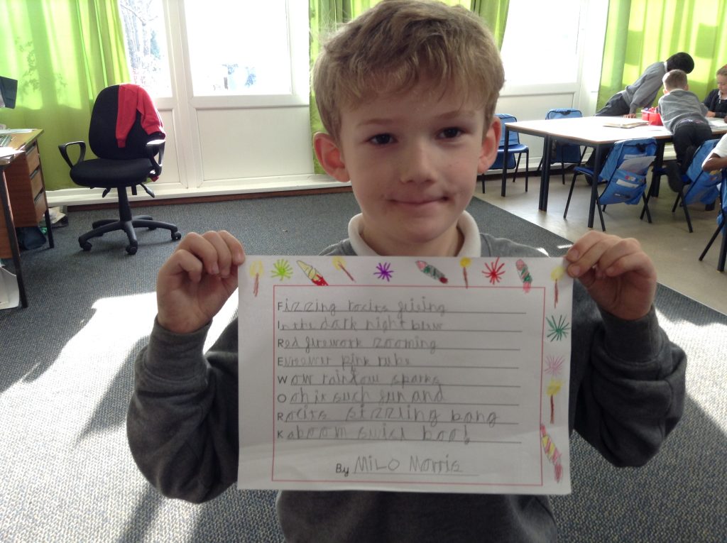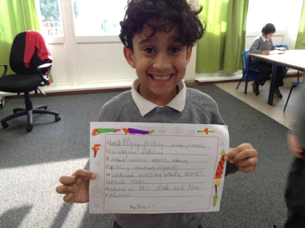 This week we have been reading and writing poetry about fireworks. We collected words and phrases and discussed features such as alliteration and rhyme. Finally we created our own acrostic poems. The finished poems were fantastic!